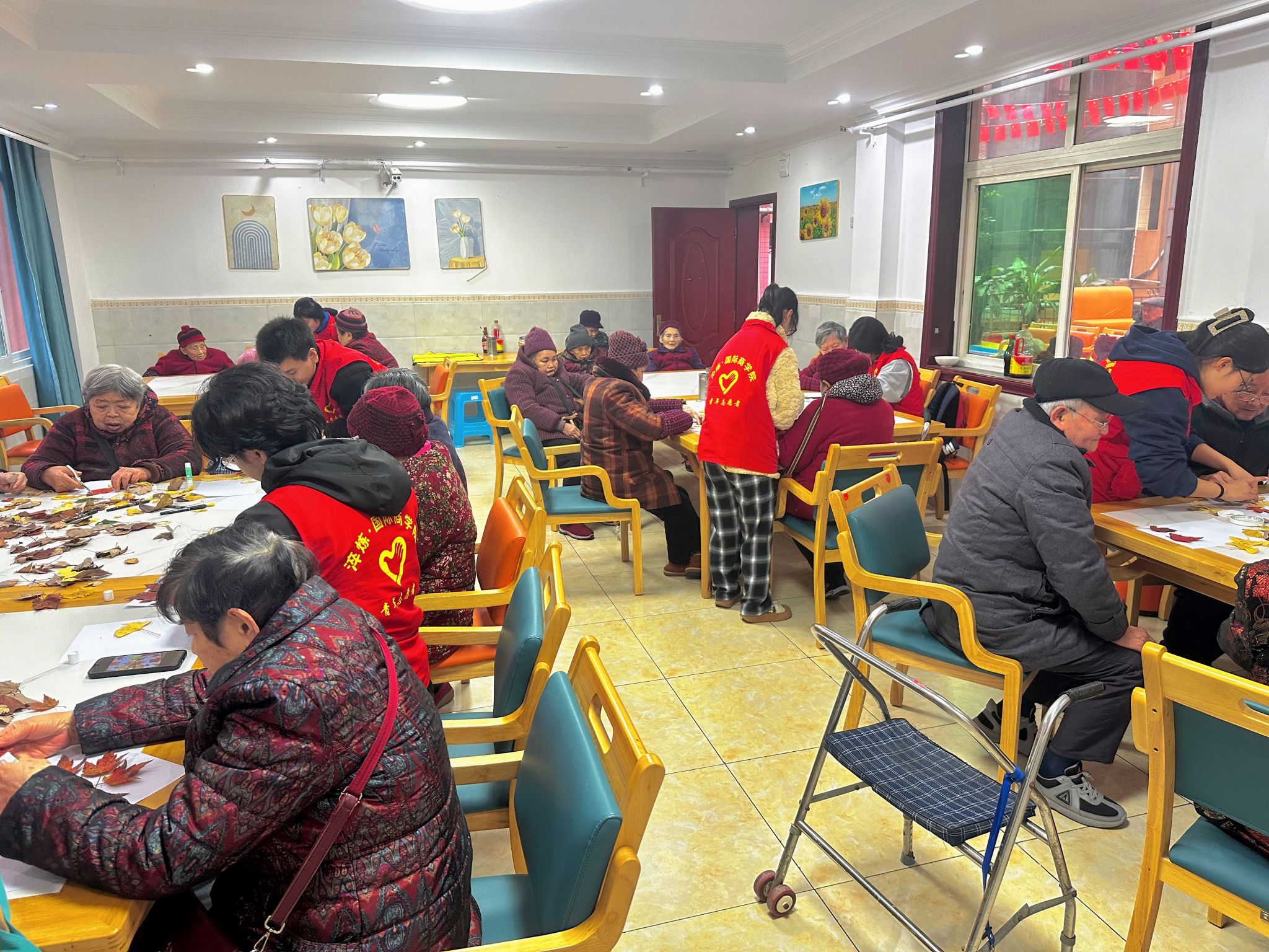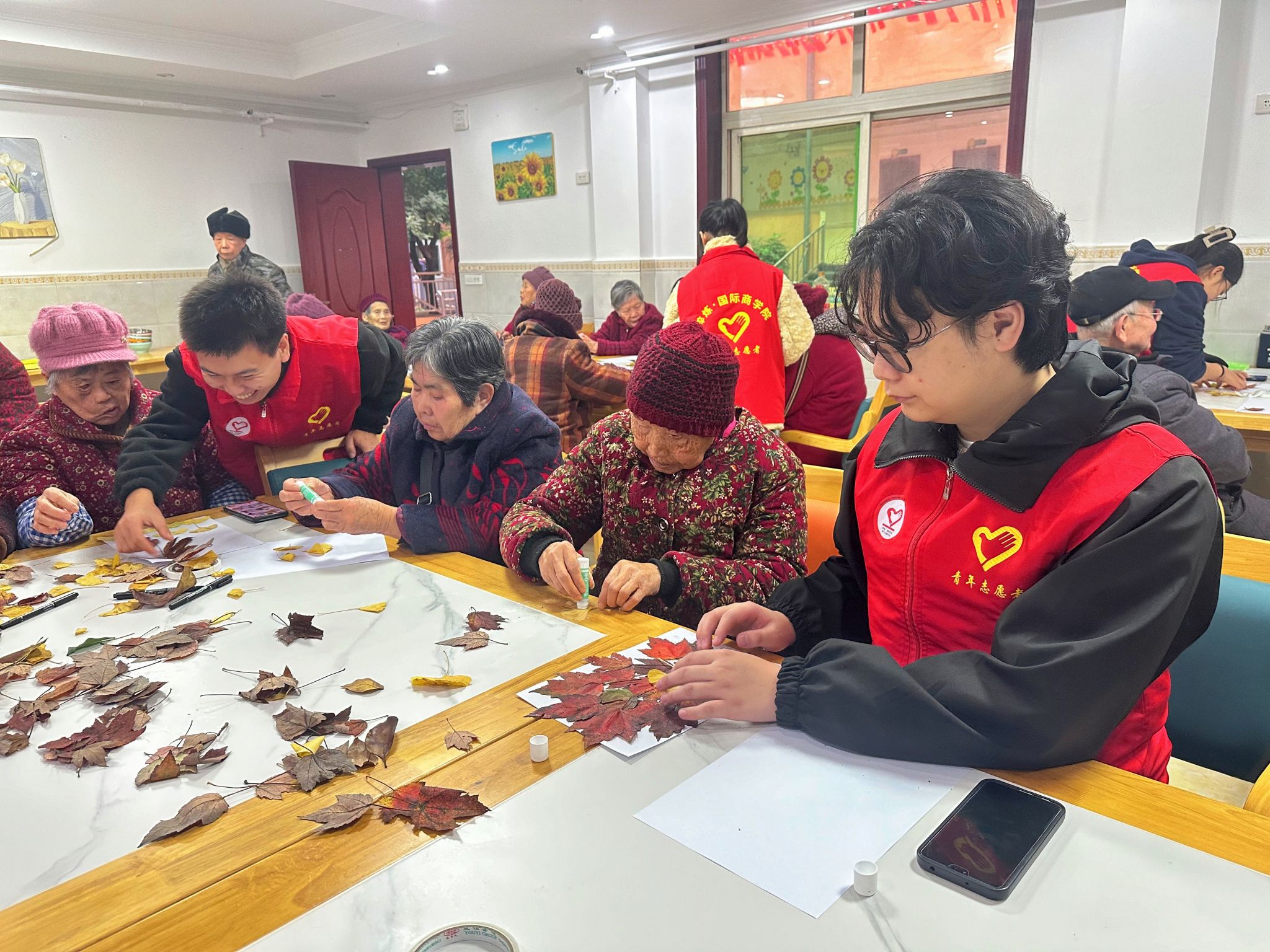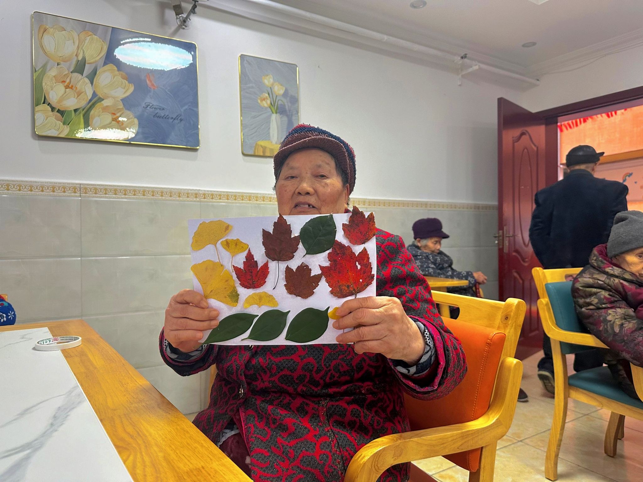 在寒意高涨的冬天里,为让老人们能感受到温暖。志愿者们特别组织了以落叶有画的活动,伴随着欢声笑语,老人们与志愿者有说有笑,一起进行落叶的画作。