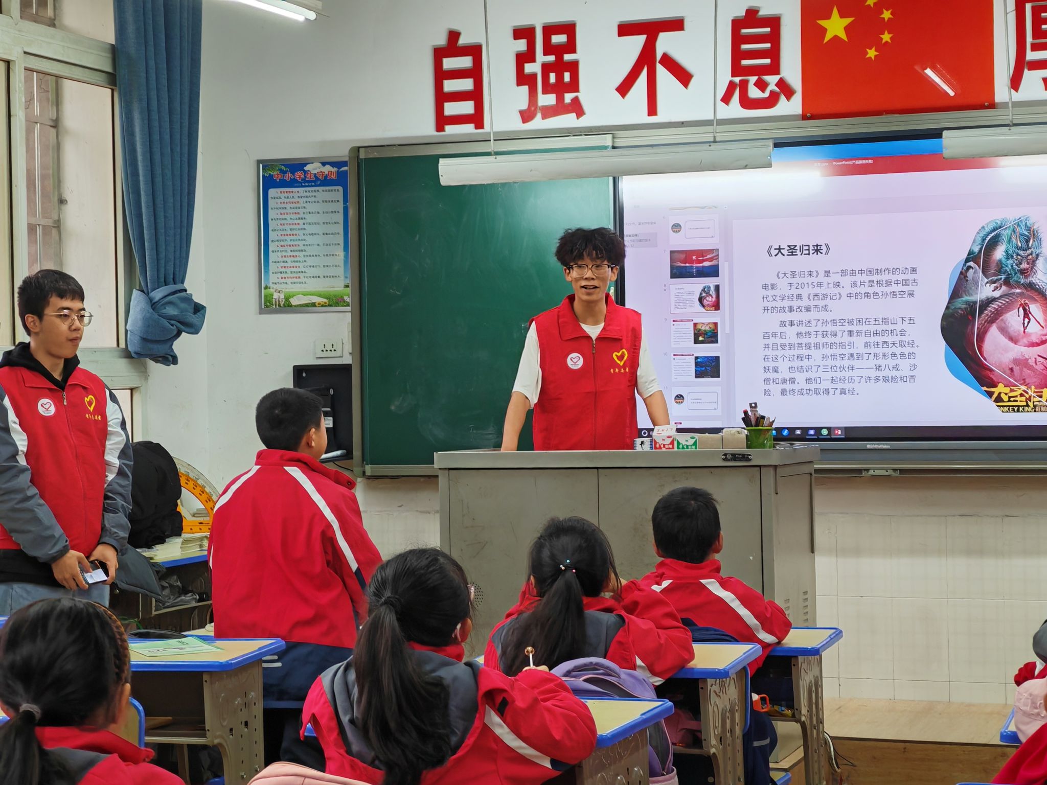 作为新时代的青年,应积极响应时代号召,传承和弘扬中华传统文化。中华传统文化作为中华民族的精神食粮,是涵养社会主义核心价值观的重要源泉,是中华民族最深厚的文化软实力。为了进一步加强孩子们对中华传统文化的理解,增强对传统文化的认同,2023年12月12日重庆移通淬炼商学院青年志愿者协会“七彩筑梦·完满绽放”关爱儿童志愿服务专项支队(綦江校区)携手电影评论中心在重庆市綦江区登瀛小学开展了“电影与文化”电影美育活动。