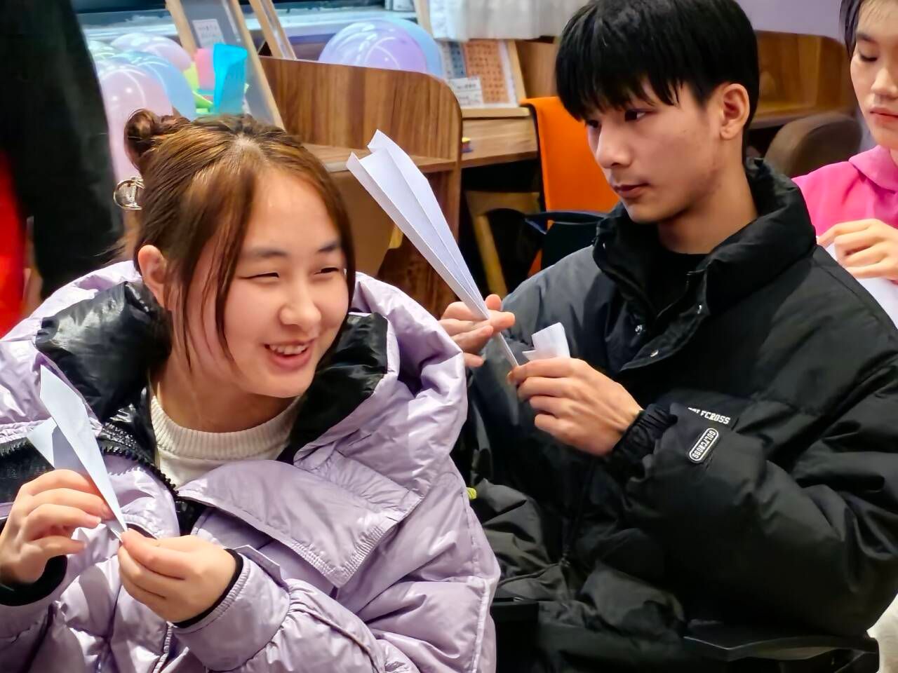 同学们在素白的纸上,倾诉对未来的憧憬与期盼,或书写那些心中的小小困扰。他们将纸折成纸飞机,一同向远方释放。这一刻,寓意着“释放自我,探索无限可能”。希望同学们通过放飞”烦恼”的形式,放下沉重的情绪包袱,以轻盈的心态迎接生活的挑战。本次活动,以情绪交换的方式,为压力寻找一个释放的出口,助同学们寻回内心的宁静与平和,调整心态,放松身心,提高学习效率,提升生活幸福感。