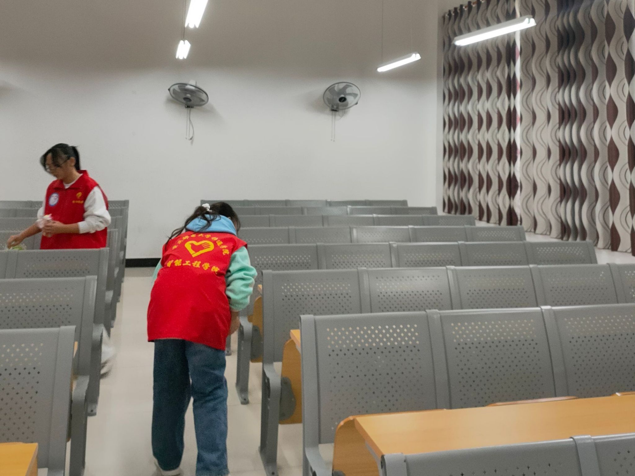 志愿者们在下午四点完成集合,各成员在穿戴整齐红马甲后,前往不同的书院进行志愿活动。在志愿活动期间,志愿者先是观察各教室是否有老师同学在上课或者自习,在不打扰的情况下才进入教室进行清洁工作,对教室的地面、课桌以及教室的黑板进行打扫,又将教室中的桌椅摆放整齐,电灯、电脑等电器熄灭后离开。整个过程中志愿者都保持安静,给书院中的老师们和同学们保持了安静及干净的环境。