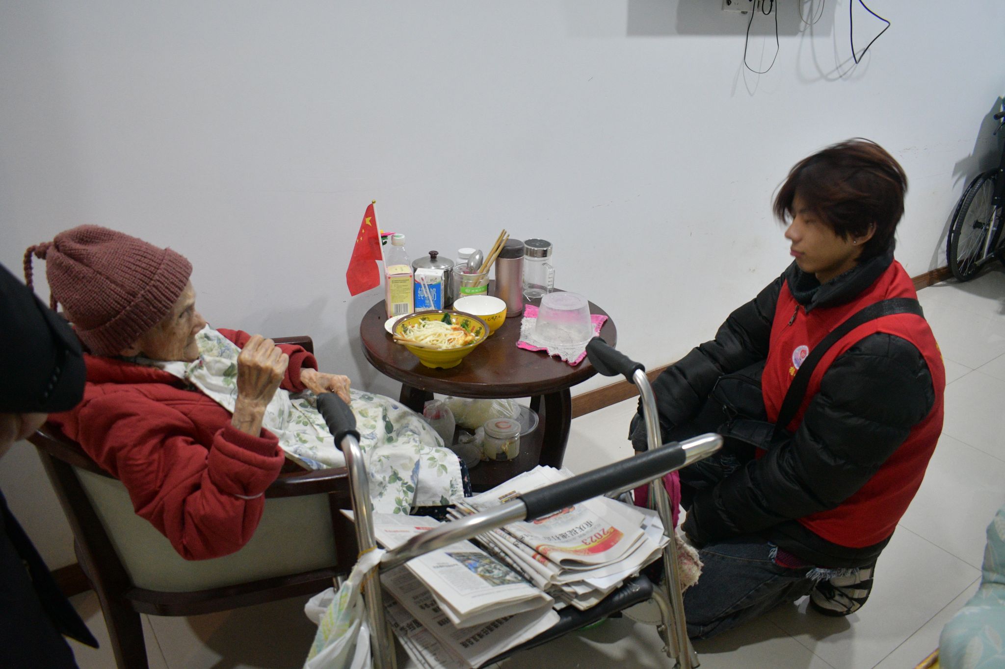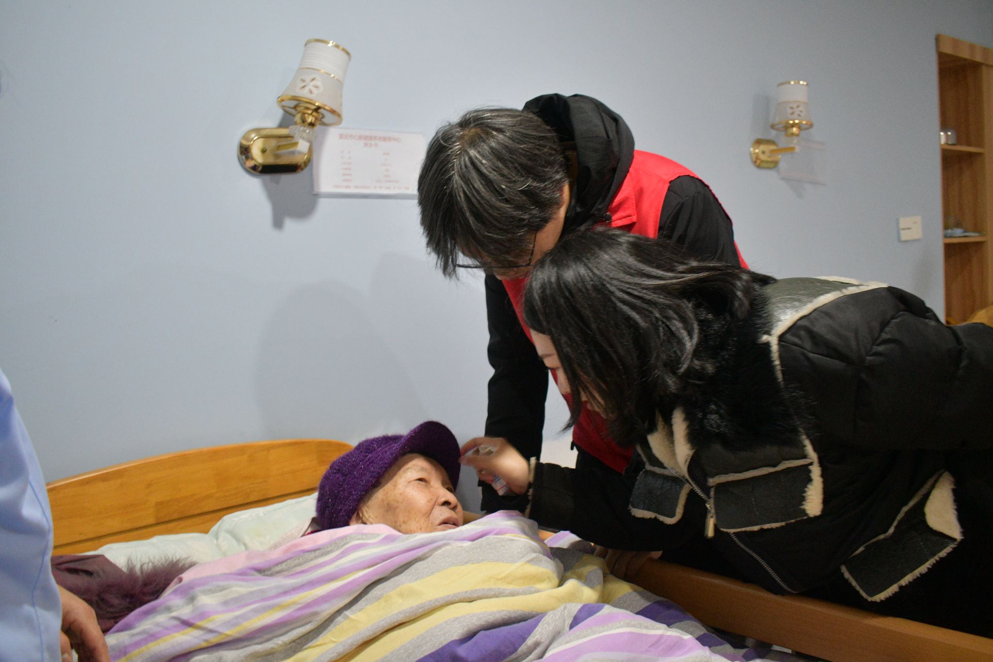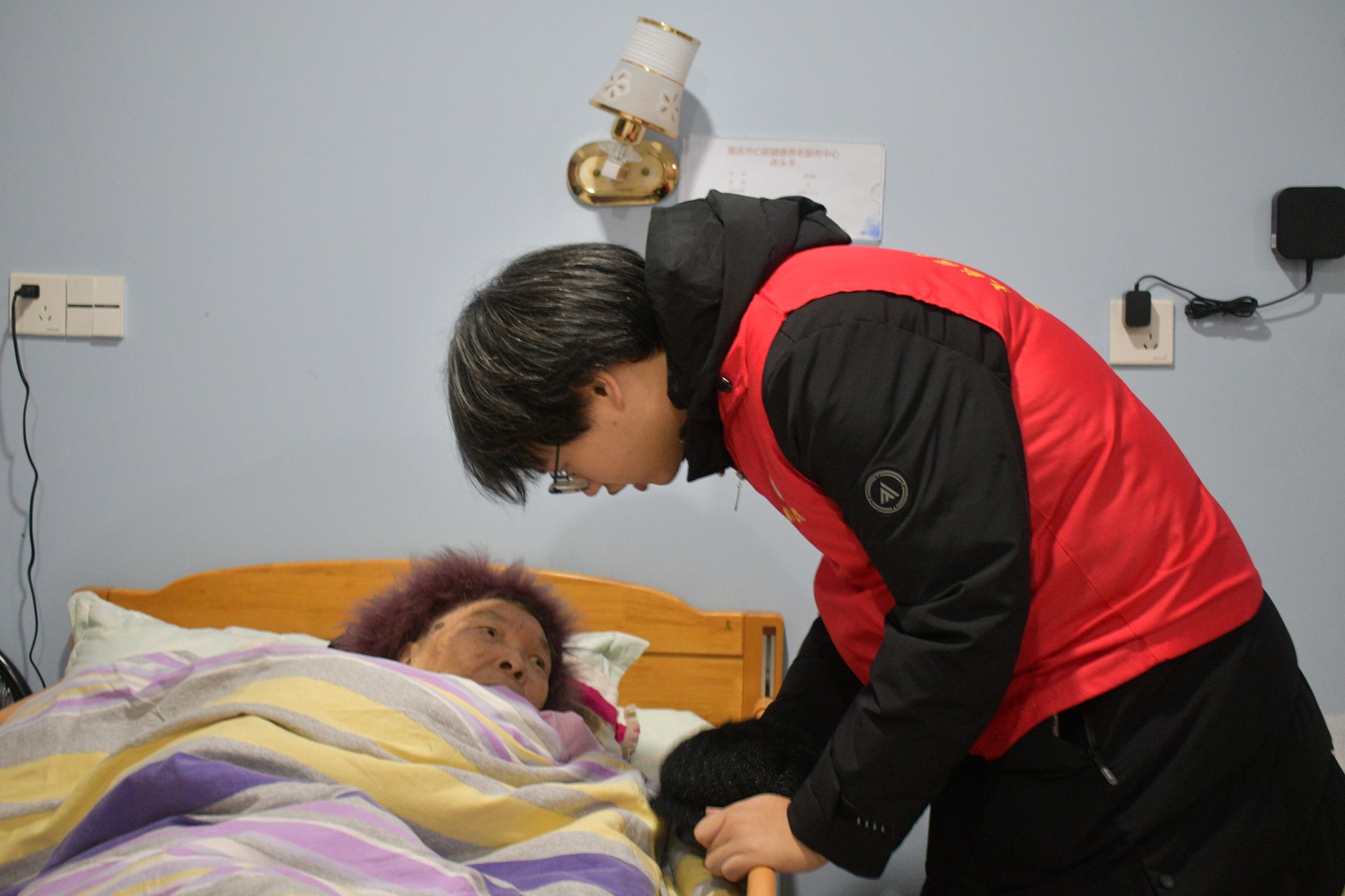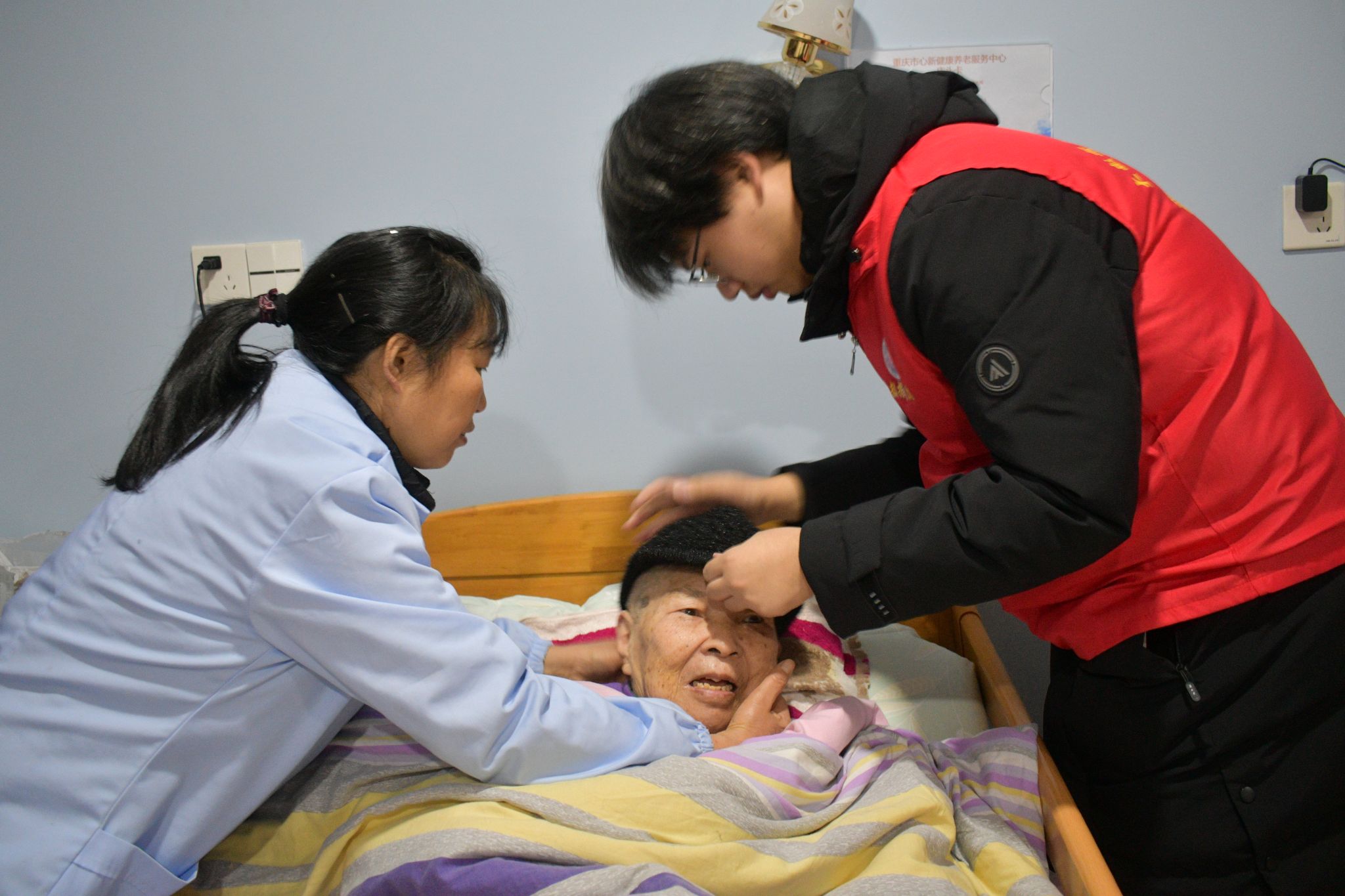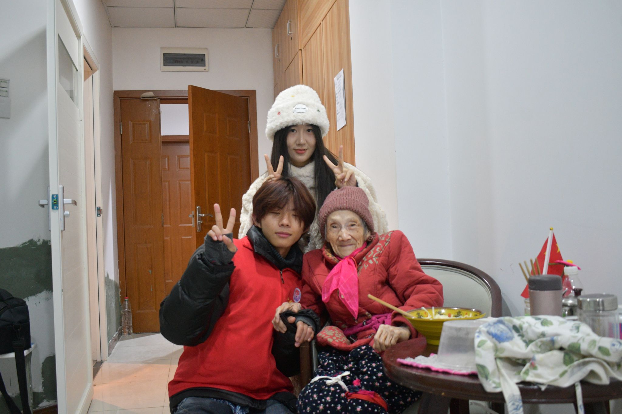 “happy birthday to you,happy birthday to you”“听吧新征程号角吹响,强军目标召唤在前方…”一阵阵欢快的歌声从心新养老中心传出,志愿者们唱着生日歌为老人们送上生日蛋糕,老人们的感激之情溢于言表。屋外寒风瑟瑟,屋内暖意融融。志愿者们带着新帽子来到心新康养中心,亲手将帽子戴在老人们的头上,与老人们唠家常、嘘寒问暖,了解他们的生活情况,贴心的叮嘱老人们要注意身体健康,注意饮食卫生,提醒他们保持愉快的心情,保持良好的生活心态。“我的女儿在北京上班,我给她打电话说有学生来我们院里面做志愿活动,她在看直播呢。她说上次来的直播她也看了,她说非常感谢你们。”一位拿着帽子的老奶奶一边说着一边紧紧的抓着志愿者们的手。