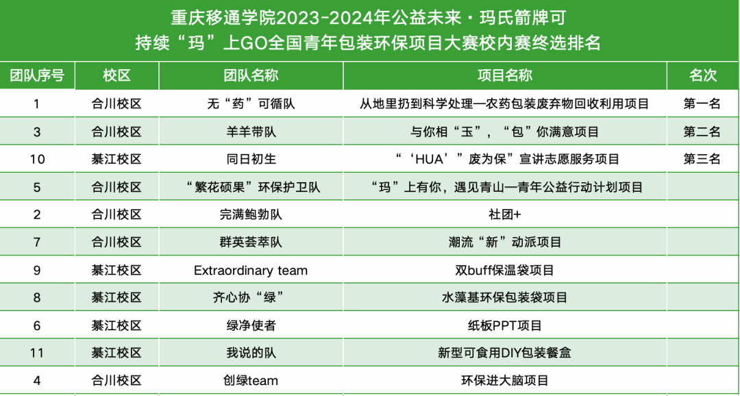 2023“可持续,玛上GO”是由玛氏箭牌糖果(中国)有限公司通过赠与亚洲携手中国乡村发展基金会主办的大学生环保创新项目。自2018年以来,我校七次入选中国乡村发展基金会高校项目,并承办了四届区域赛。本次大赛面向双校区全体师生发起,跨学院、跨专业、跨年级,以自由组队的形式报名参赛,共收到35份申报书。根据项目评审要求,最终评选出11个团队入围校内赛终选,召集勇于创新,热爱公益的环保卫士助力可持续环保发展!