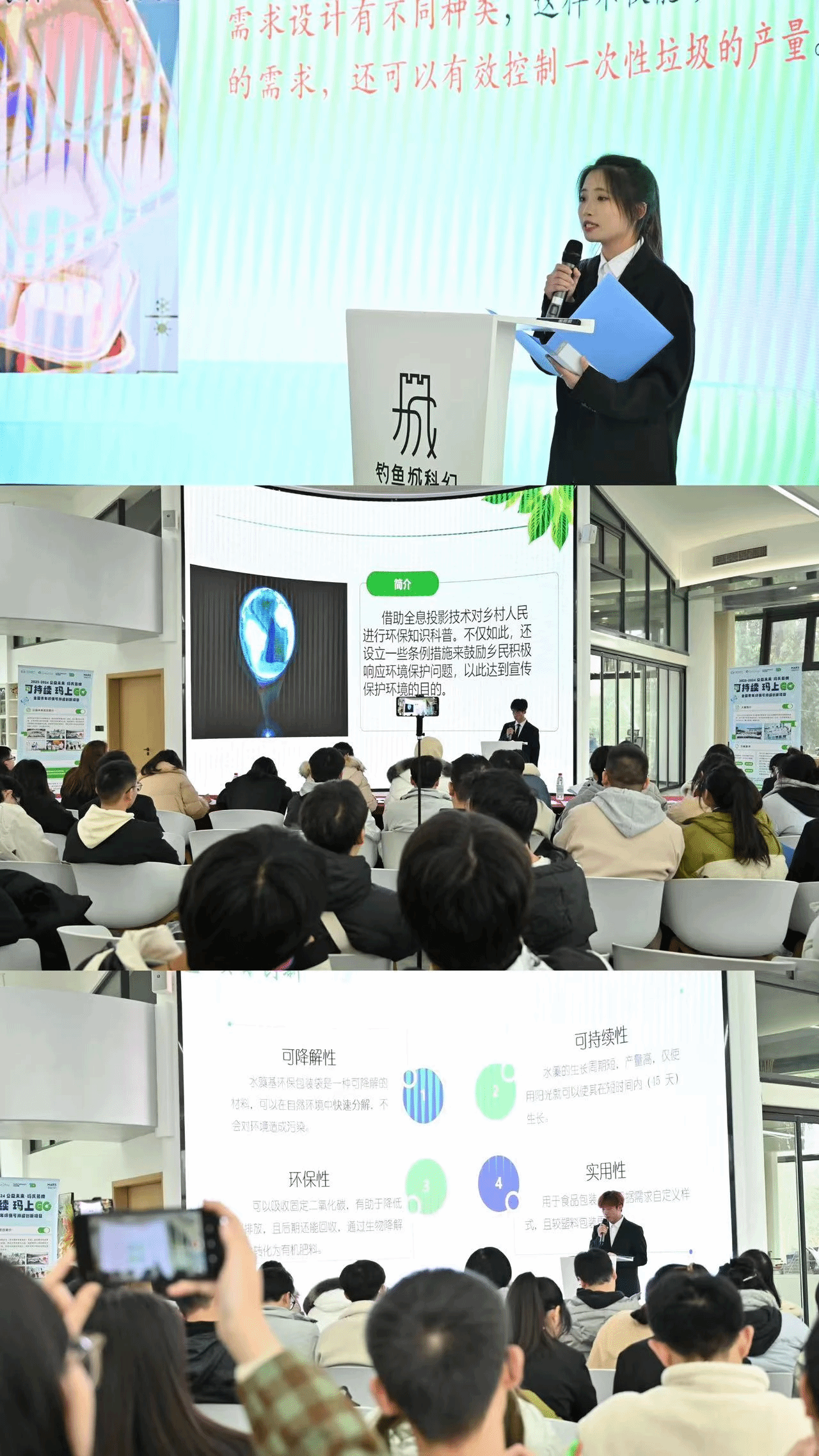 12月20日,2023公益未来·玛氏箭牌可持续“玛”上GO全国青年环保可持续创新项目大赛校内赛终选在钓鱼城科幻学院UFO开展,双校区共11个团队齐聚合川、同台竞技,运用可持续思维及创新意识,将创意孵化成方案并亲身参与实践!