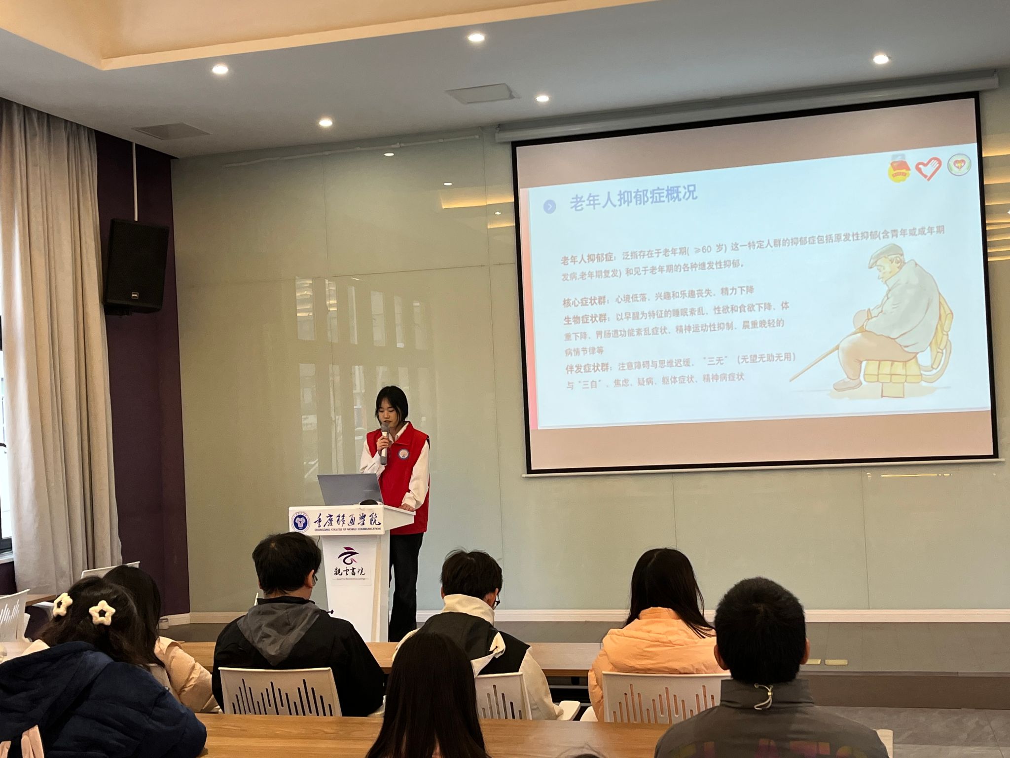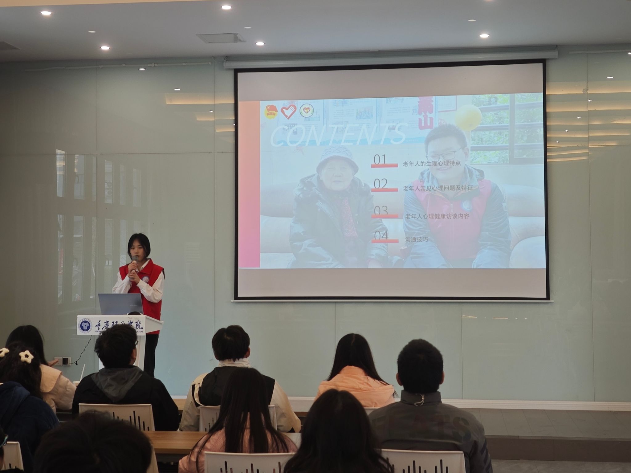 “假设当自己老了,会希望别人怎样对待我们呢?”宣讲人以此问题为导向,结合PPT与日常知识,通过分析老年人的生理心理特点、常见心理问题及特征、老年人心理访谈及内容、老年人沟通的技巧四个方面,声情并茂的向同学们介绍了老年人的常见心理及特点,引发同学们的思考。
