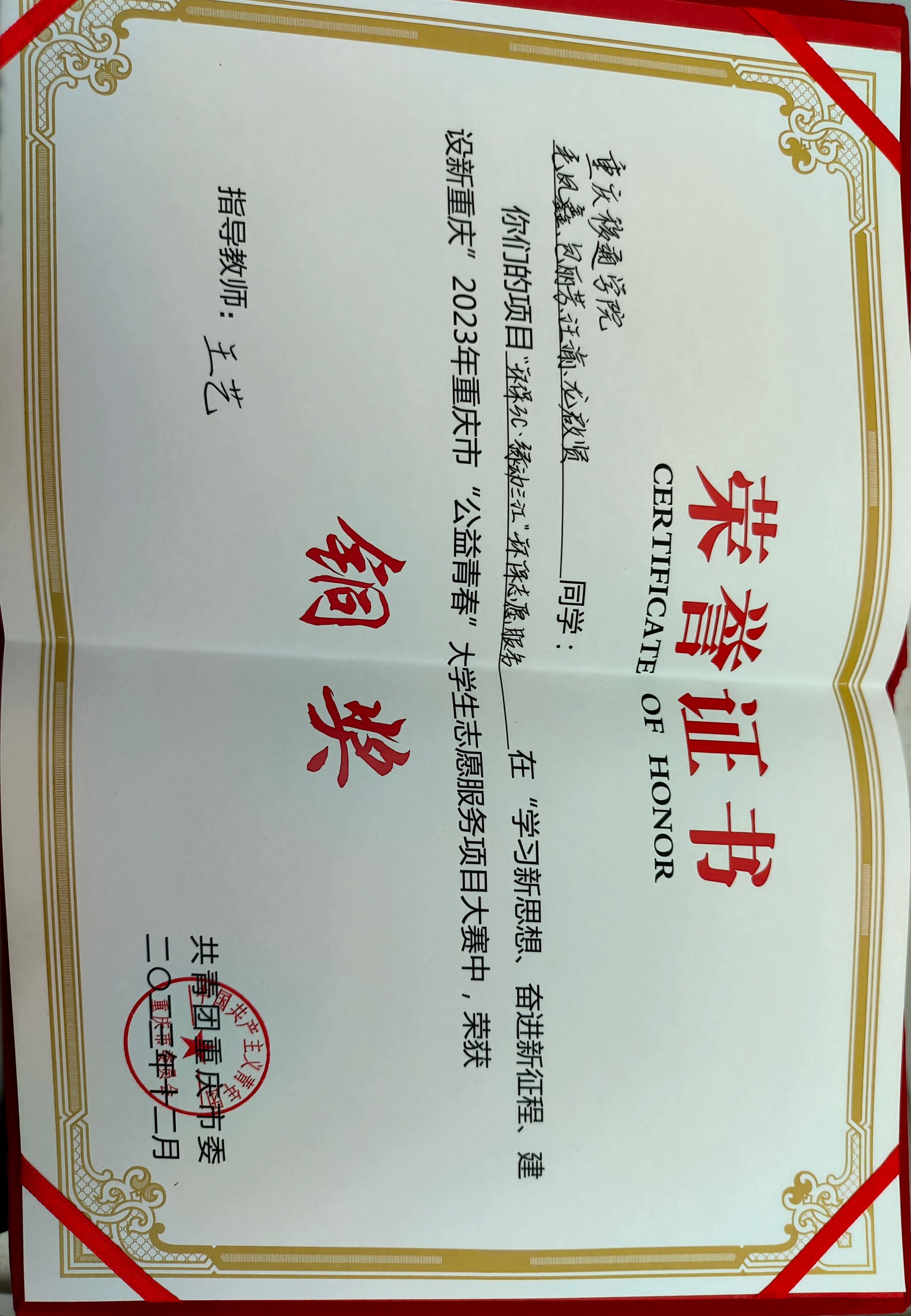 近日,由团市委联合市文明办等16家单位举办的重庆市“公益青春”大学生志愿服务项目大赛顺利举行。据悉重庆市共18个项目进入决赛,其中我校通信与信息工程学院青年志愿者协会申报的“环保3C,绿动三江”项目进入决赛,并由王艺老师、黄真老师带领项目成员前往重庆大学参赛,经过不懈努力,最终成功斩获铜奖!