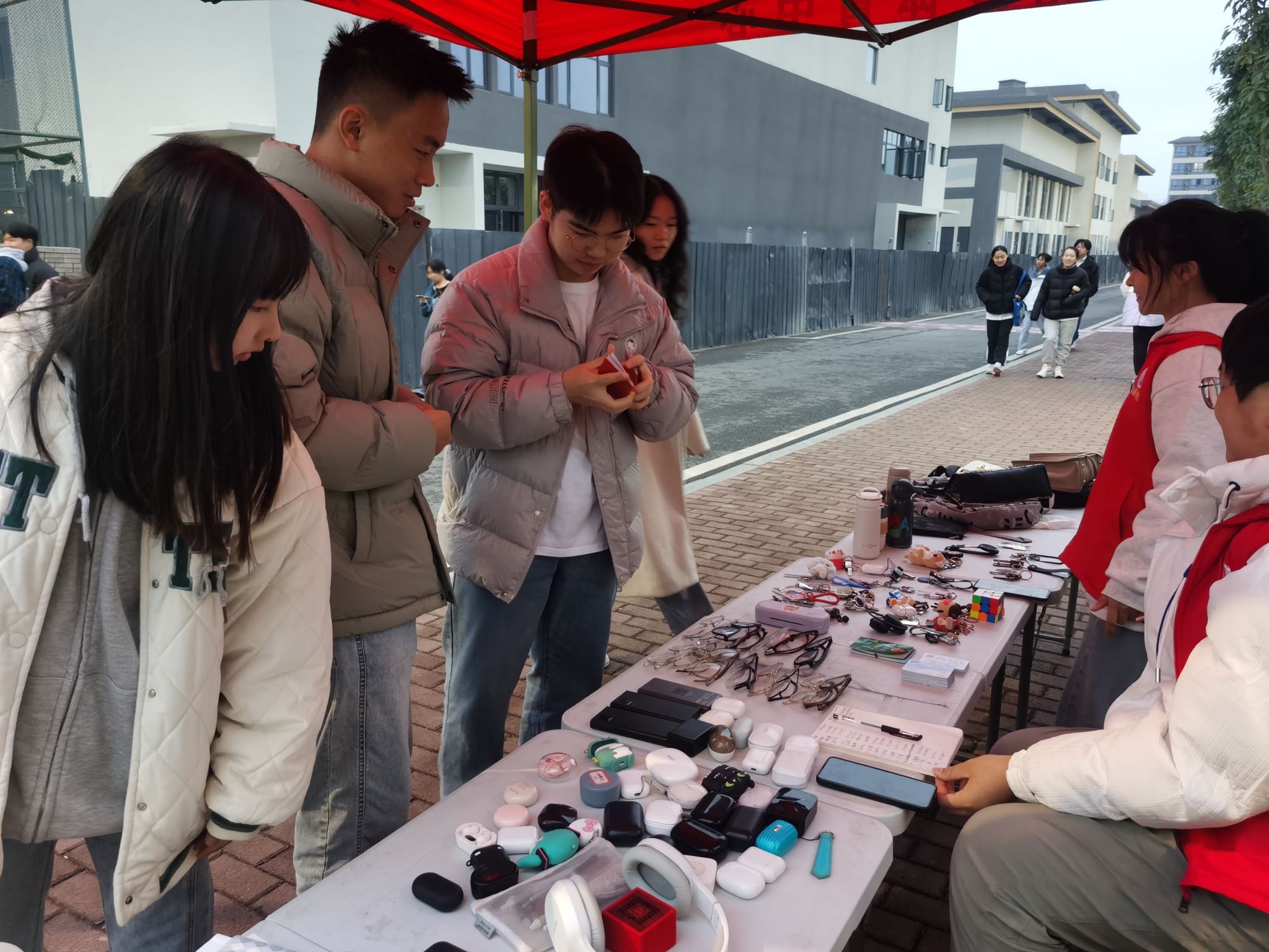 你知道我在等你吗?2023年12月1日,送“我”回家失物招领志愿服务专项支队在操场贩卖机旁开展了失物展出活动。经过一个学期,失物·寻梦工坊里已堆满同学们丢失的物品,久久无人问津。为了让同学们找回自己的丢失的物品,让失物找到家,失物招领支队的队员们在校园里摆起了“摊位”,他们将认领的物品分门别类、整整齐齐地摆在活动现场,等待小主人的到来,让更多的失物找到自己的主人,回到自己的主人身边。