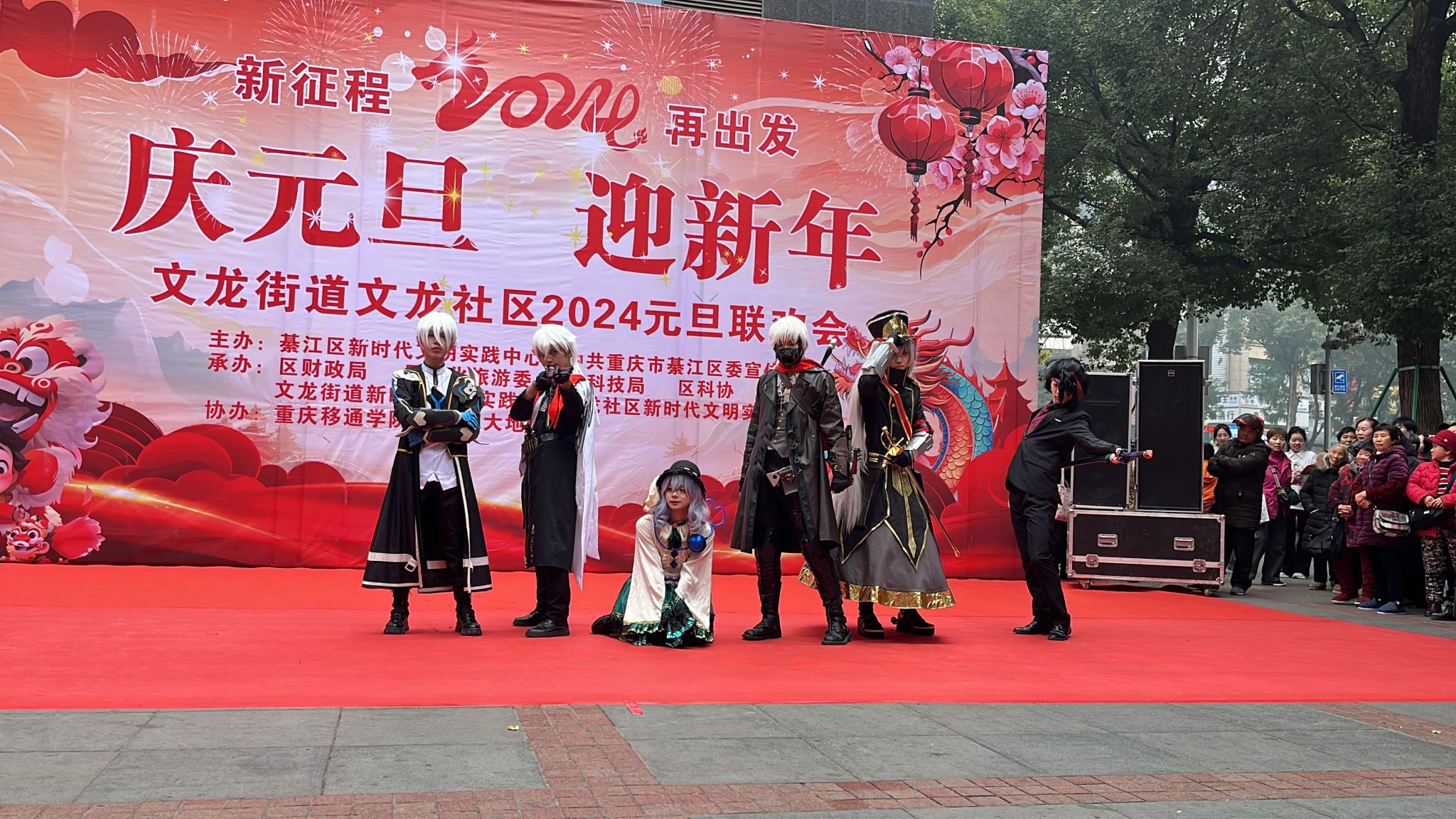 而后,随着预热音乐的响起,周围的居民、过路的行人都循声而来,场地的周围围满了观众,大家驻足在这里被这祥和而又喜庆的氛围所动容。十点整,在观众热烈的掌声和主持人的开场致辞下,元旦联欢会正式序幕,演绎内容精彩呈现,社区艺术团的舞蹈优美动人,小朋友们的“说唱脸谱”唱出了中华民族生生不息的文化底蕴,朗诵《读中国》读出了祖国的大好河山,读出了当代青年对祖国、对社会波澜壮阔的豪情壮志,合唱《如愿》唱出了人们对新的一年美好的向往,此外还进行歌曲《淋雨一直走》《防拐小品》《cos走秀》等精彩节目表演。