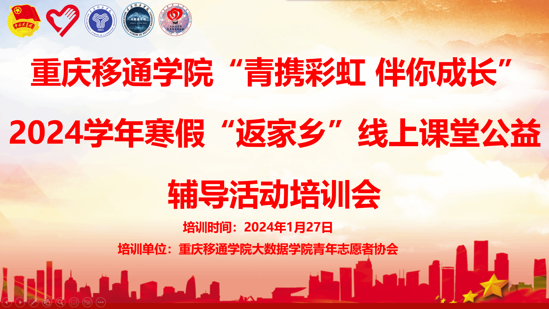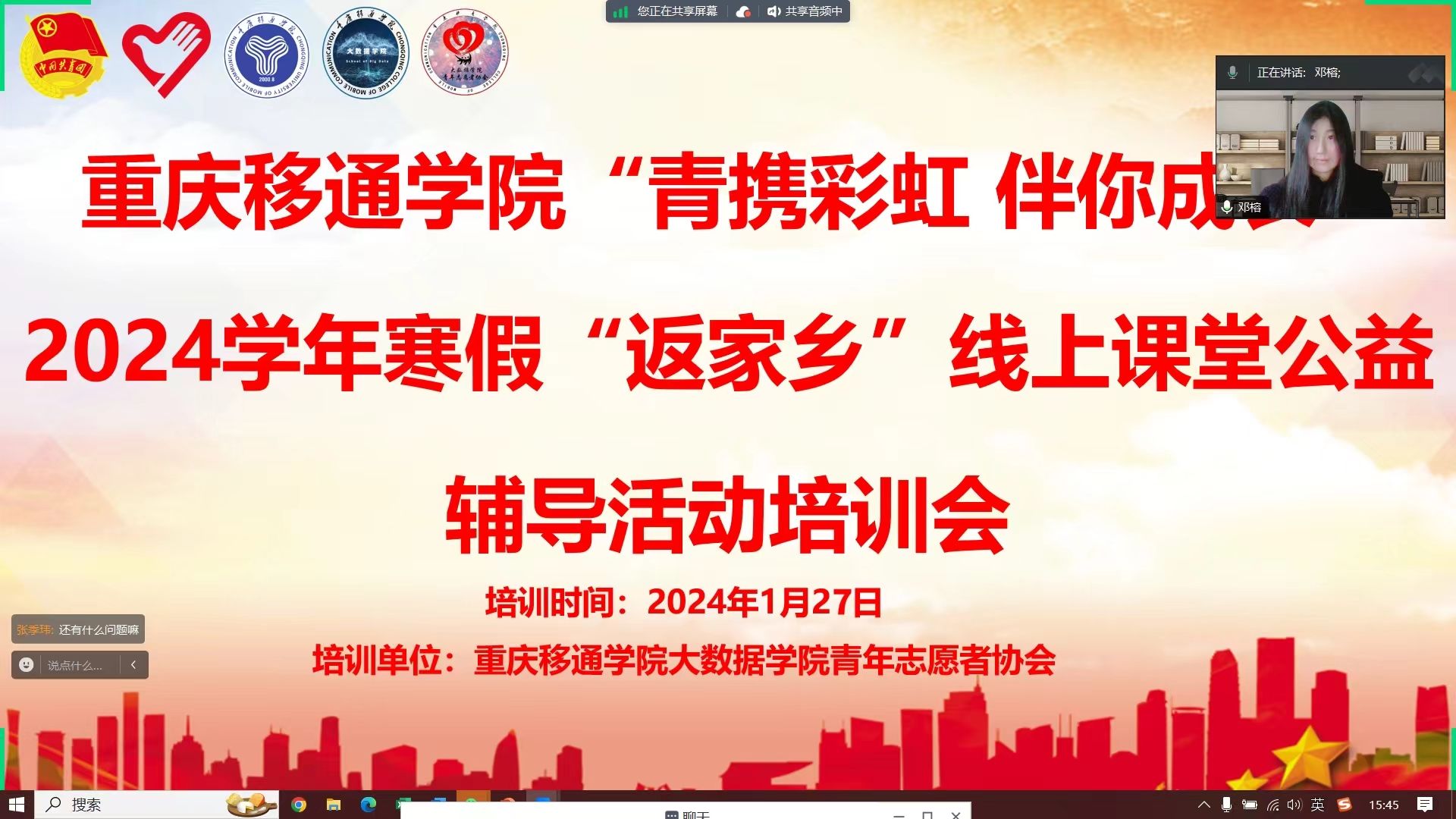 知识传递温暖,志愿点亮未来。2024年1月27日下午3时,大数据学院青年志愿协会针对“青携彩虹 伴你成长”2024学年寒假“返家乡”线上课堂公益辅导活动开展线上培训会。此次活动由大数据学院青年志愿者协会与重庆彩虹志愿服务队组织共同举行。