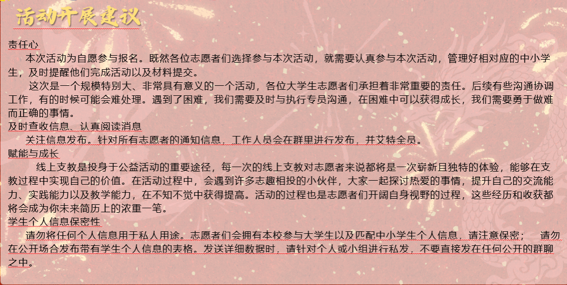 云端相聚,共赴未来,用爱支教,传递美好。为有力推动云支教活动的进行以及活动的高效率开展,我院云支教团队参与第八季云支教动员大会,青年志愿者们在云端参与了此次会议。在活动的准备过程中,我院执行团队将持续完善工作机制、强化全面统筹管理,为中小学生提供良好的学习平台和活动体验,为大学生志愿者提供有效保障和细致服务。