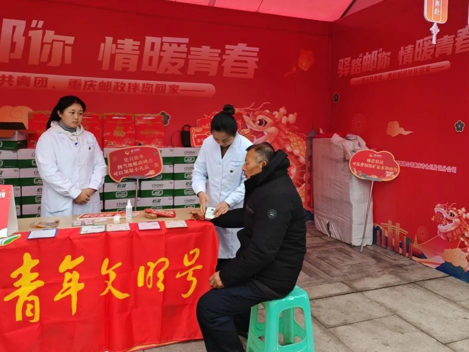 活动中,作为“三江新青年”的志愿者们为返乡务工青年和大学生进行政策宣传、提供就业信息等,并在驿站为来往人员提供了矿泉水、面包以及人民邮政文创包等新春小礼品。现场还组织了诸多青年文明号集体开展血压测量、健康问诊等暖青服务。