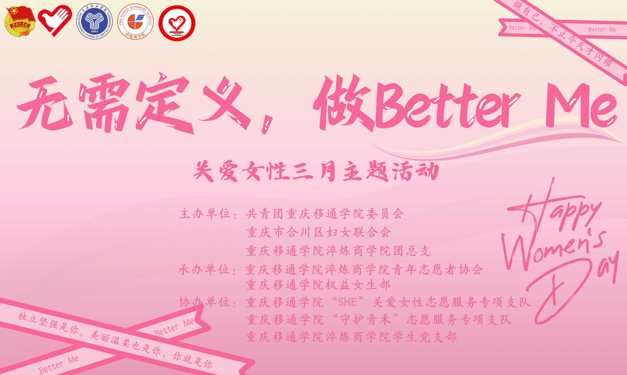 在这充满温暖与力量的日子里,重庆移通学院在怀念雷锋同志的无私奉献精神时,也在赞颂广大女性同胞的坚韧与付出。3月8日,由重庆市合川区妇女联合会、共青团重庆移通学院委员会和淬炼商学院团总支联合主办,淬炼商学院青年志愿者协会承办的“无需定义,做Better me”巾帼志愿服务活动在重庆移通学院黄桷树广场拉开帷幕,旨在展现新时代女性的独特魅力和责任担当。