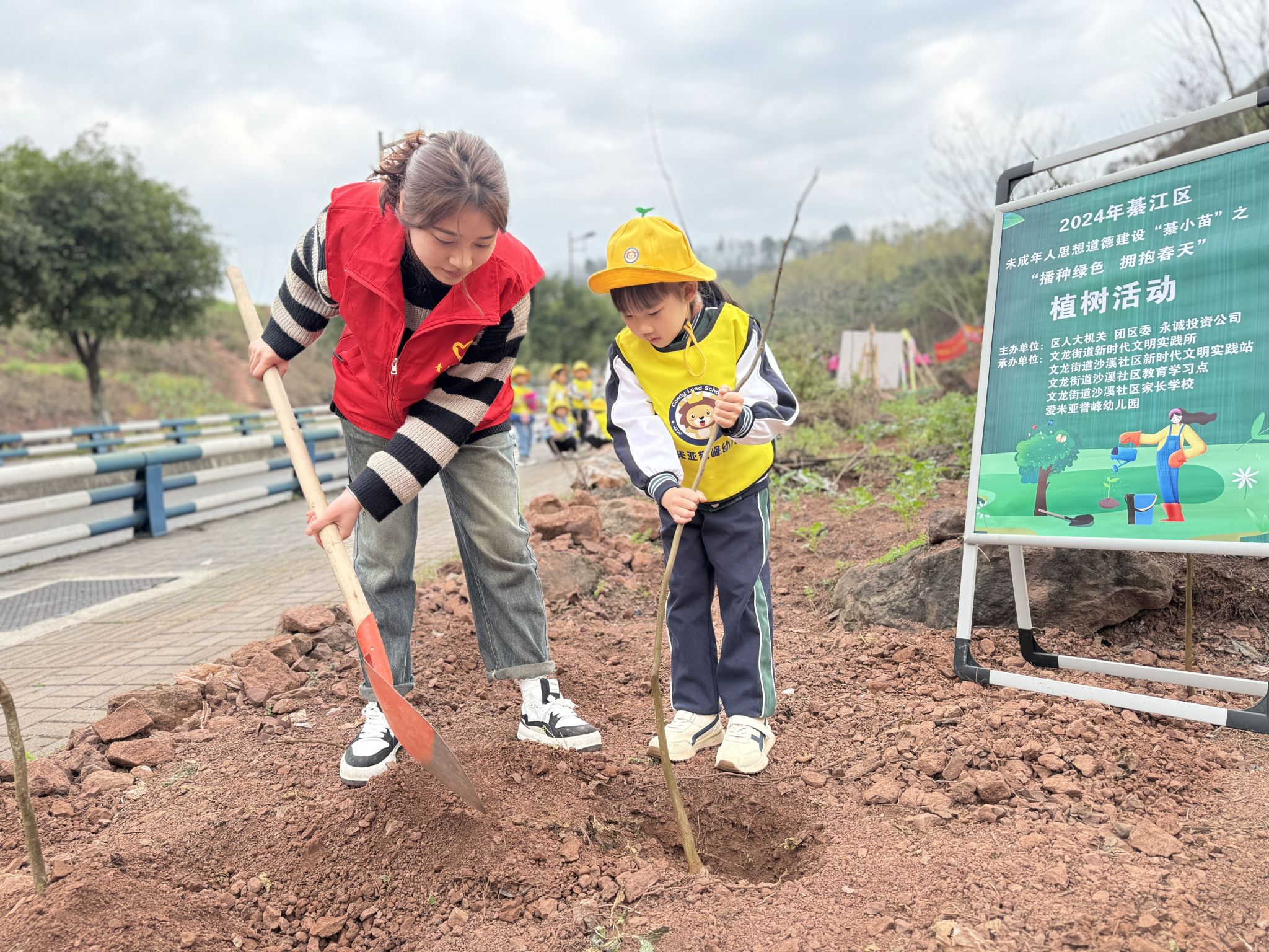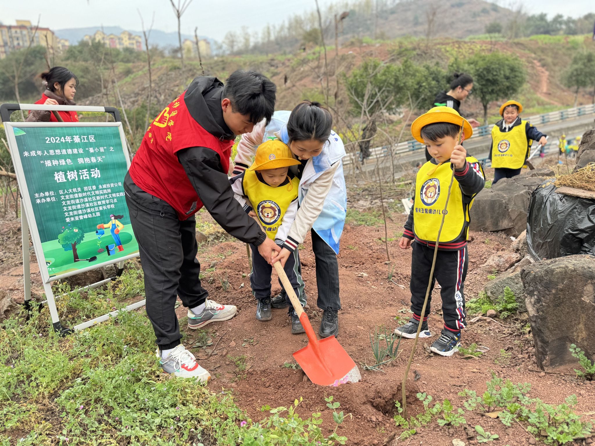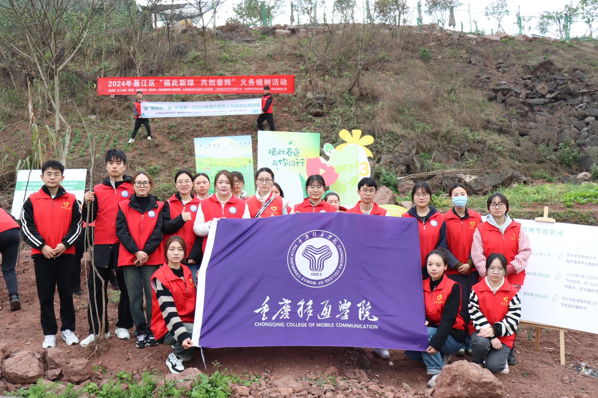 春意盎然,万木葱茏,值得三春树,招来百鸟鸣。随着我国第46个植树节的来临,为增强学生的环保意识,养成环保习惯,并深刻体会到生态环境的重要性,3月12日早上,“童”植春晖·“綦”筑绿旖——2024年綦江区青少年劳动实践活动顺利举行。作为活动承办单位之一,我校团委青年志愿者联合会、数字经济与信息管理学院、綦江校区机关第二党支部、数字经济与信息管理学院学生党支部带领志愿者20余名一同参与此次活动。本次活动由重庆市綦江区人大机关、綦江区团委、永城投资公司主办,参与人数共计约120人。
