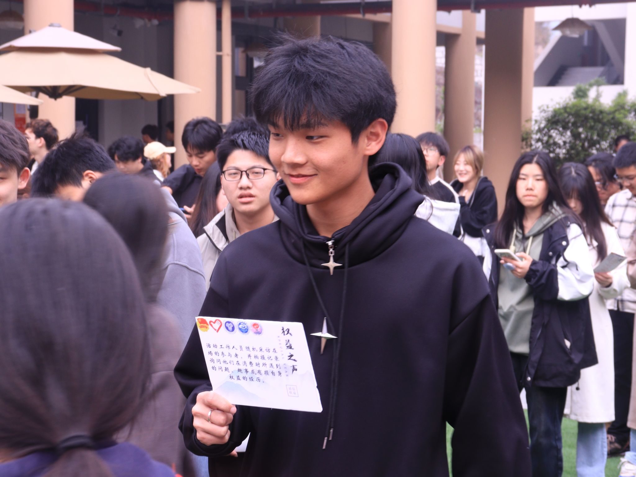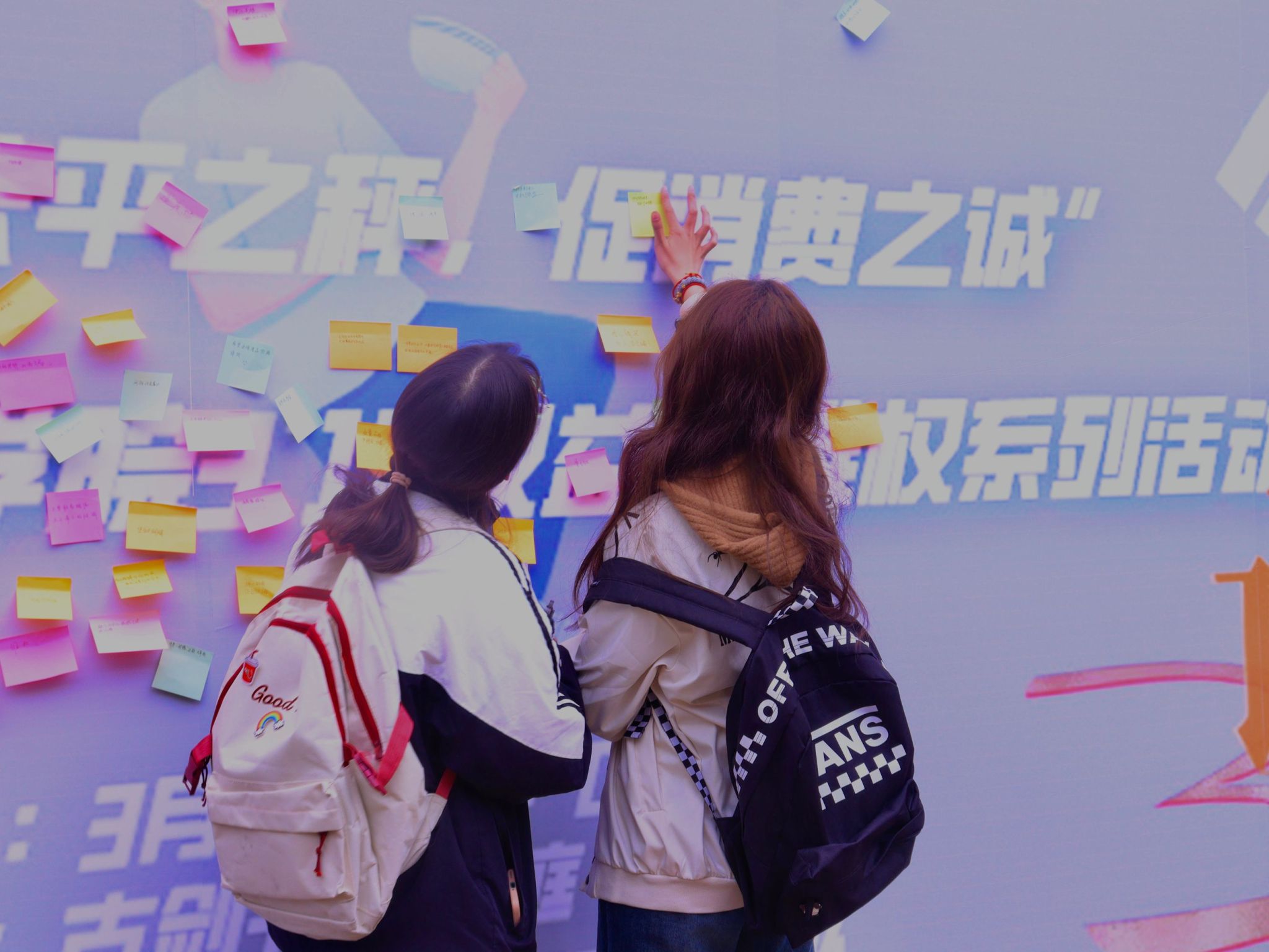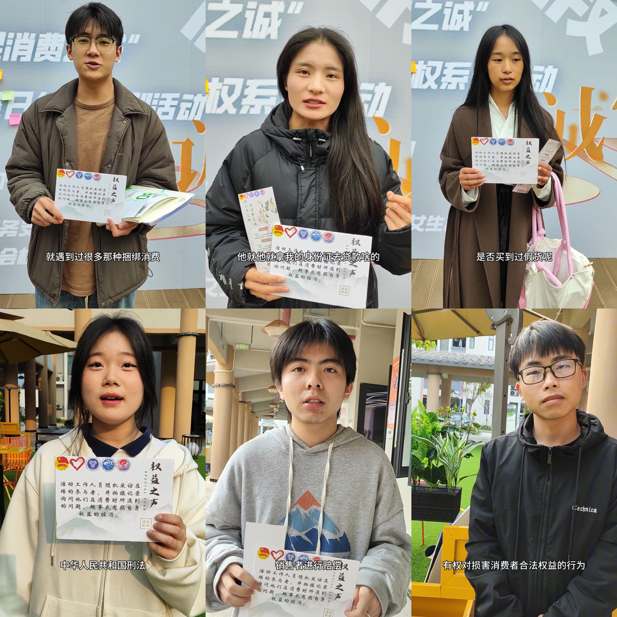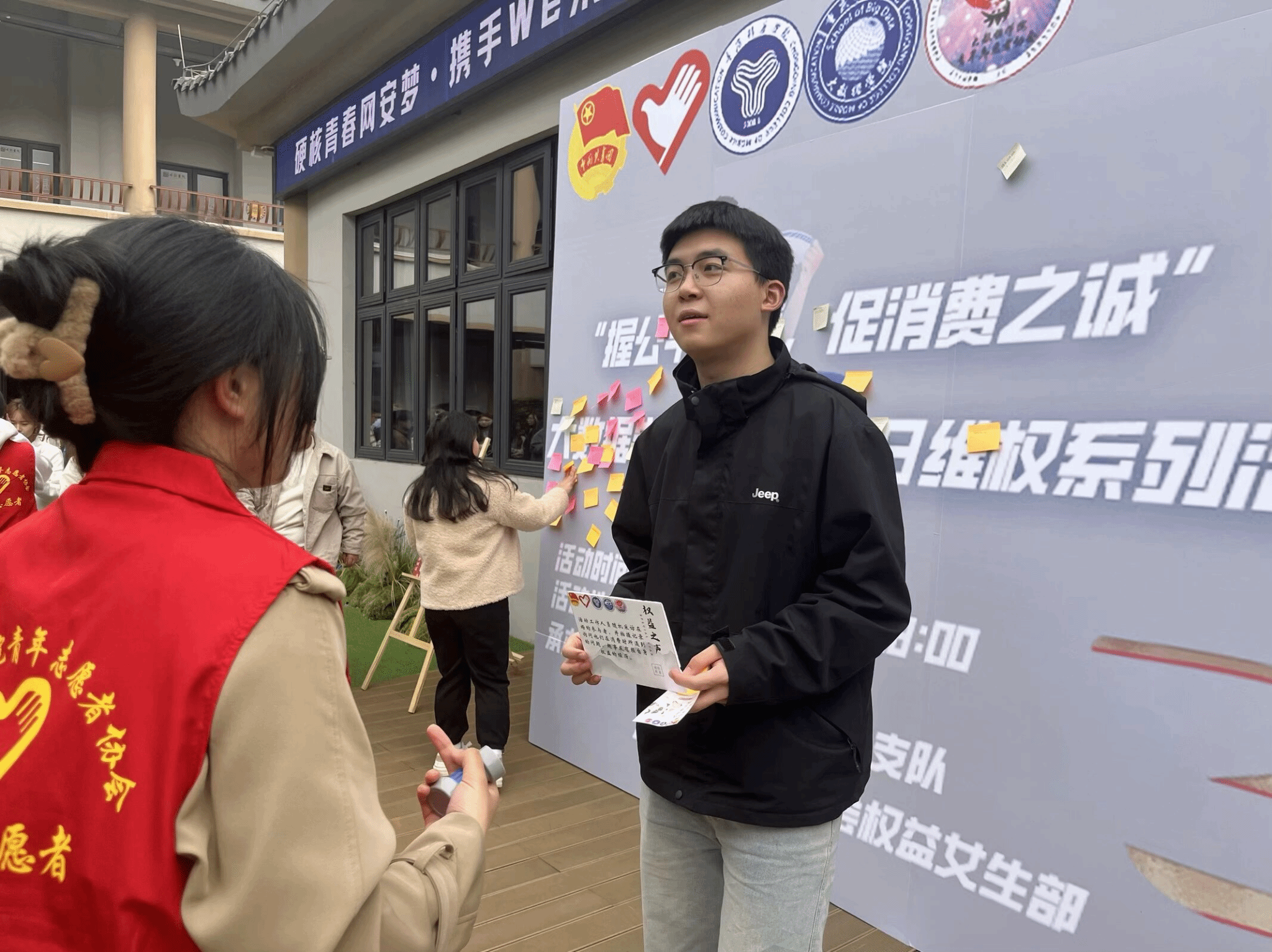 聆听权益之声,传递心声,为公平发声,点亮权益之光。权益之声打卡摊位,作为一个移动的采访点,活动现场处处充满着红马甲的身影。工作人员或是询问着参与者在曾经消费时所遇到的问题,或是提问着与权益的有关小知识,以此检验同学们对权益知识的了解程度。有些同学谈及到曾经遇到过捆绑消费,或是买到假货,货物有问题时退货困难,甚至是遇到经营者提出要拿消费者身份证贷款等“窘境”!种种可怕的行径络绎不绝,令同学们感到后怕,这更需要同学们在日常生活中树立维权意识,并学习相关知识切实有效的避免自身权益遭受侵犯。