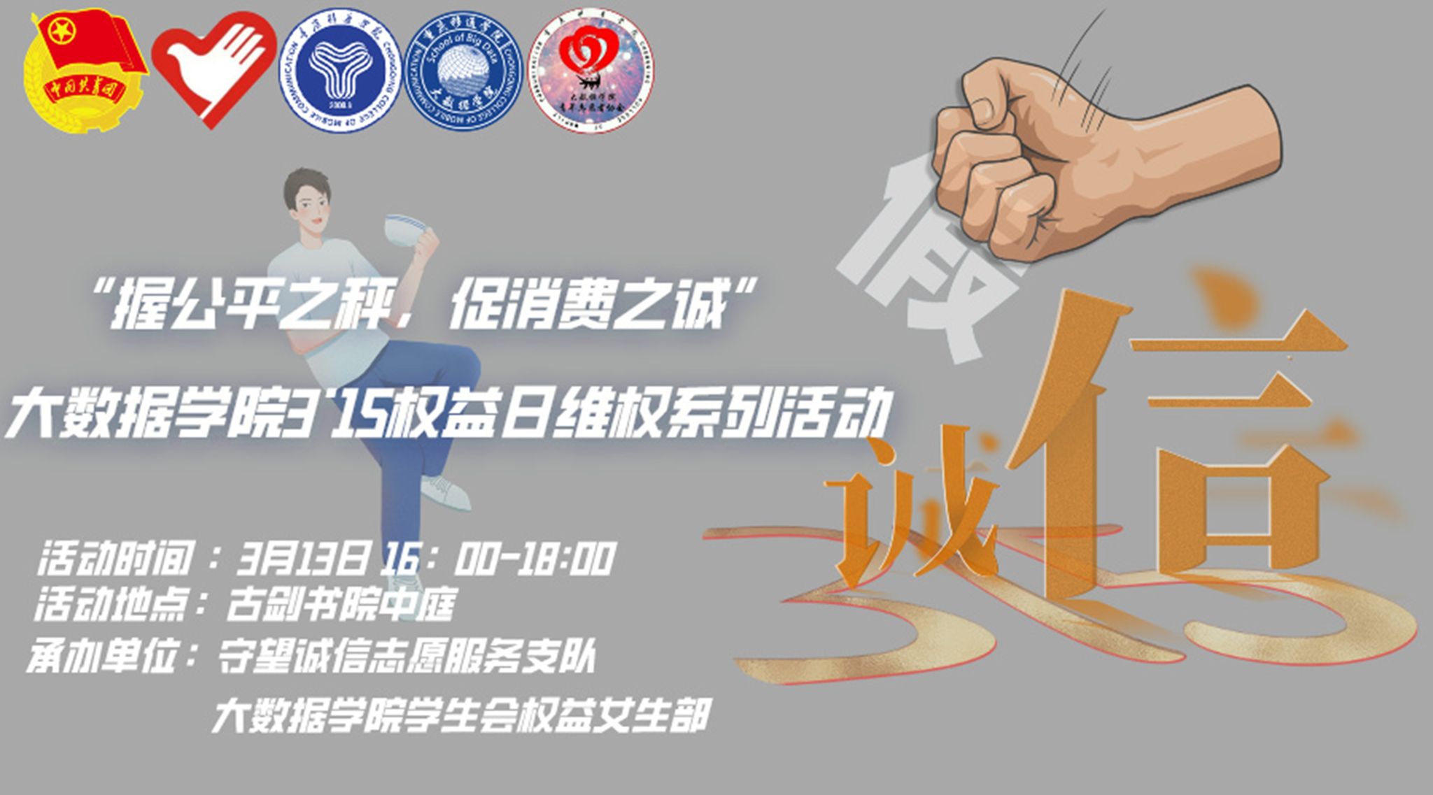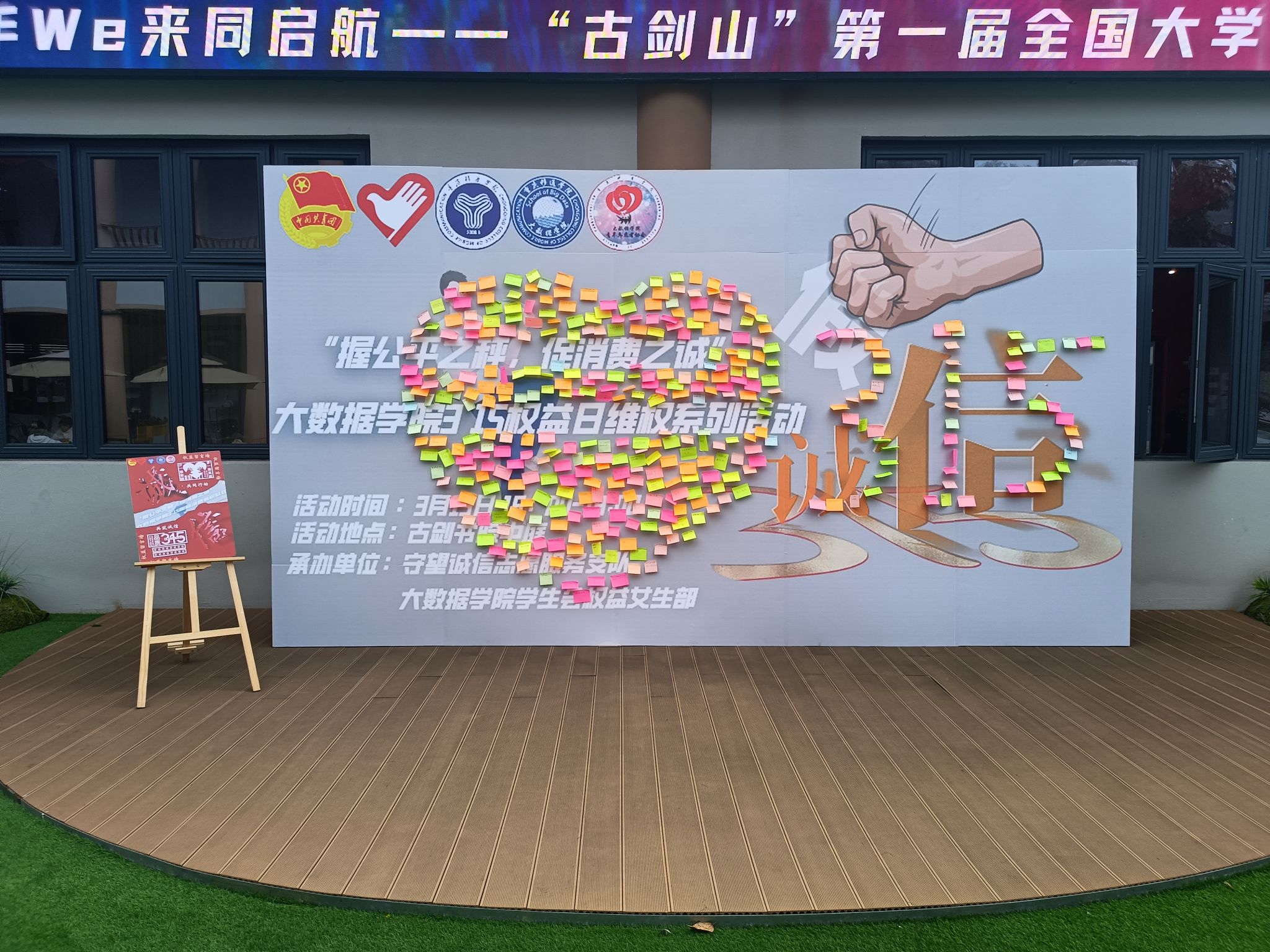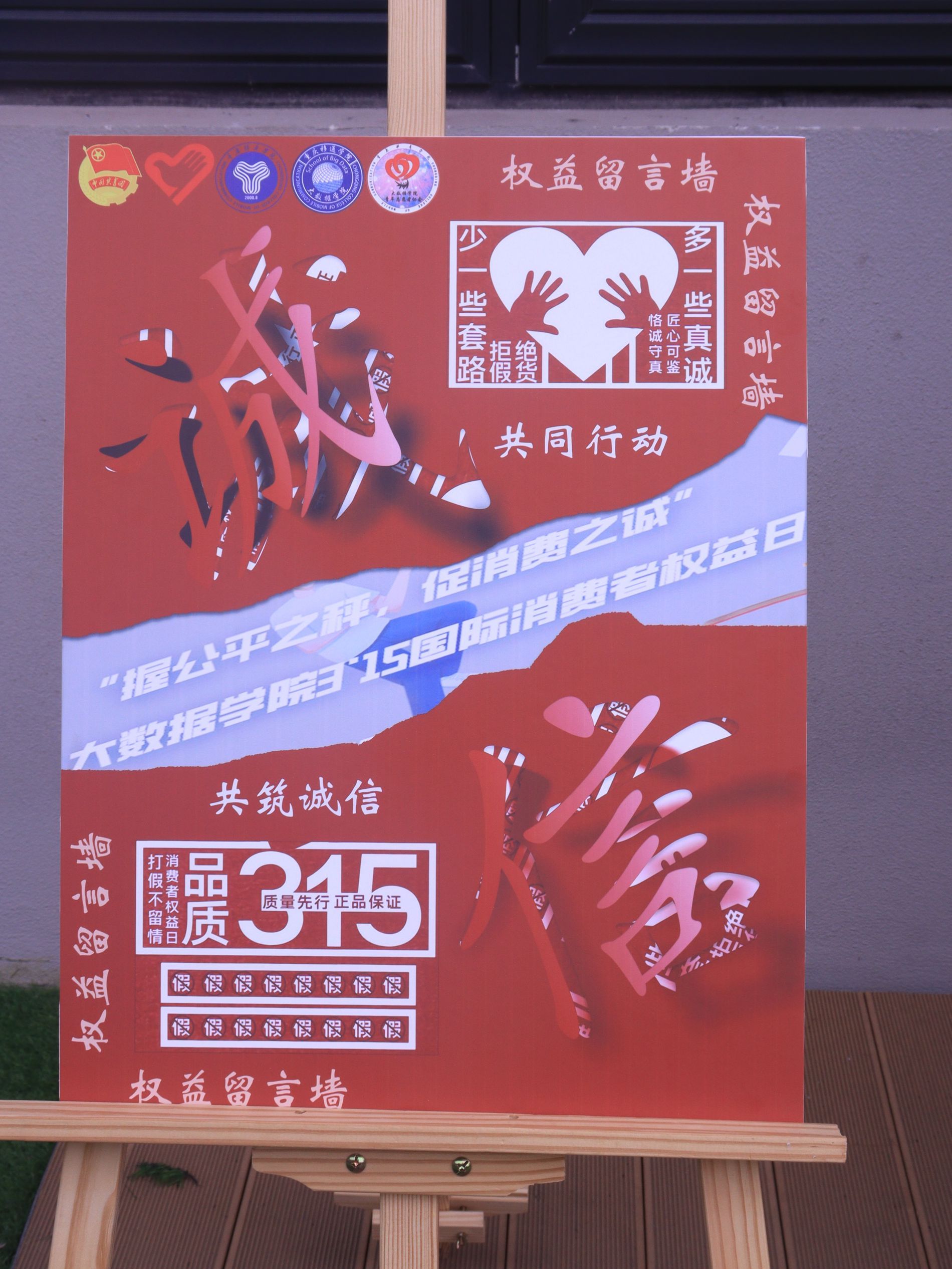 守望诚信,践行责任,315共筑大学引领消费新篇章!315国际消费者权益日,旨在提高消费者的权益保护意识。为提高我校大学生对消费权益的认知,引导学生树立正确的消费观念,大数据学院学生会权益女生部和守望诚信志愿服务专项支队于2024年3月13日下午16:00-18:00在古剑书院中庭开展了一场关于消费维权的互动打卡活动。活动设置了4个打卡摊位,气氛热烈而庄重,每一个都蕴含着不同的权益小知识,通过这种打卡互动的方式,让学生充分了解更多的消费维权知识,提高其消费辨识真假能力。