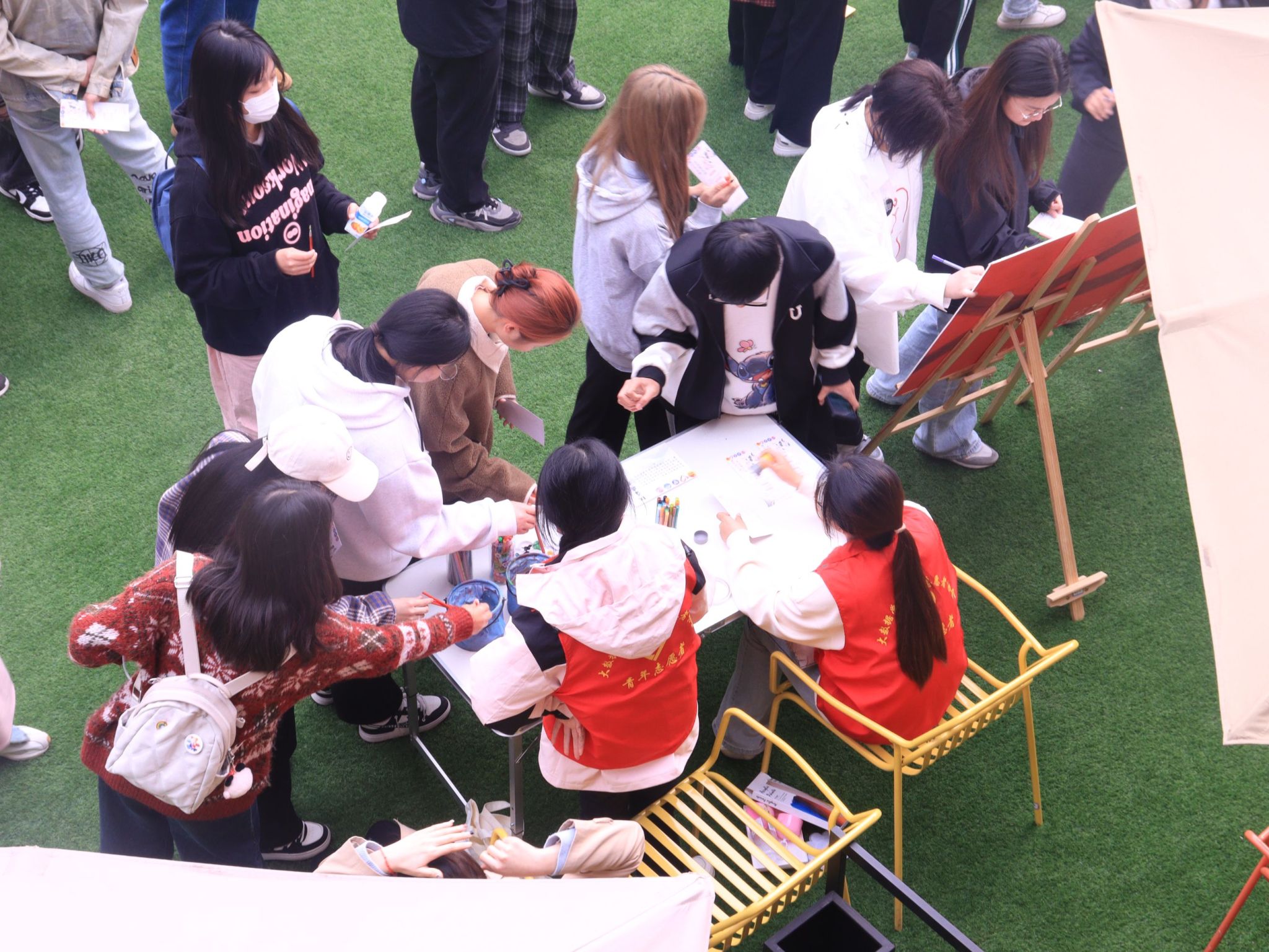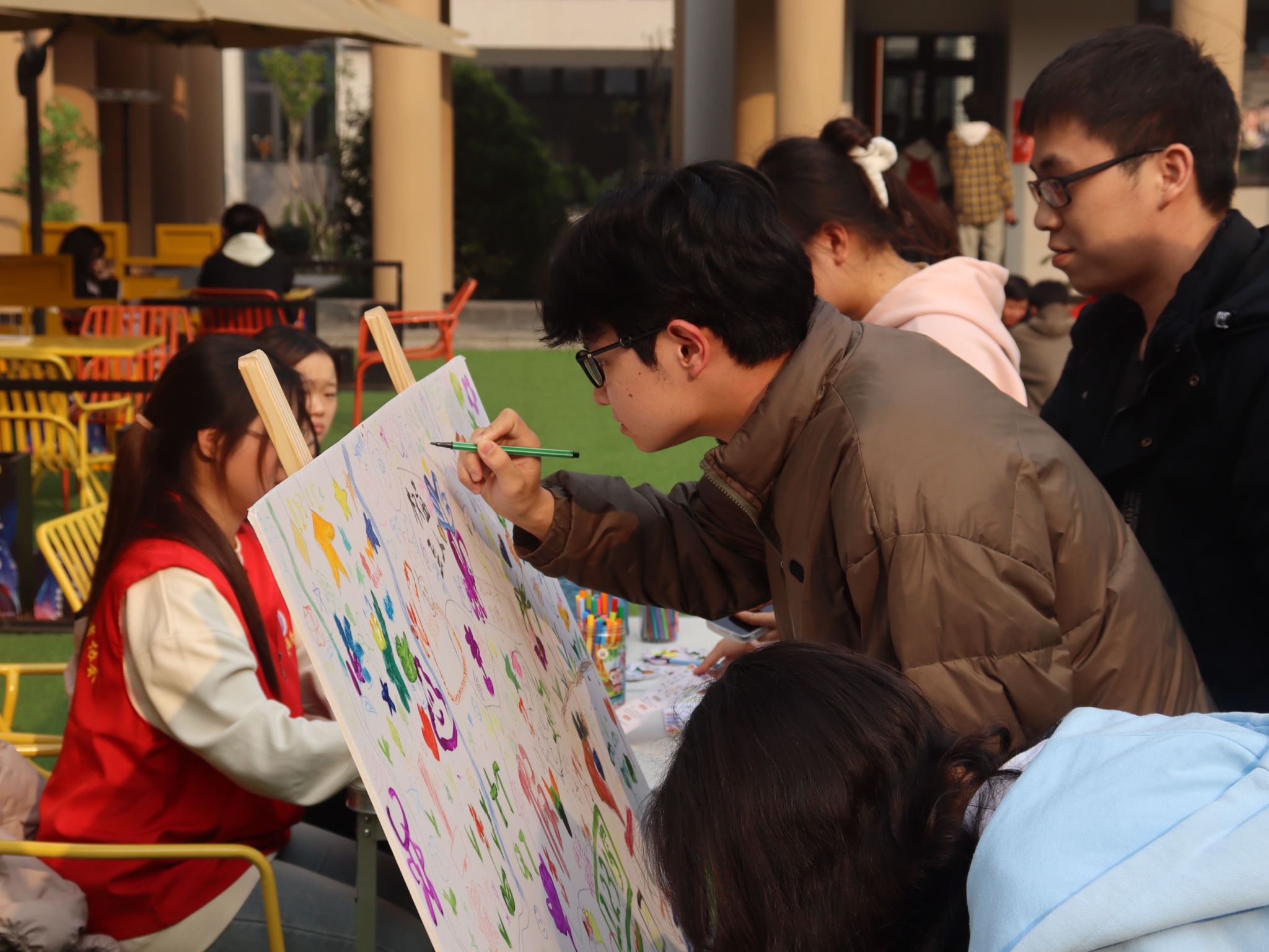 权益接力,手绘权益,接力传递。权益接力摊位,主办方为同学们提供了各种水彩笔、马克笔等,在工作人员绘制的维权框架下,同学们将自己对权益的领悟付诸于笔尖,或是一小段话,或是一个小元素、小人物。最终,在大家共同努力下绘制出了这幅有关权益的画卷,传递着浓浓的权益情!