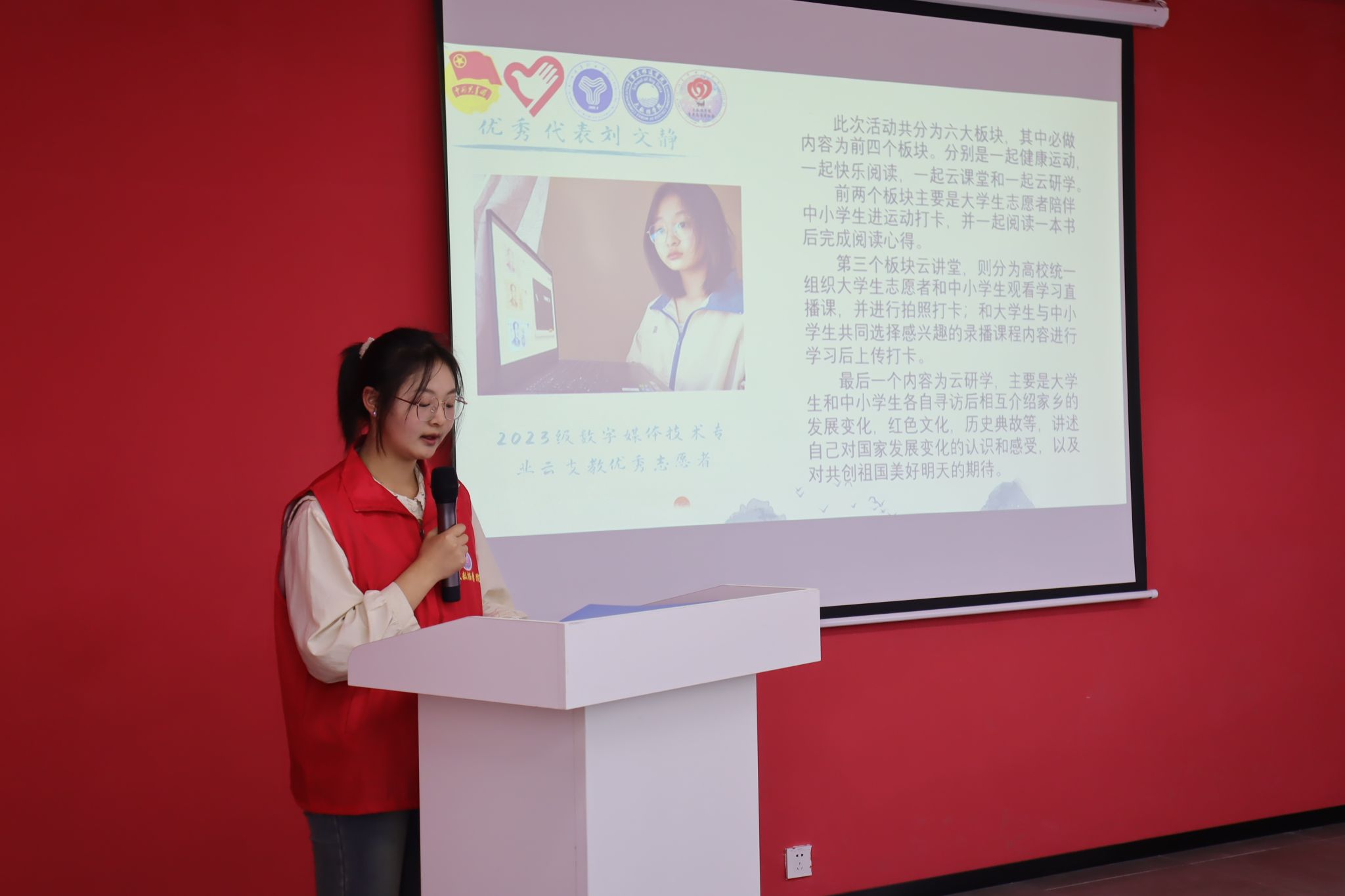在生活中,有这样一些人,他们是奉献的代名词。在此次社会实践活动中,我院青年学子深入基层,用实际行动去服务人民。“返家乡”社会实践活动优秀志愿者高瑞晗在发言中说到了志愿服务最重要的是奉献精神,奉献是一种态度,是一种行动,也是一种信念,并且任何一切只有去做才能做得更好。第八季全国大学生“传承优秀文化•赓续中华文脉”社会实践一起云支教专项活动优秀志愿者刘文静在发言中说到志愿服务造就美好未来,每个人都有自己的梦想,都需要努力地去实现它,志愿服务亦是如此,都希望大家共同努力。在发言结束也对现场其他志愿者提出了问题互动,大家都在实践活动中有各种收获。
