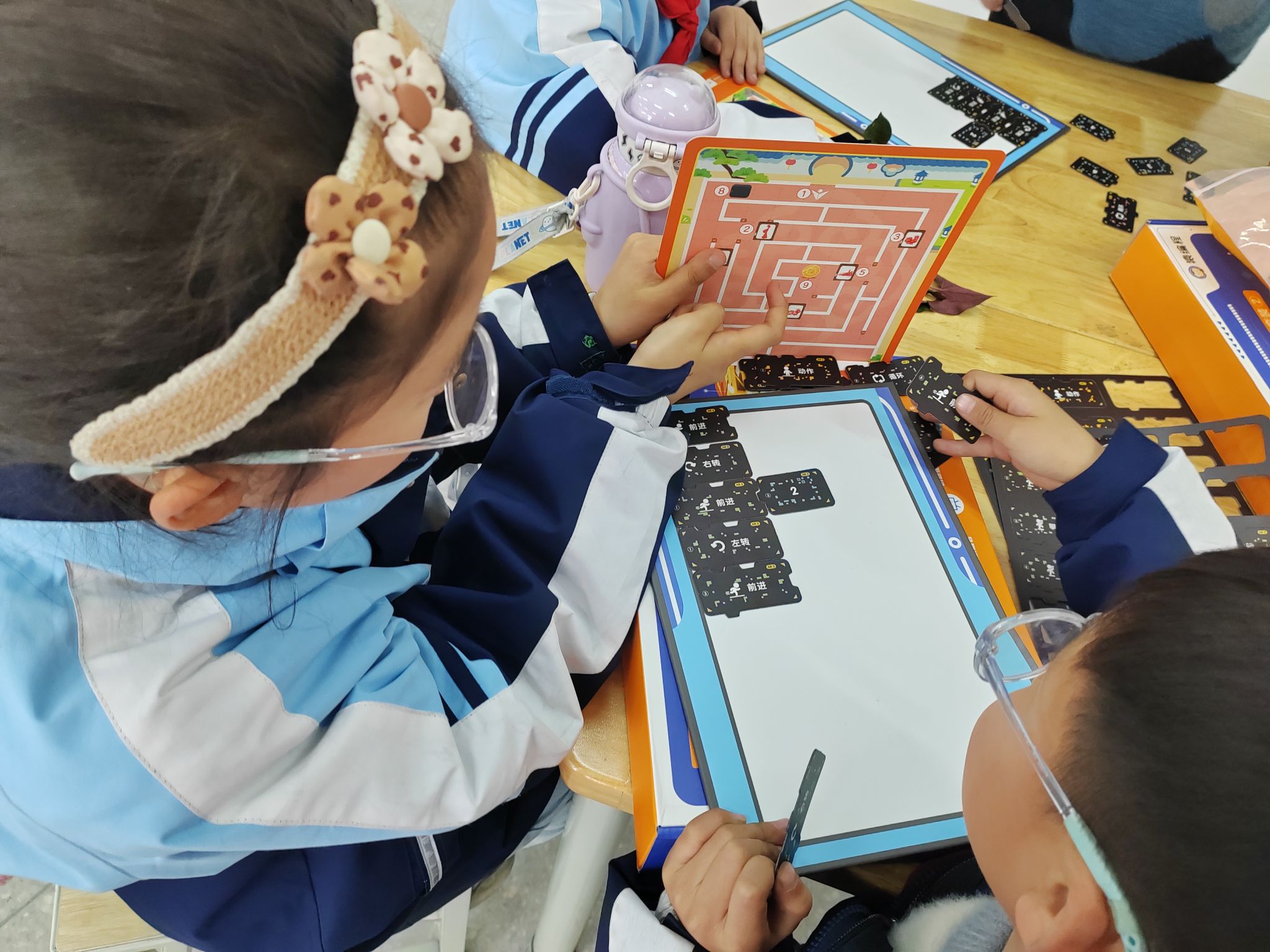 本次在凤凰小学课程主要为同学们讲解了非物质文化遗产——剪纸的相关知识。在课程开始之前,老师通过视频引入了本节课的剪纸内容,同学们聚精会神的看着,面对老师的提问也是踊跃举手回答。接着引入面对不同类别的剪纸进行分类的问题,让同学们自己将贴纸的类别粘贴到卡片上,再将剪纸进行归类。第二堂课中,让同学们自己制定获取非遗徽章的路线,灵活运用跳跃、循环、转向等类别的卡牌进行路线的制定,与此同时也设定了通过分类获取的钥匙打开门的关卡,两节课堂联系紧密,充分调动了同学们的积极性。