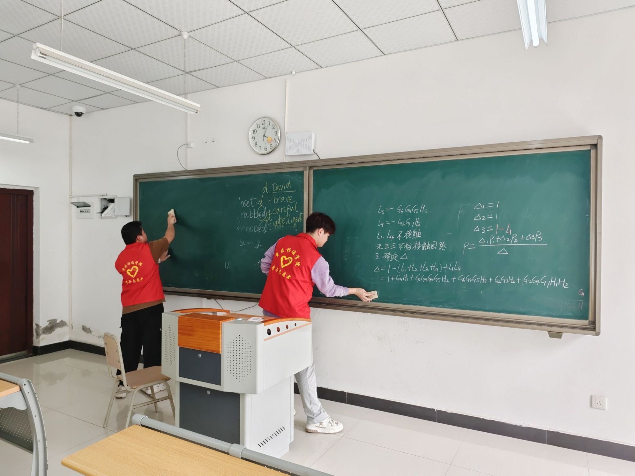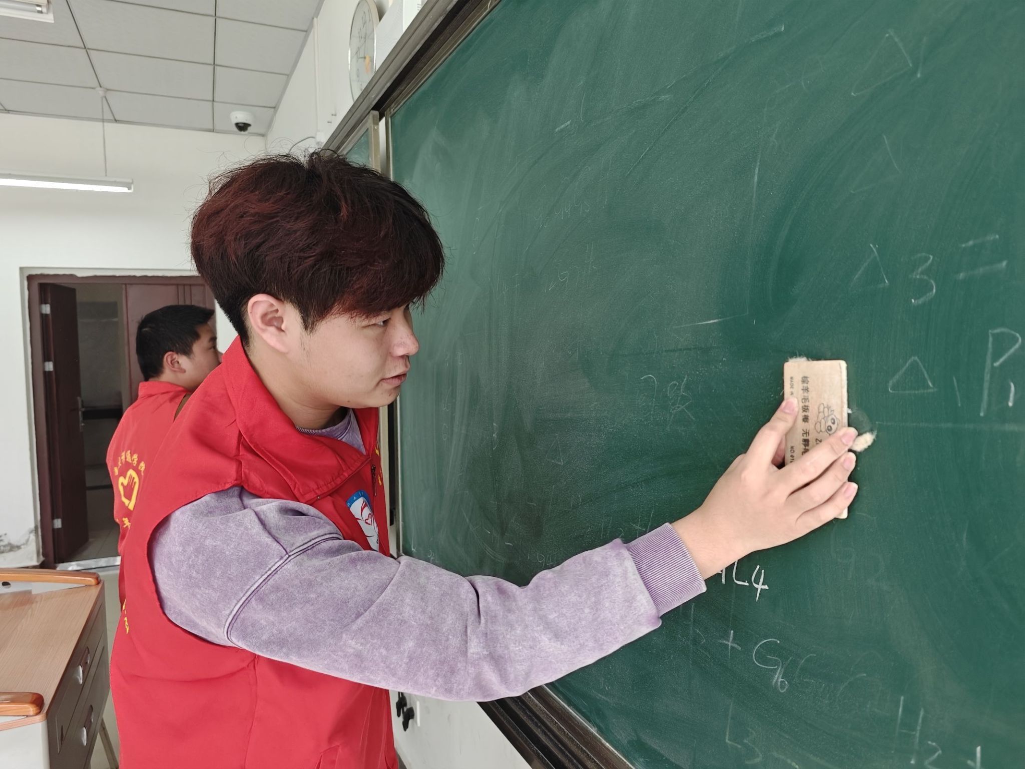 活动开始之前,支队长快速分配好每位志愿者的对应打扫区域,并分发红马甲。活动开始后,志愿者们迅速投入到清洁工作中。为不打扰其他同学的正常学习,志愿者们优先对空着的教室进行了清理和打扫,然后询问使用教室的同学,得到允许后再进入到教室进行清理。他们有的擦拭讲台和黑板,有的打扫桌洞和整理坐椅,每个人都充满了热情和干劲。在清洁过程中,志愿者们充分展现出了不怕脏、不怕累、爱劳动的精神。他们一丝不苟地打扫教室卫生,将每一个角落都打扫得干干净净。