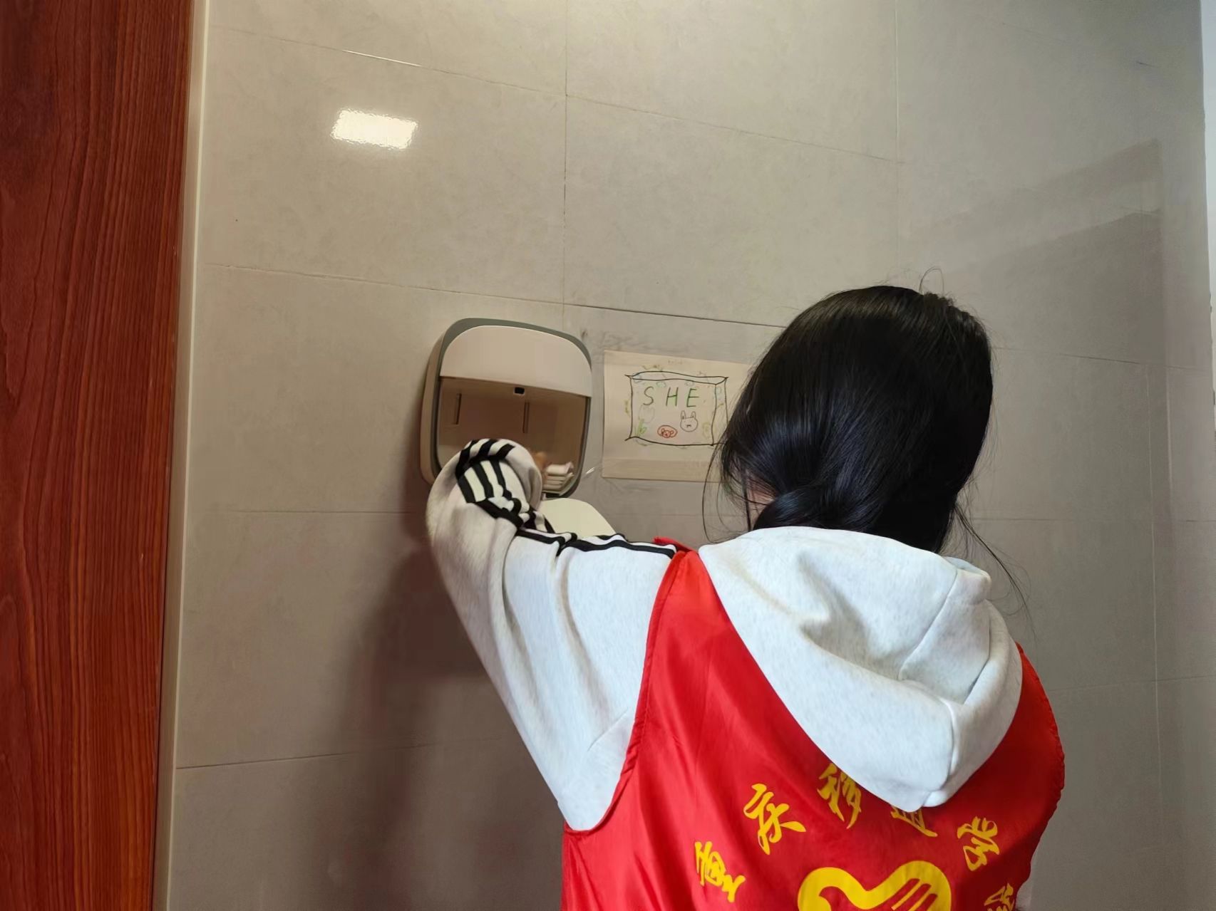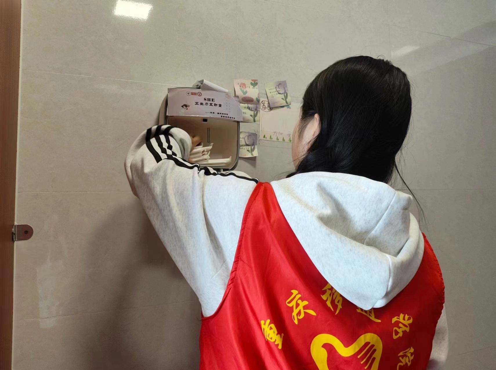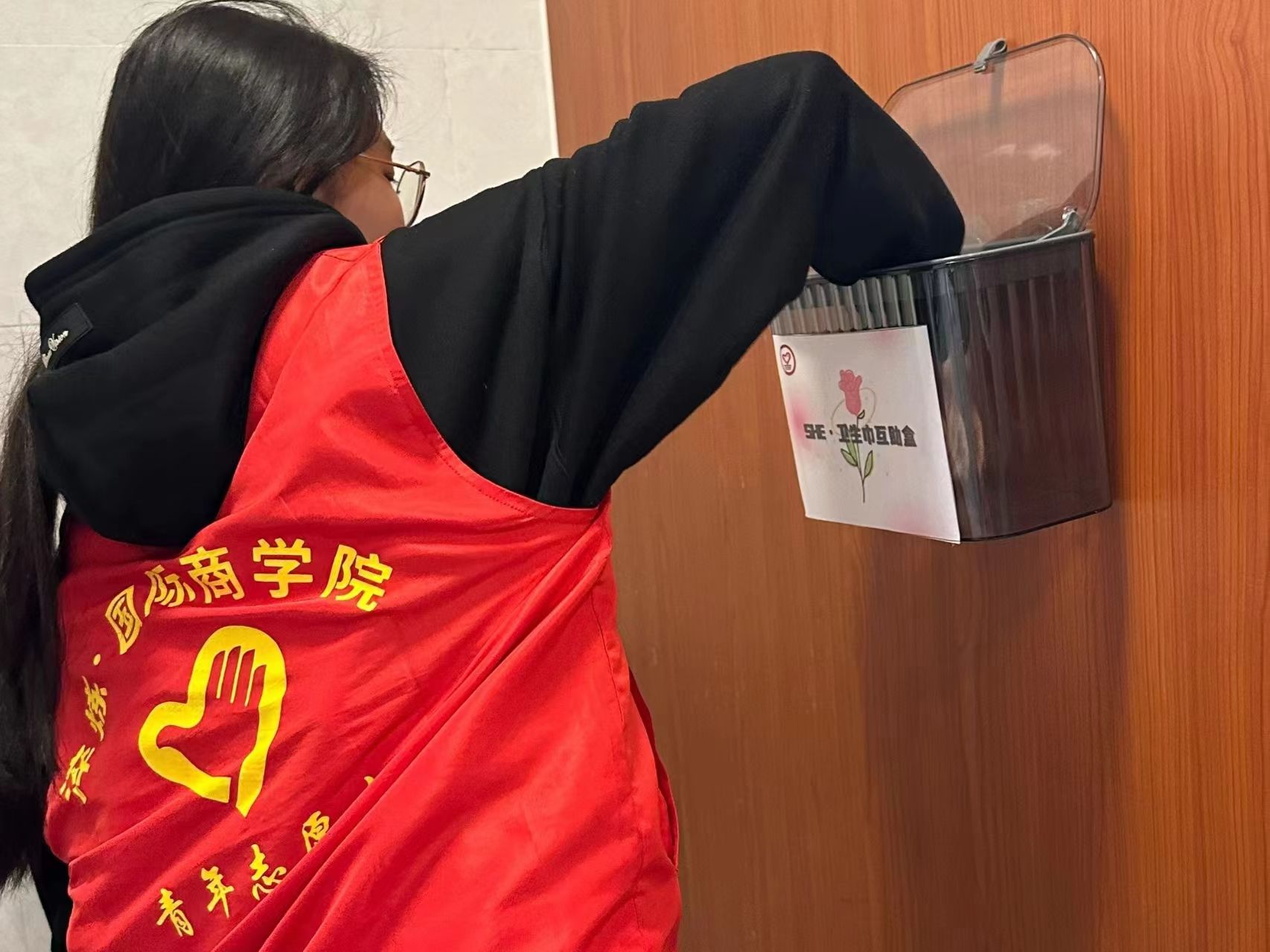 月经是每个女性都会经历的正常生理现象,而很多女性都可能会经历生理期忘带卫生巾的尴尬和无助。为了让我校女同学都能在生理期得到应有的关爱和帮助,“SHE”关爱女性志愿服务专项支队在教学楼女厕所进行卫生巾补充。希望女同学们在生理期突然到来或者忘带卫生巾的时候,能够方便地获取到卫生巾,让其感受到来自学校和社会的关爱和温暖。同时,这次活动也提高了女同学们对卫生巾使用的正确认识,消除了不必要的羞耻感和误解,让女性更加自信地面对生活。