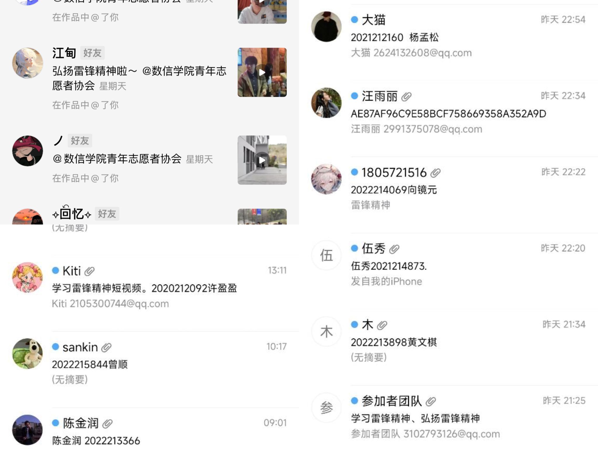 在指导教师的领导下,各位同学踊跃报名,纷纷展现个人对于雷锋精神的体会。同学们积极发挥自己的想象力,从本次短视频接力活动主题出发,思考视频创作的对象和目的,搜集素材,用心拍摄,用热情与认真,创作出一个个富含“雷锋精神”为内涵的短视频。