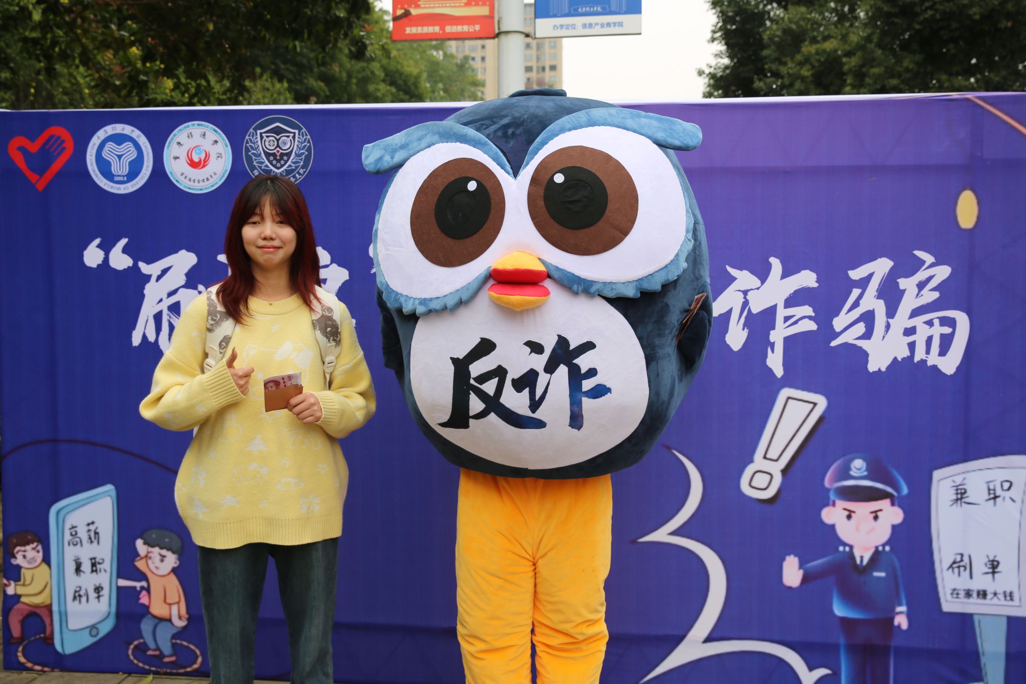“全民反诈,移我通行”活动,以多维度、多层次、多样式宣传反诈知识,针对诈骗的各种类型设置反诈摊位。在“守护钱袋子计划”中,意在通过绘画的形式,让大家奇思妙想,创作相关反诈的图品。色彩鲜艳的作品,给人以强烈的视觉冲击感,间接告诉同学们越精致复杂的东西越需要提高警惕。