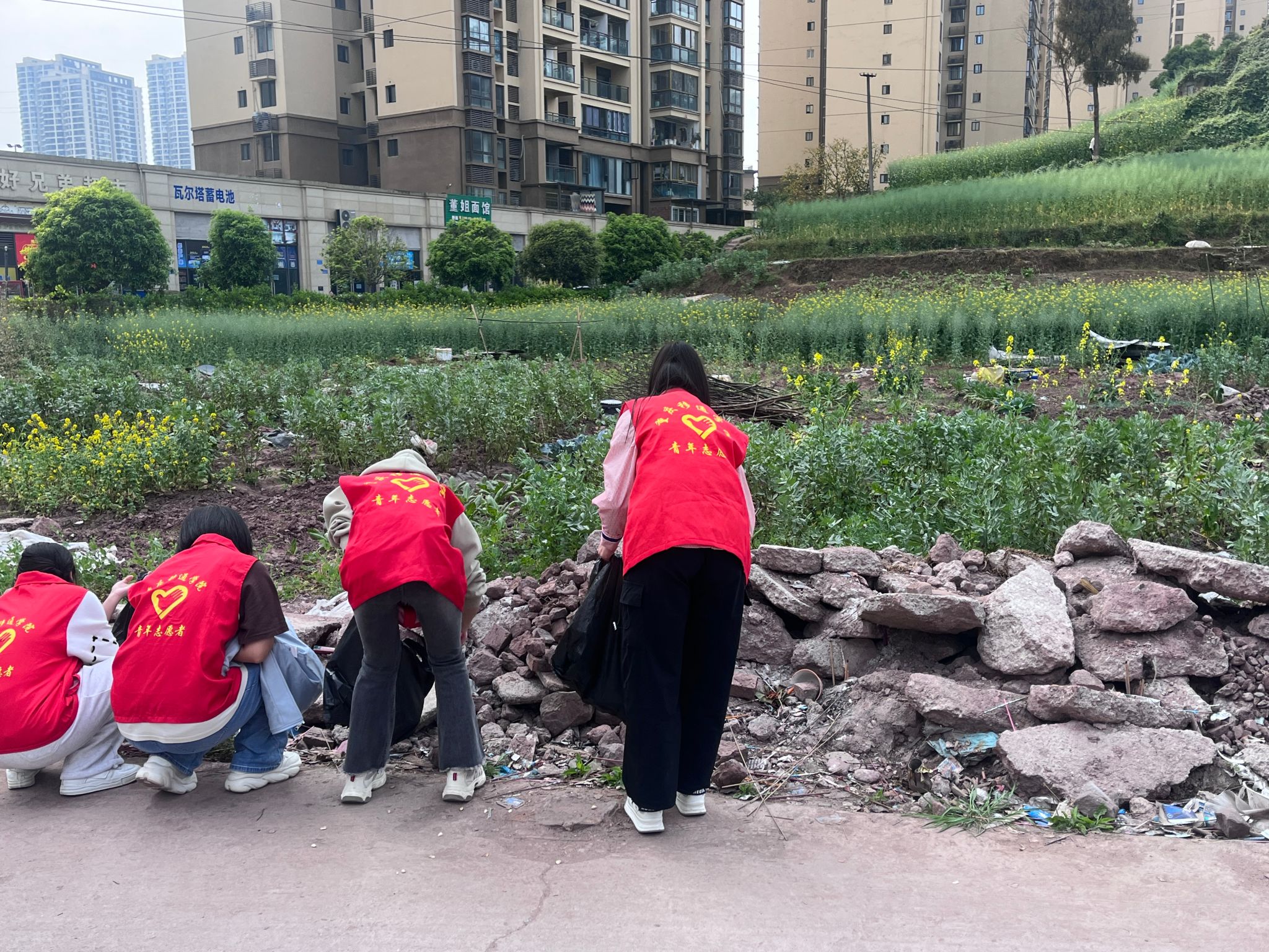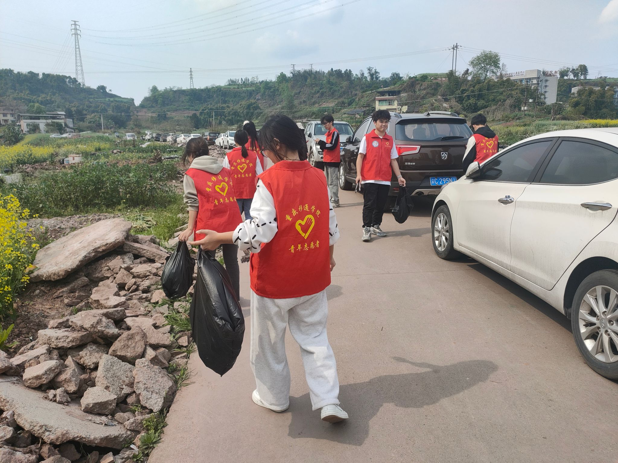 下午两点,日光穿透云雾,暑气氤氲,到达社区服务中心的志愿者们穿上红色的马甲,跟随社区工作人员的脚步,沿着人行道,经过数个十字路口行至倚靠山坡的田野间的水泥路口。水泥路向前延伸直至隐没于村落之中。水泥路两边堆积着大量垃圾,主要是废弃的塑料袋与燃烧过后剩余的烟花废物。志愿者们本次活动的任务就是清理道路两旁堆积的废物。