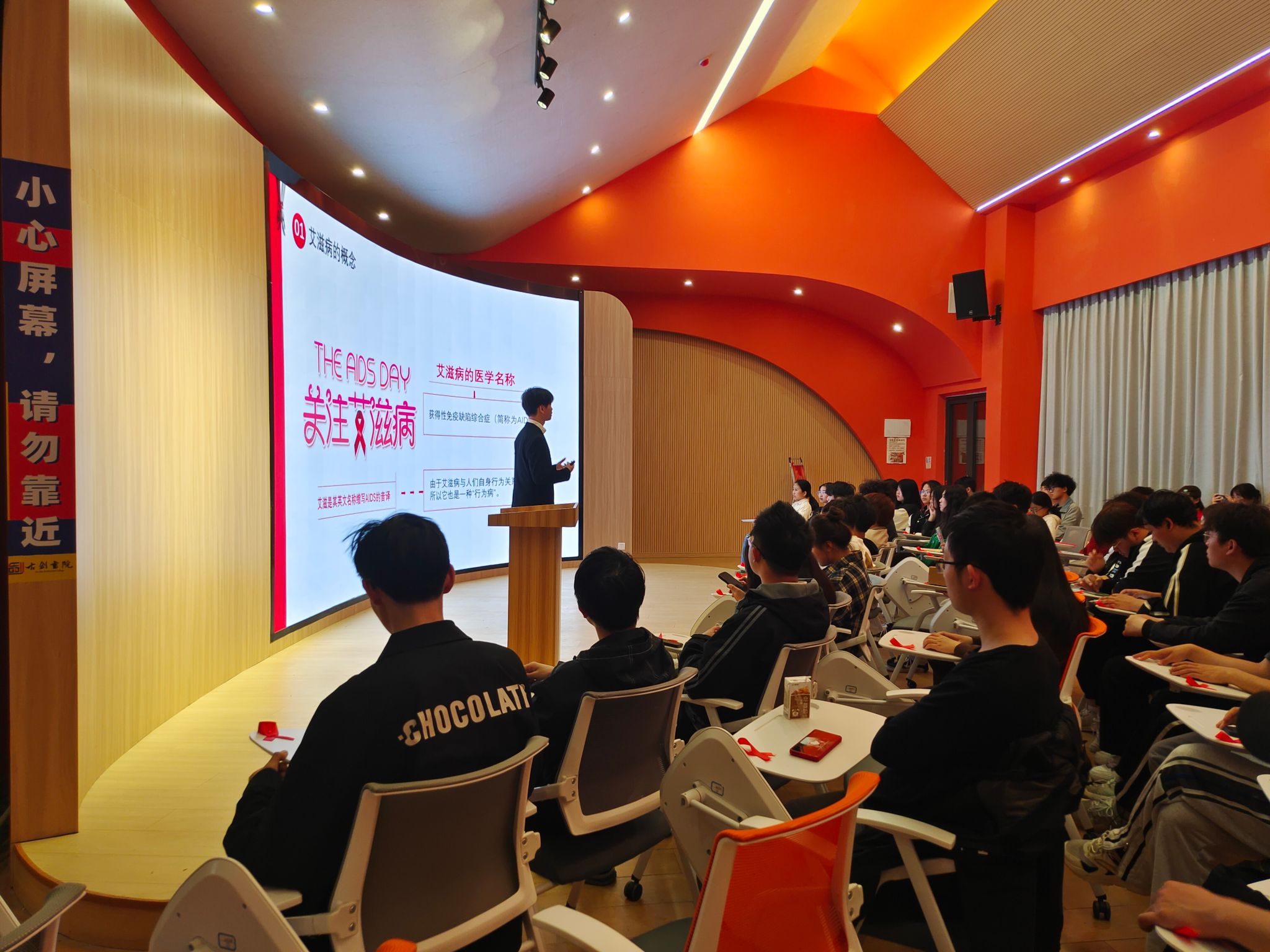 法网严密防艾侵,健康守护心相连。为提高同学们对艾滋病的了解,增强自我保护能力,引导大学生形成积极向上、文明健康的行为方式,2024年3月27日周三下午七点,天使关“艾”志愿服务专项支队联合法律研习社于古剑书院含光·报告厅举办了一场以“知法止‘艾’ 携手抗‘艾’”为主题的宣讲会。