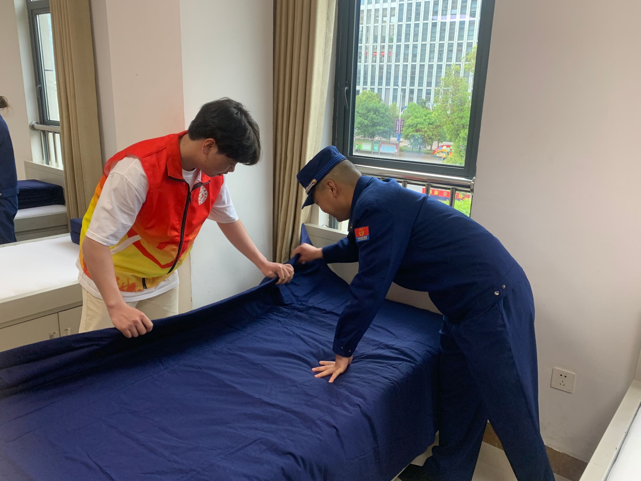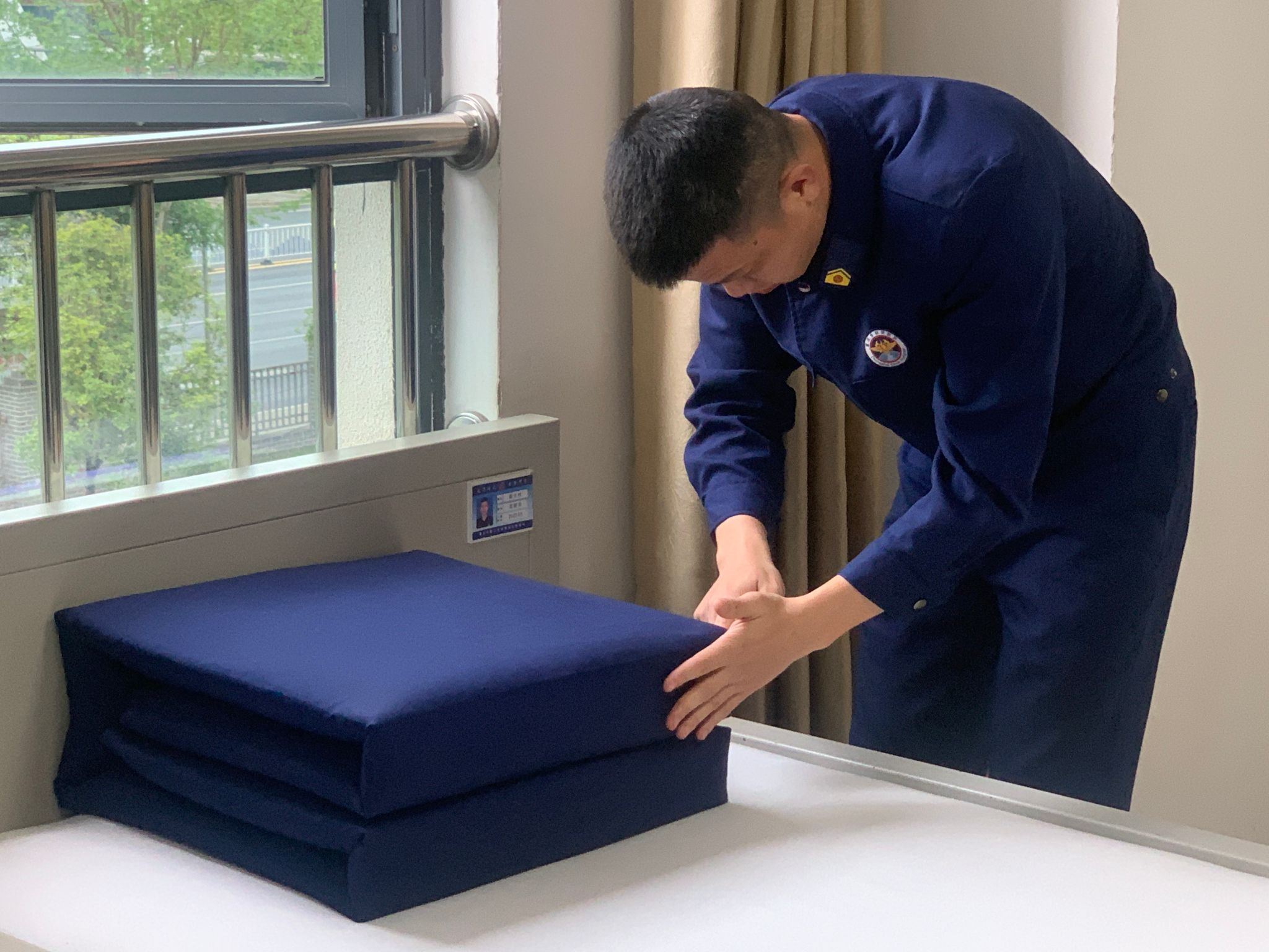 离开记史馆后,消防员引领大家前往二楼的寝室区域。当进入寝室时,同学们的视线纷纷被床上那整齐划一的“豆腐块”所吸引。为了让同学们了解如何达到这样的整理效果,特意邀请了一位消防员进行现场示范,详细展示了豆腐块的折叠方法。在消防员的指导下,学子们都充满了热情和期待,纷纷想要尝试一番。随后,消防员邀请了一位同学亲自体验,虽然无法与消防员的速度相提并论,但也成功地完成了基本的豆腐块形状。