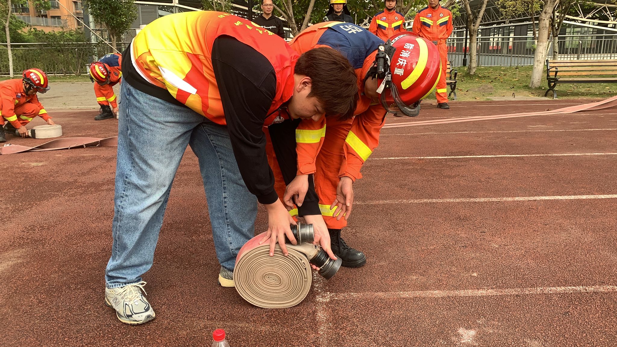 在参观的压轴环节,消防员引领众人步入消防支队的训练场地。此处,消防员们向在场的各位展示了他们精湛的专业技能,包括在短暂十秒内迅速使用云梯登高台、仅凭双手攀越四层楼高的绳索,以及迅速无误地完成一人三盘消防水龙带的连接任务。消防员们亦以极大的热情邀请众人参与体验消防水带保龄球游戏,旨在使同学们深刻理解,尽管消防水龙带的连接看似轻而易举,然实则需要高超的技巧与精准的操控。
