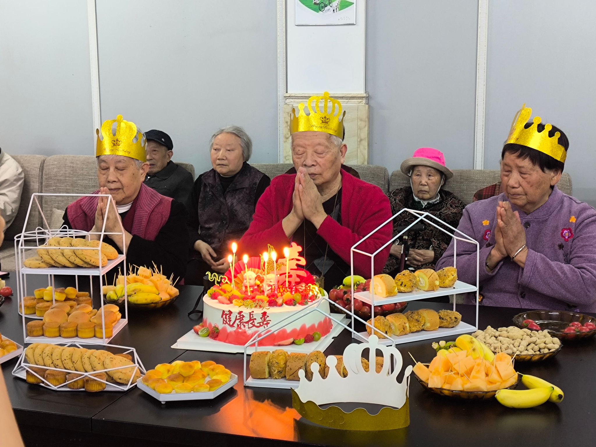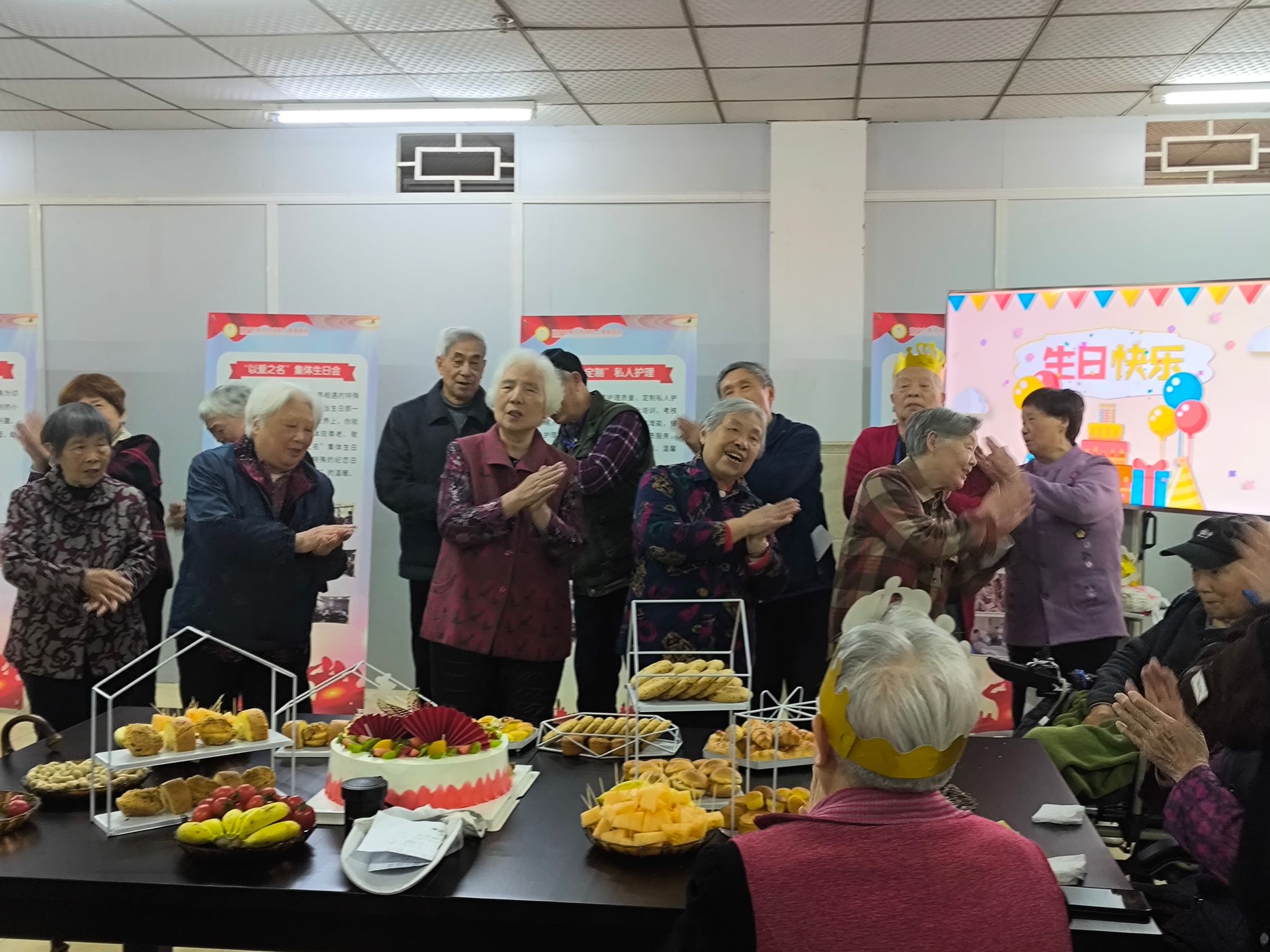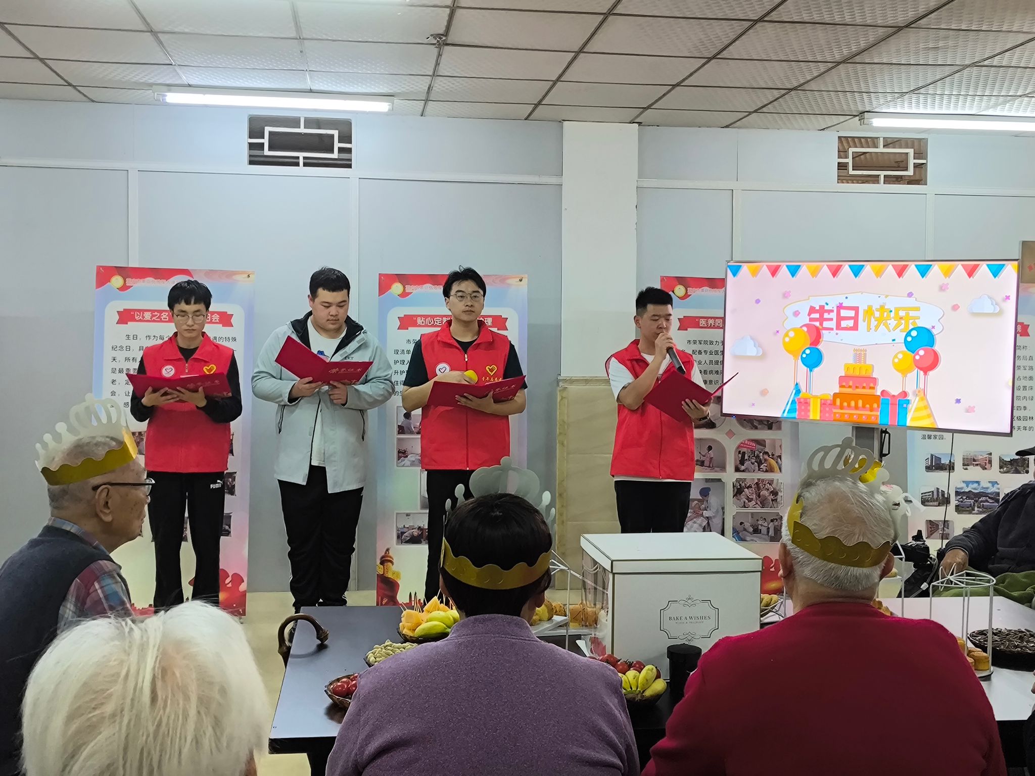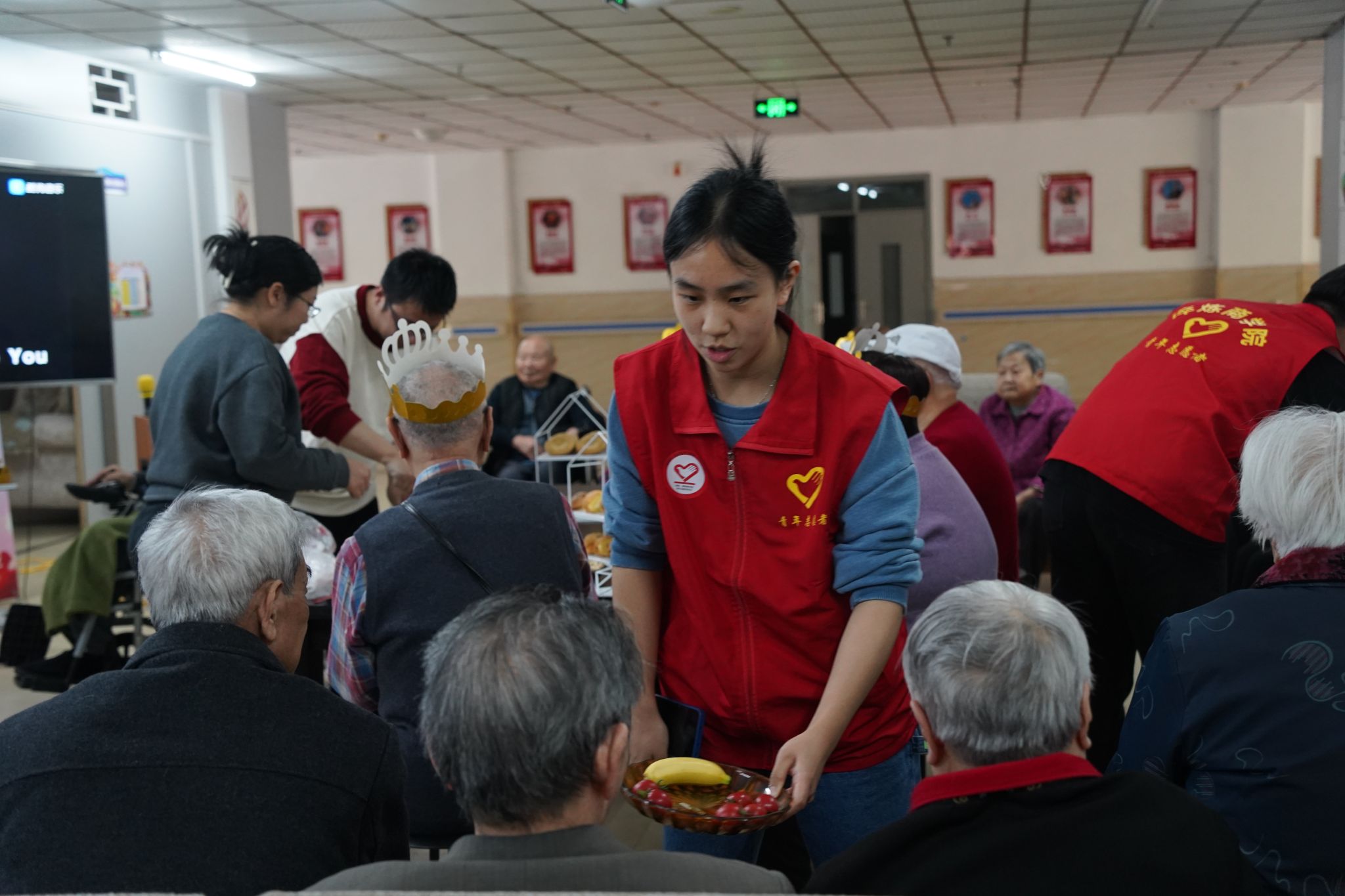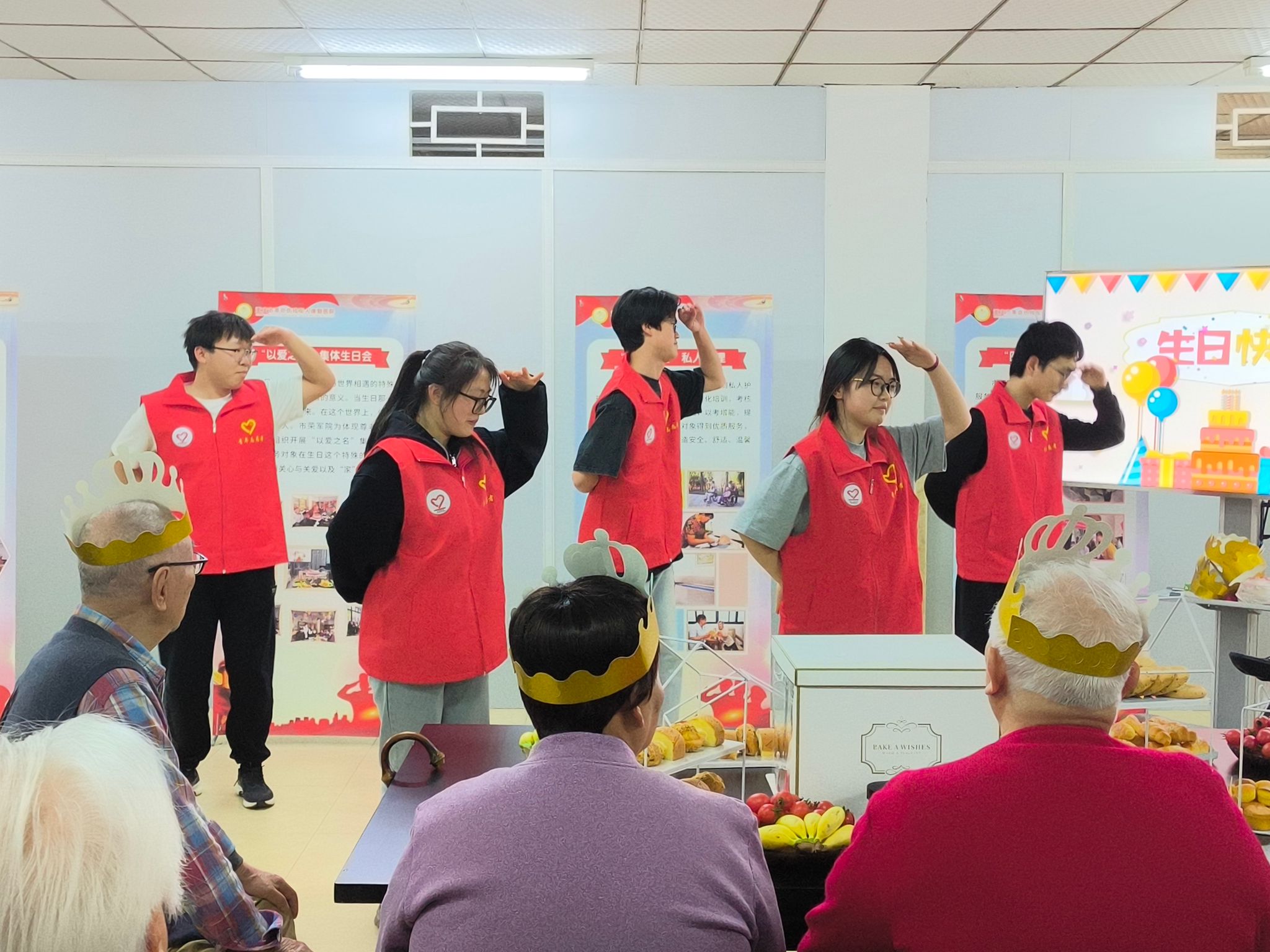 生日会在温馨欢乐的大堂中举行,随着麦克风里的一句“开始”集体生日会正式开始。老人们围坐在四周,中间则落座着今天神采奕奕的几位寿星,人群簇拥着,欢笑包裹着。志愿者们则在主持人的示意下开始第一个表演,将节目的气氛推至高潮。紧接便是歌唱表演,每一句歌词带有着浓浓的期盼,正如在场的所有人,期盼朝阳,期盼共同所向往的美好生活。节目由朗诵结尾,声声仿佛振聋发聩,让人置身那风雨飘扬的年代。