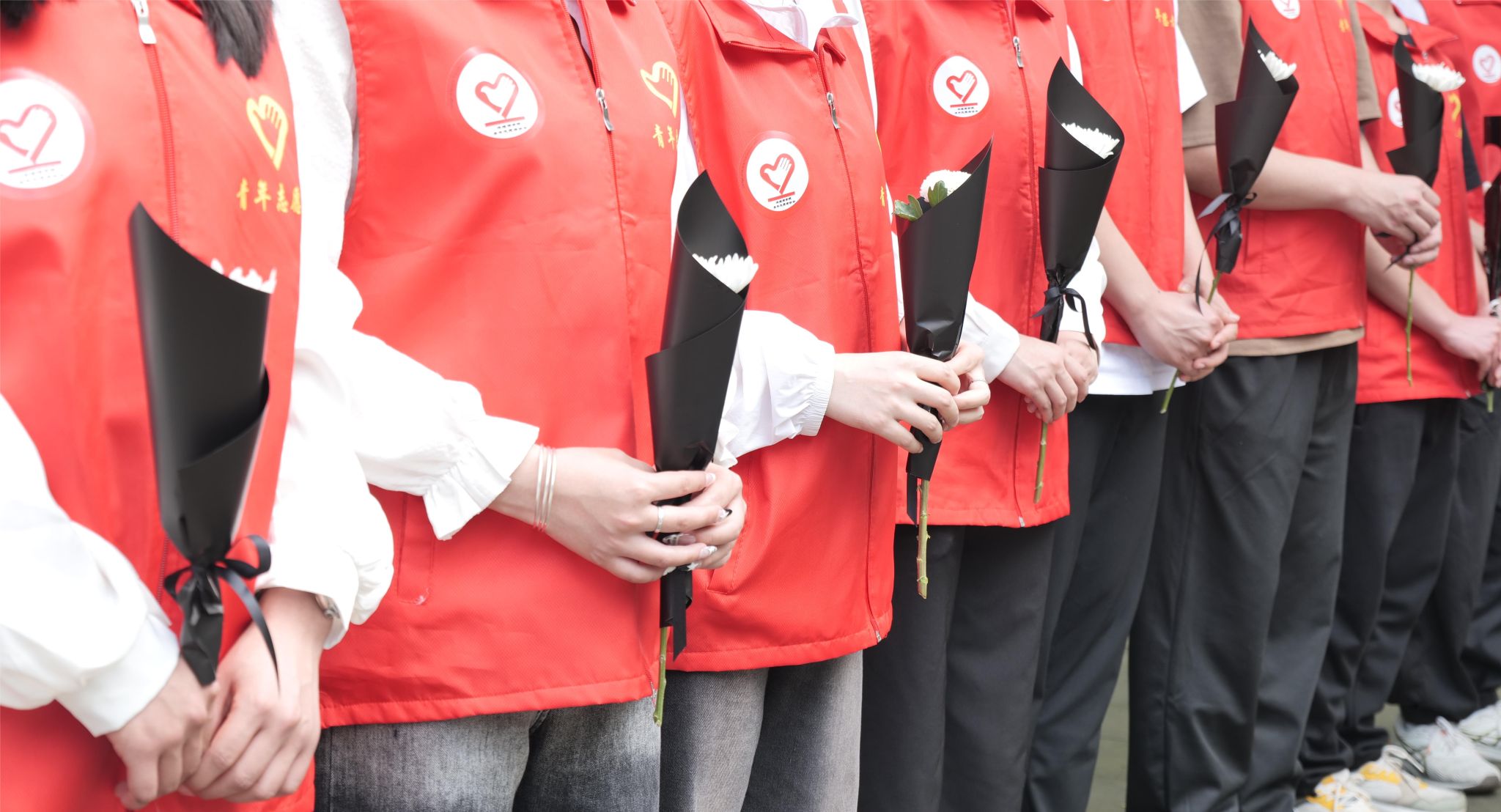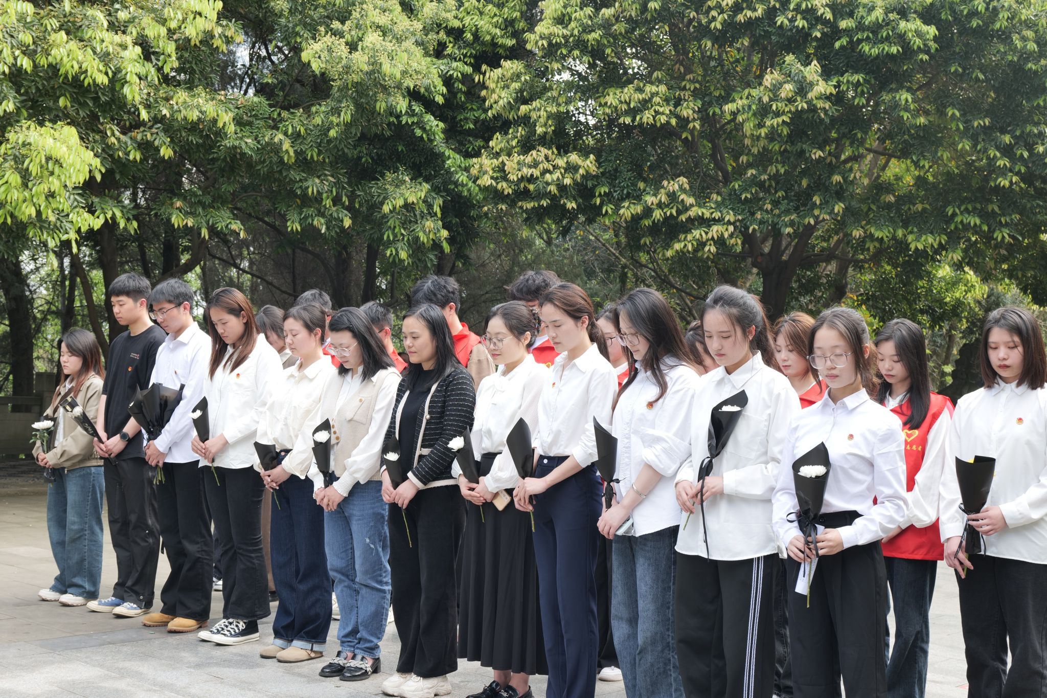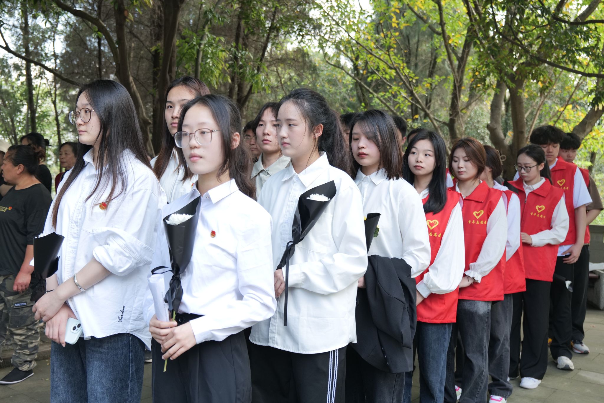 手捧菊花,整齐列队,低头静立