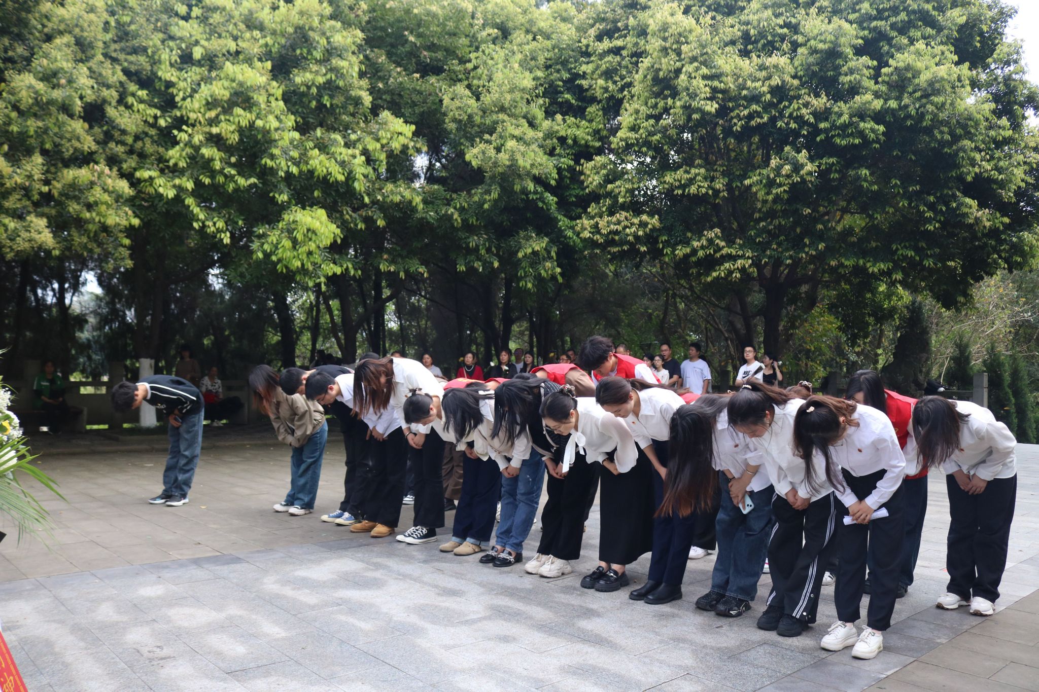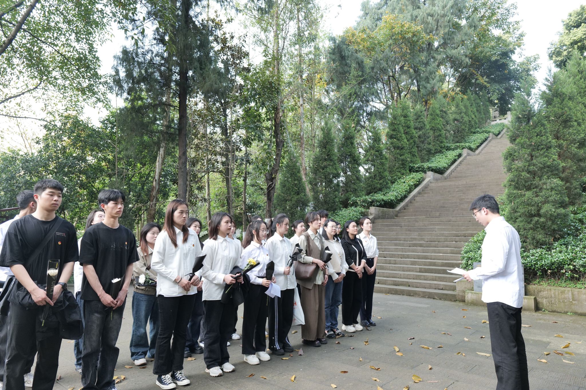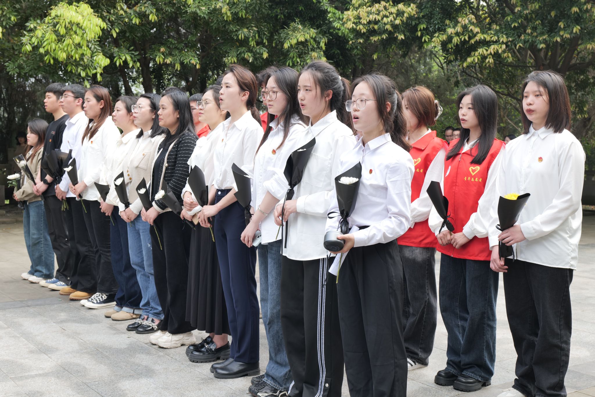 手捧菊花,整齐列队,低头静立