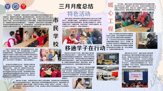 春风三月,神采飞扬。通信与信息工程学院青年志愿者协会本月共开展十一期活动,其中“移通学子在行动”板块开展八期活动,“特色活动”板块开展一期活动,“暖心工程”板块开展一期活动,“市民活动”板块开展了一期。本月活动参与人数2000余人,累计志愿时长1200余小时,受益人数3000余人。