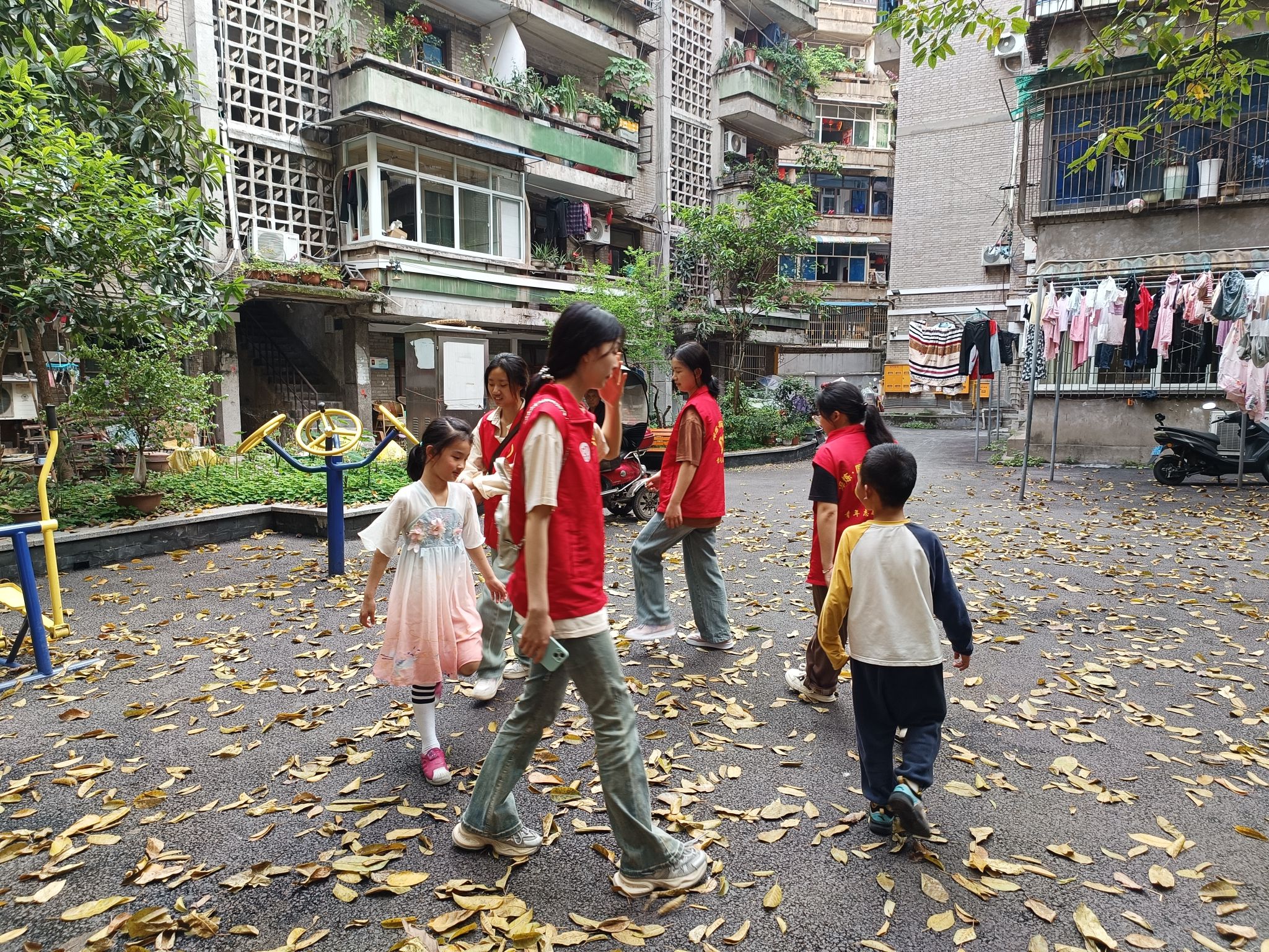 作业辅导结束后,在志愿者们的带领下,小朋友们去到户外开展小游戏。简单的“老鹰捉小鸡”,“老狼几点了”,“躲猫猫”等游戏热火朝天地进行,志愿者们与小朋友们相互配合,相互帮助,不仅调动了小朋友们的积极性,让其在课后放松心情,同时也拉近了志愿者与小朋友们之间的距离,共同度过愉快的周末时光。