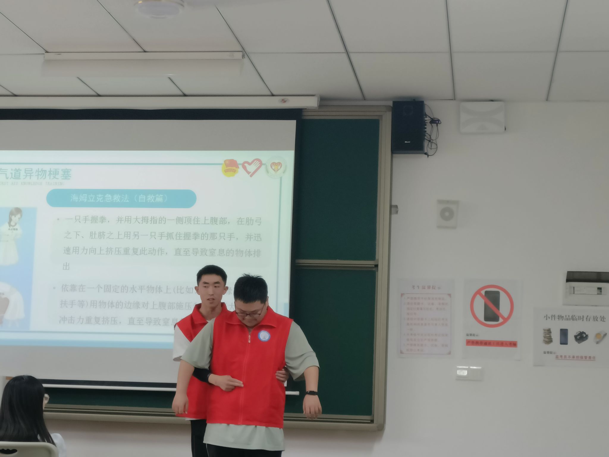 为确保同学们能够更好地掌握实际操作技能,本次培训还特别设计了志愿者急救动作展示环节。由数信青协志愿者们上台进行情景演练,生动呈现了气道异物梗塞急救专业技能动作的演示,让同学们更加清楚如何在突发情况发生时使用最合适的急救方法。在志愿者和同学们进行救助时,不仅需要扎实的急救知识和专业技能储备,还要切身处地的去检验、去践行理论,更好地践行志愿服务精神。