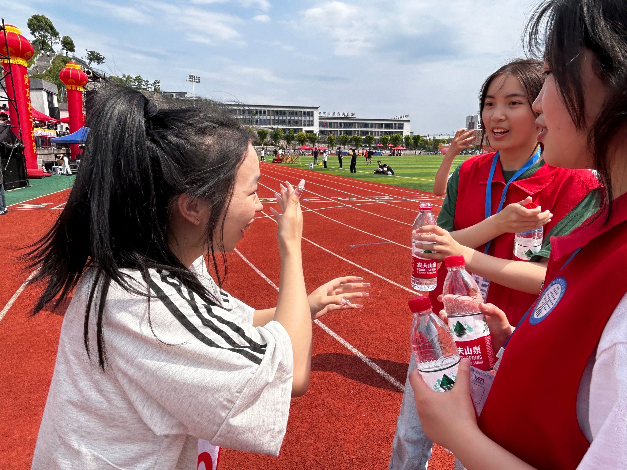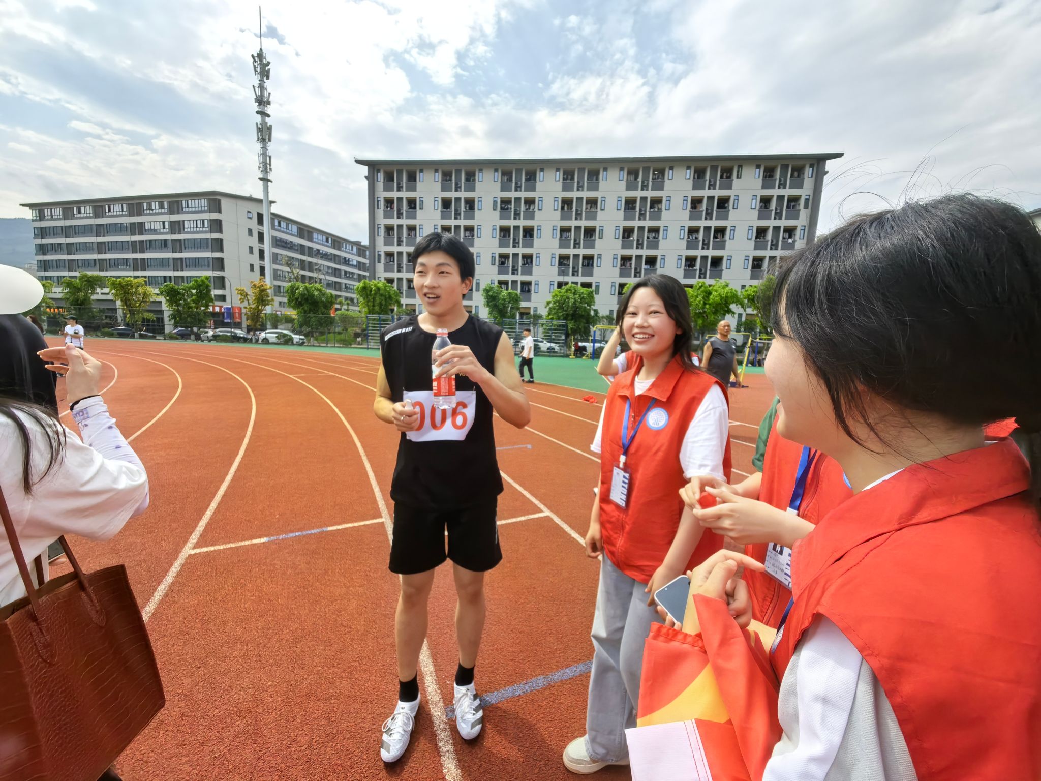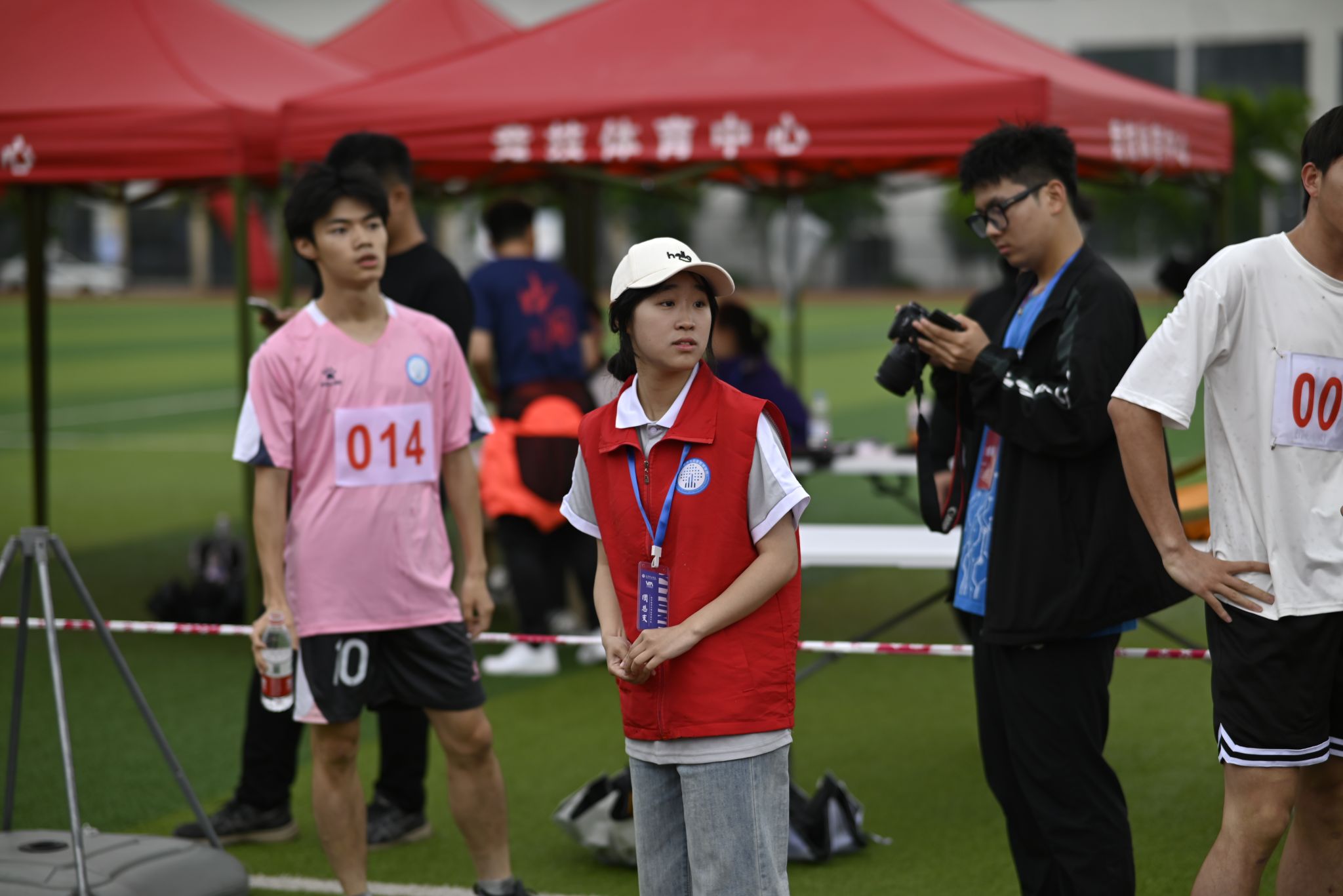 炙热阳光的照射下,广阔的运动场上,人群中的点点红,是志愿者们的迷人风姿。他们身穿红马甲,面带微笑,为参赛运动员们提供无微不至的关怀与帮助,他们手拿矿泉水、藿香正气水、葡萄糖,为运动员们加油助威,在运动场上来回穿梭,展现了志愿者们的精神风貌。当运动员穿过终点线的刹那,志愿者们一拥而上,送上坚实的臂膀、甘甜的水、暖心的关怀,让运动员们感受到数信大家庭的温暖,身穿红马甲的志愿者们始终以自己最饱满的热情帮助运动员们。