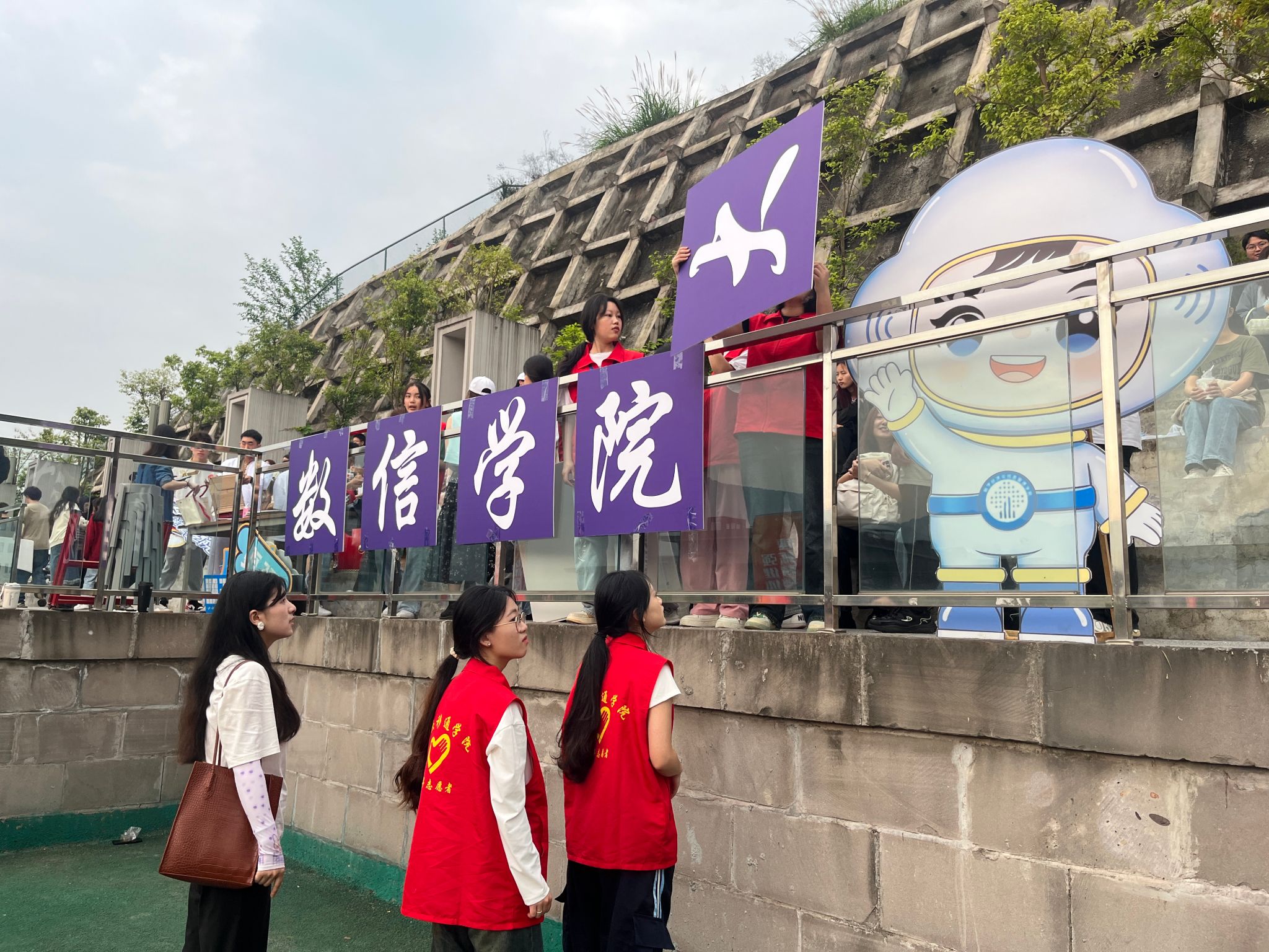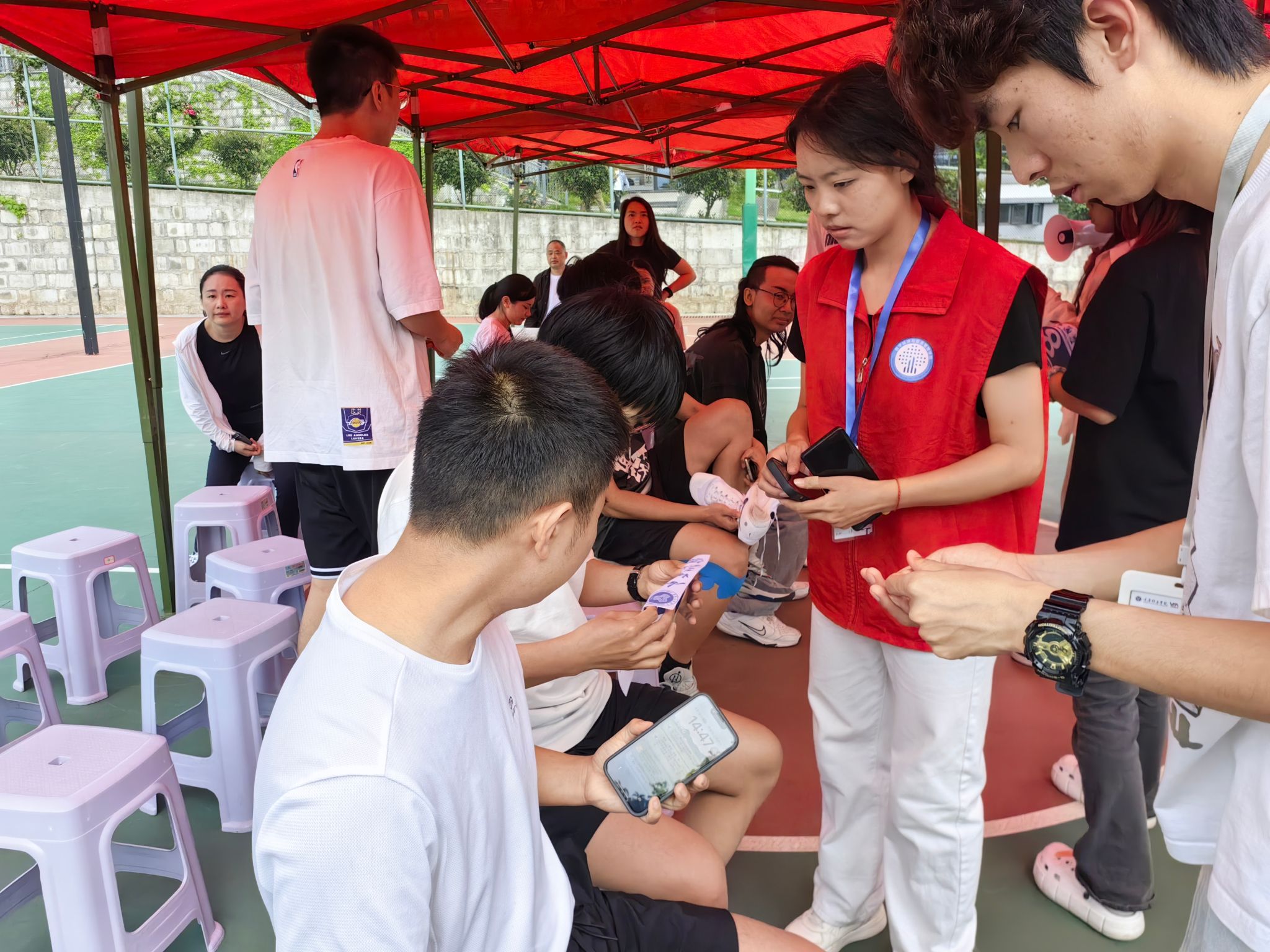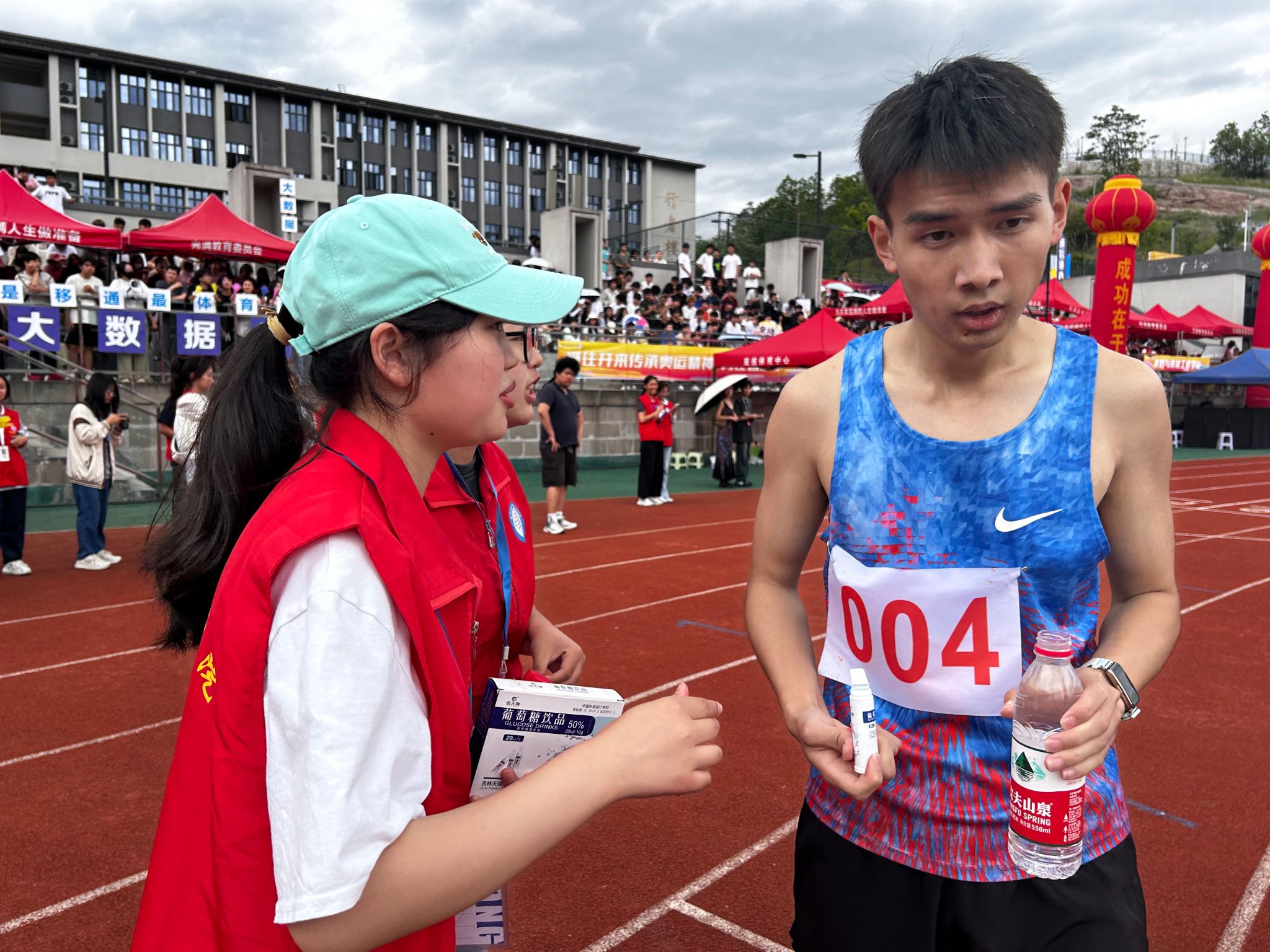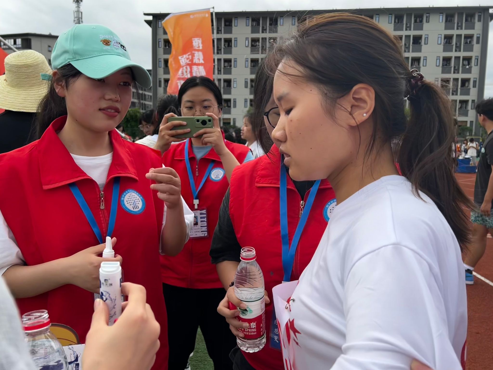 炙热阳光的照射下,广阔的运动场上,人群中的点点红,是志愿者们的迷人风姿。他们身穿红马甲,面带微笑,为参赛运动员们提供无微不至的关怀与帮助,他们手拿矿泉水、藿香正气水、葡萄糖,为运动员们加油助威,在运动场上来回穿梭,展现了志愿者们的精神风貌。当运动员穿过终点线的刹那,志愿者们一拥而上,送上坚实的臂膀、甘甜的水、暖心的关怀,让运动员们感受到数信大家庭的温暖,身穿红马甲的志愿者们始终以自己最饱满的热情帮助运动员们。