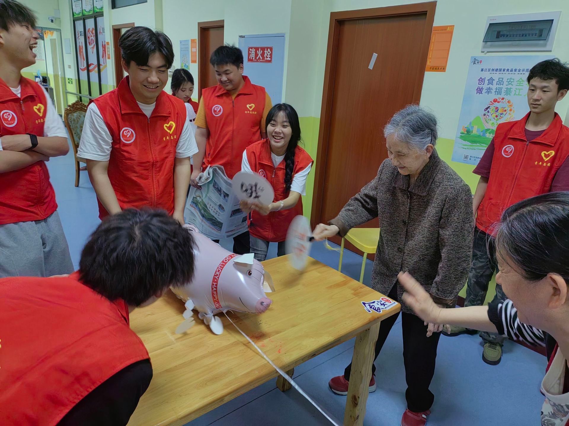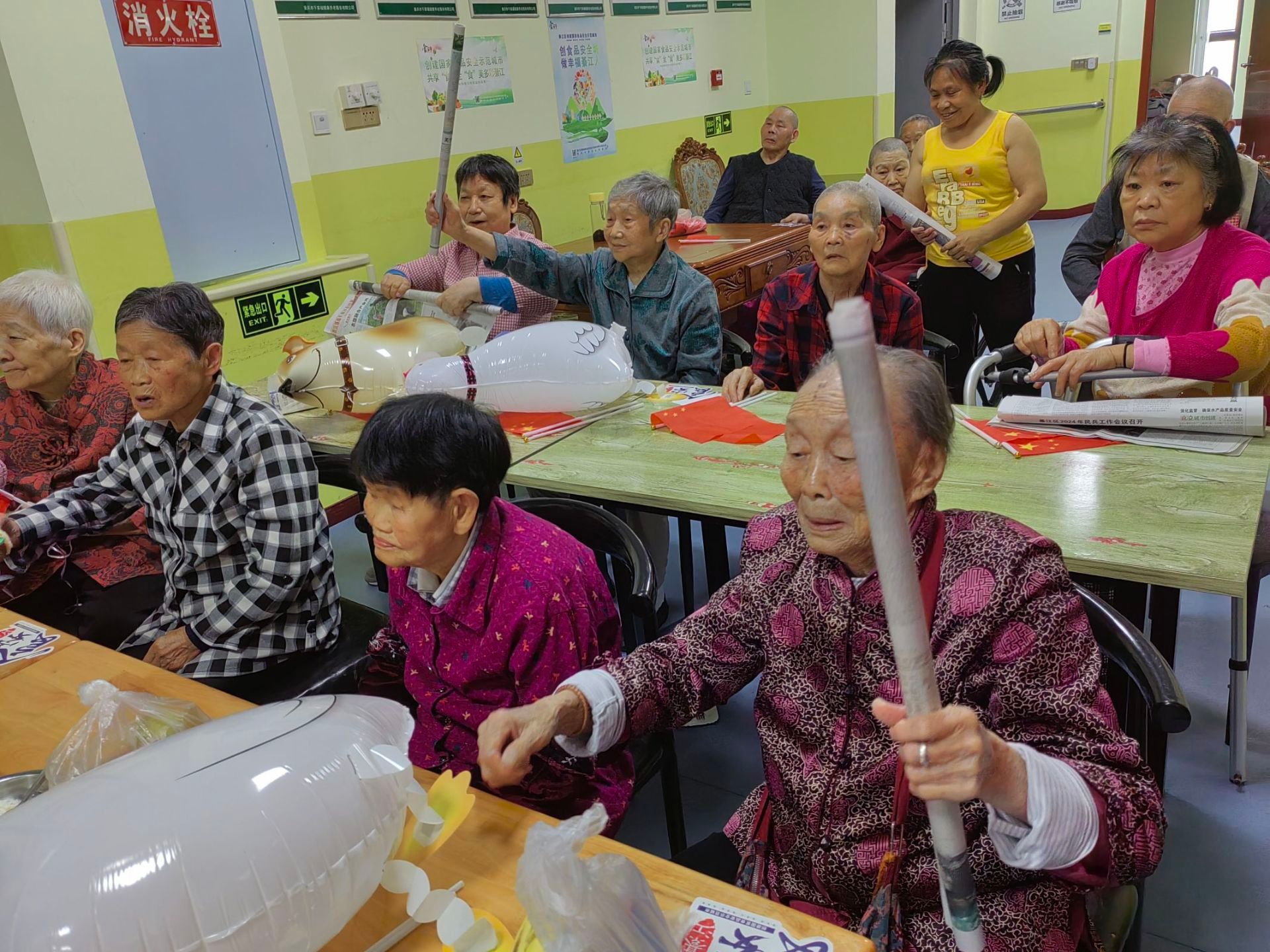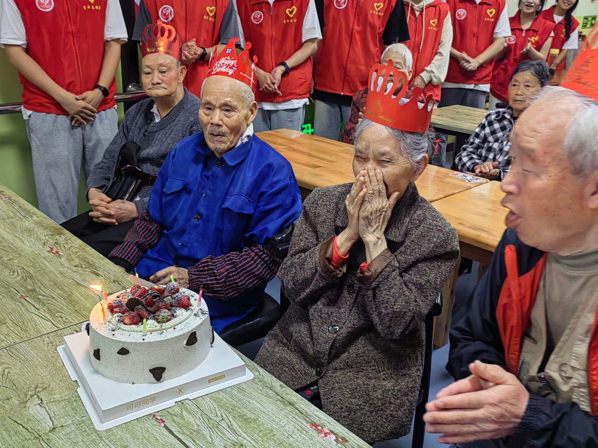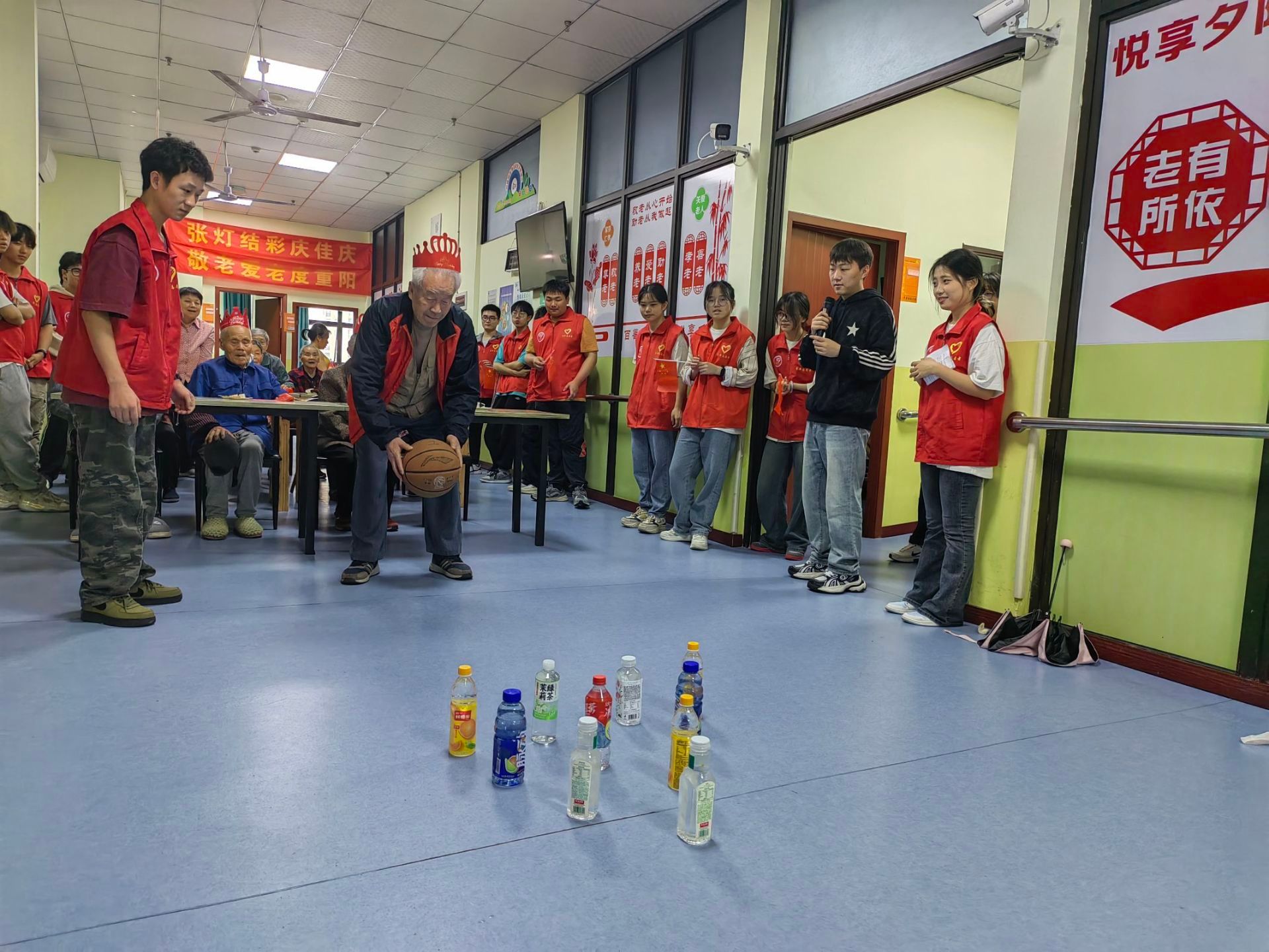 活动伊始,老人们与志愿者共同为四位高寿老人庆祝生日,气氛欢快笑声不断。随后志愿者们带领老人们一起合唱歌曲《祝你生日快乐》,在志愿者与护工的陪伴下每位老人脸上洋溢着灿烂的笑容。运功会开始,每位老人从积极参与其中,让水瓶被击倒,到最后恋恋不舍这个游戏。