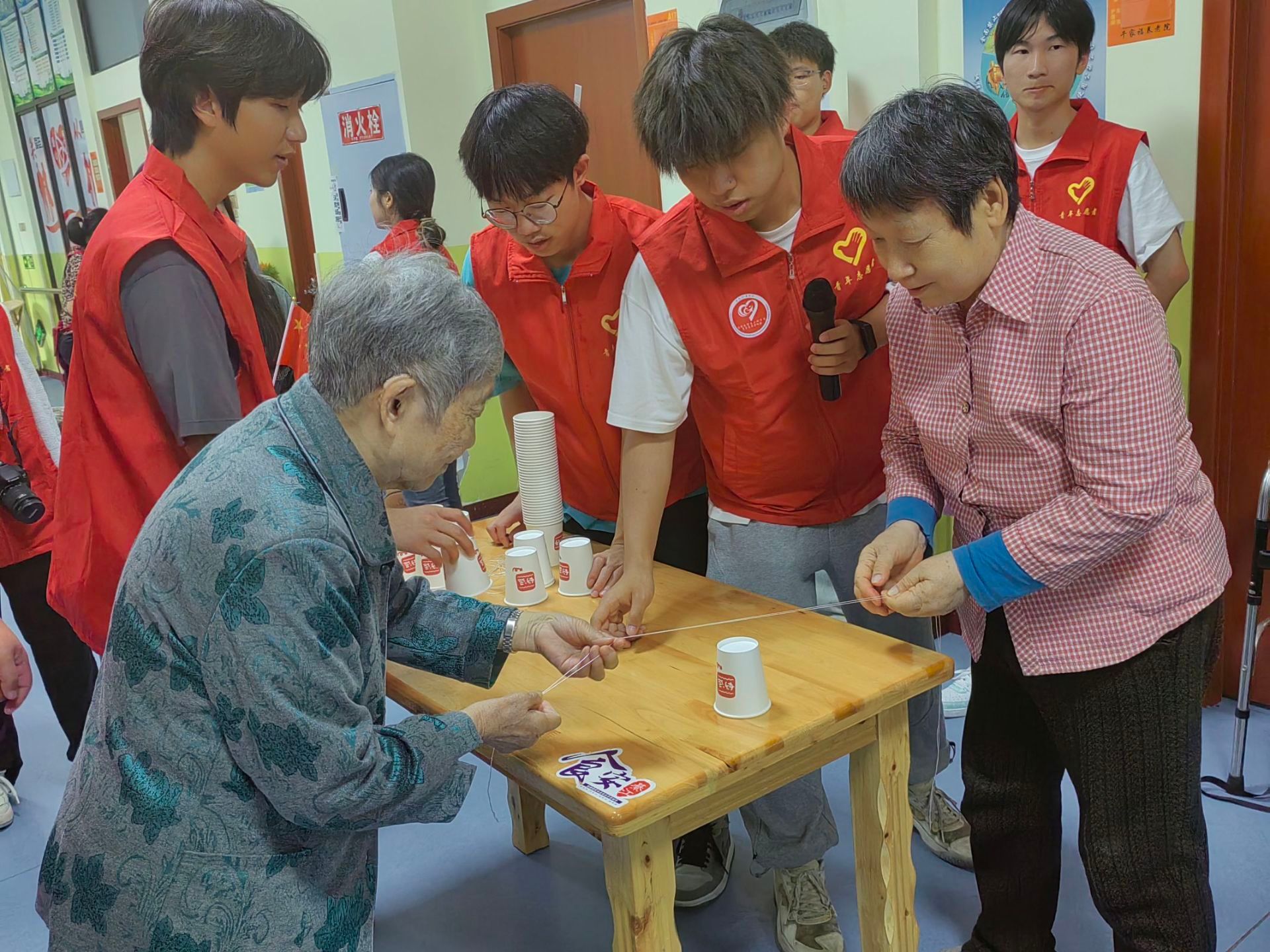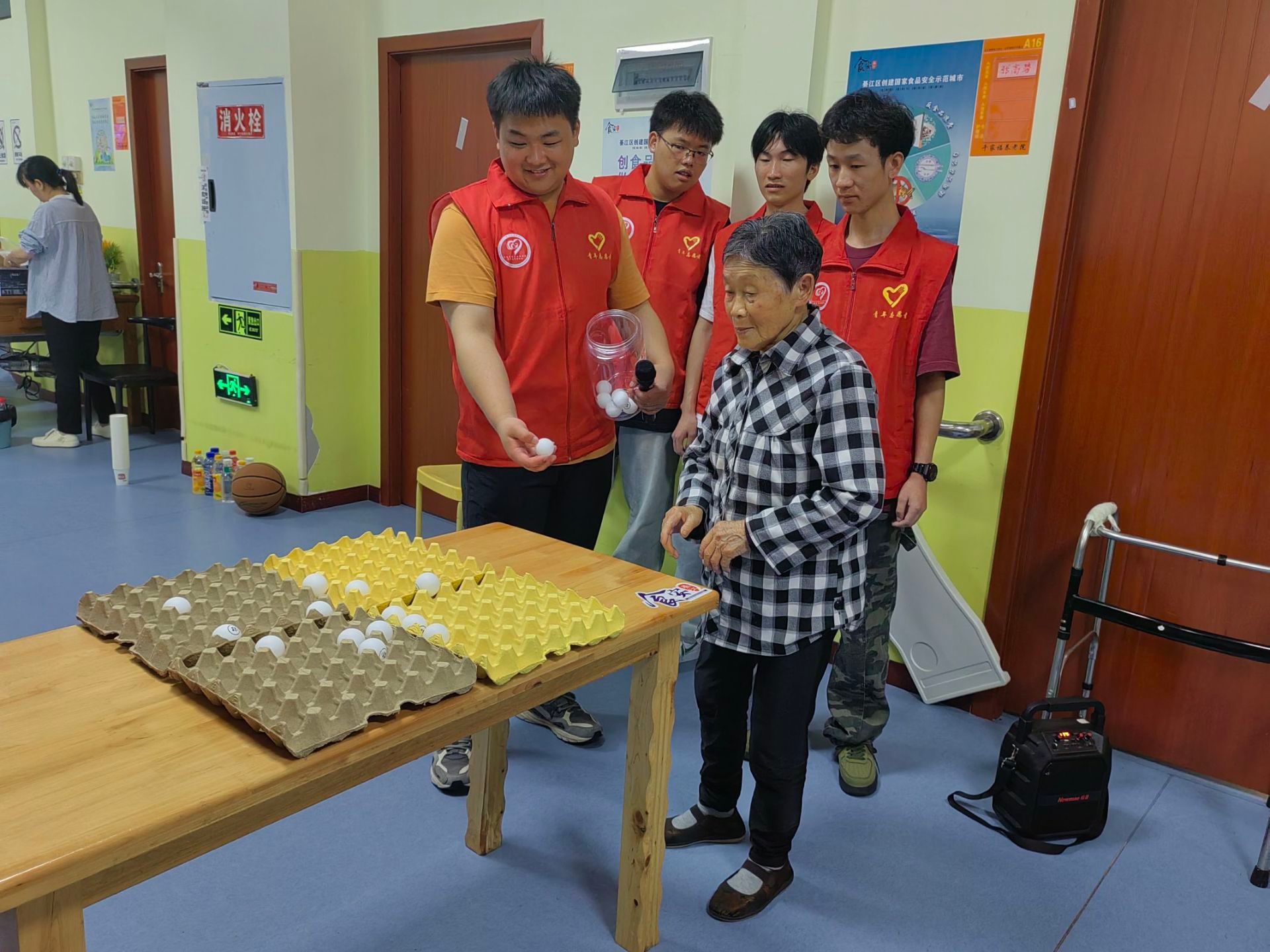 在接下来的小游戏中需要两个老人一起完成,老人们同时扔掷乒乓球到蛋壳之中。这有利于老人们集中他们的注意力,老人注视着手中的球力图将所有的乒乓球扔进去,在游戏中志愿者们耐心讲解并教授技巧。第三个游戏由两名老人携手完成纸杯叠罗汉,当完成后,老人的心中的快乐与骄傲自豪在此刻迸发,如一股股暖流涌上每个人的心头.