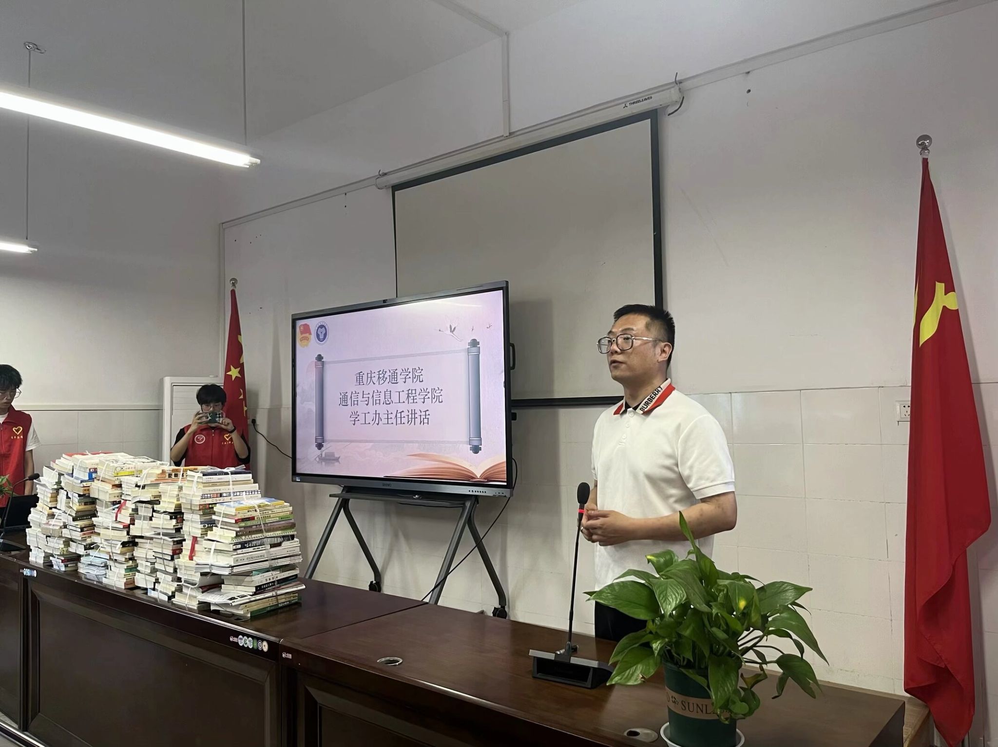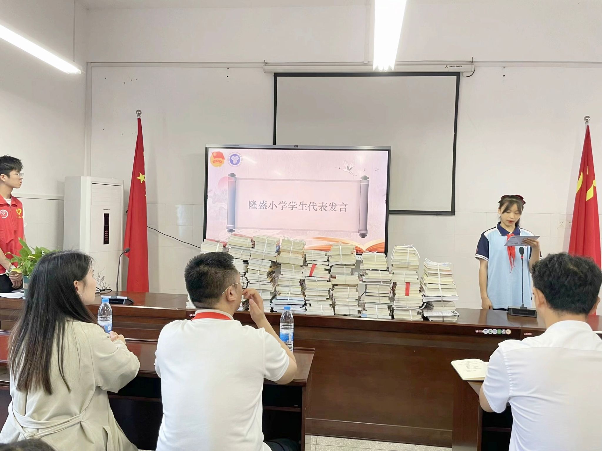 第三部分,各方代表讲话。“每一本书都是一份爱心,每一本书都将为我们带来希望与温暖”,隆盛小学的学生代表唐栩艳同学满怀感激之情发表了感言,字句间流露出对知识的渴望与对捐赠者的深深谢意。通信与信息工程学院学工办主任胡戈立老师在讲话中向同学们介绍了我校四位一体双院制+特色教育育人模式,结合此次活动目的提出三点希望:一是希望此次带来的书籍促进同学们主动阅读、多阅读,增长见识;二是以此为契机,促进基础教育与高等教育之间素质教育的联动融合;三是希望同学们能继承此次志愿服务精神,传递爱心。隆盛小学王远川校长也对大学生志愿者们的到来表达了由衷的感谢和赞赏,他表示,这些书籍将成为小学教育的宝贵资源,助力孩子们拓展视野、提升阅读能力,为他们的未来奠定坚实基础。