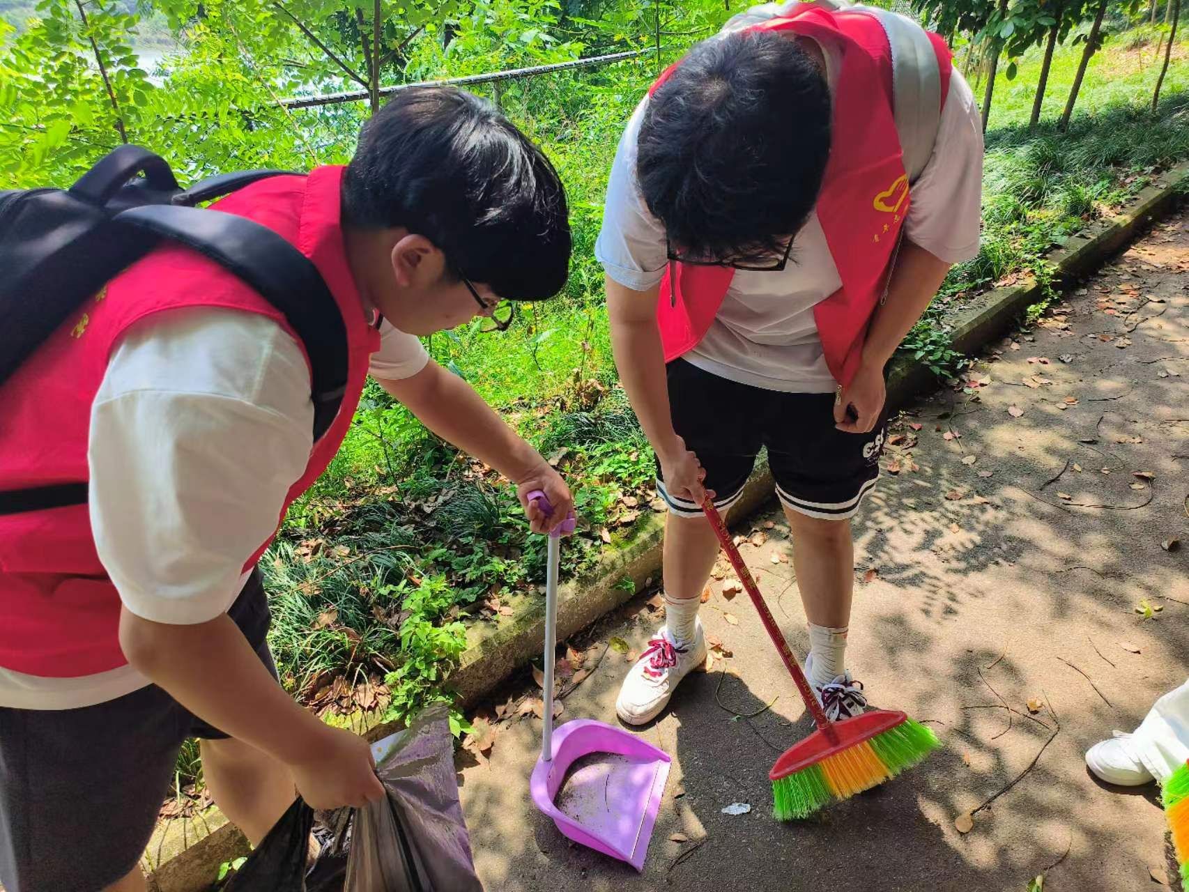 在活动开展前,志愿者在学校门口集合后,结伴而行前往活动地点。活动现场,首先由支队长帅苏强同学对大家进行安全注意事项讲解,提醒志愿者们注意个人安全。随后,志愿者们身穿红马甲,手持环保袋、钳子等工具,对河边杂草、散落在河岸及周边上的垃圾开展清理和集中整治行动,做到发现一处、整治一处。志愿者们配合默契,不怕辛苦,有条不紊地清理岸边废弃物和白色垃圾。同时对过往的居民进行文明劝导,宣传环境保护知识,介绍如何正确处理生活垃圾,为什么要减少塑料使用,以及垃圾分类的重要性。这些知识点虽然简单,但却是构建绿色生活方式的基石。居民们在聆听中不时点头,有的还主动加入到清洁队伍中,共同参与这场环保实践,让涪江沿岸环境变得更洁净、更优美。