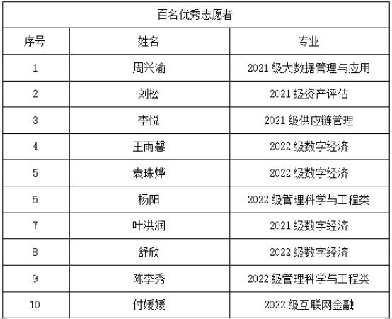为彰显新时代新青年风采,激发广大青年跻身志愿服务行列,积极发挥优秀个人榜样示范及引领作用,推动我院志愿服务事业的长远发展。通过对各青年志愿者的志愿时长认定、在志愿服务中的贡献程度,以及由学工副院长任瑞娟老师、团总支书记和志愿服务板块指导老师的评选下,现决定推选何丹为十大杰出青年志愿者,周兴渝、刘松、李悦等十名同学为百名优秀志愿者,具体名单如下(排名不分先后):