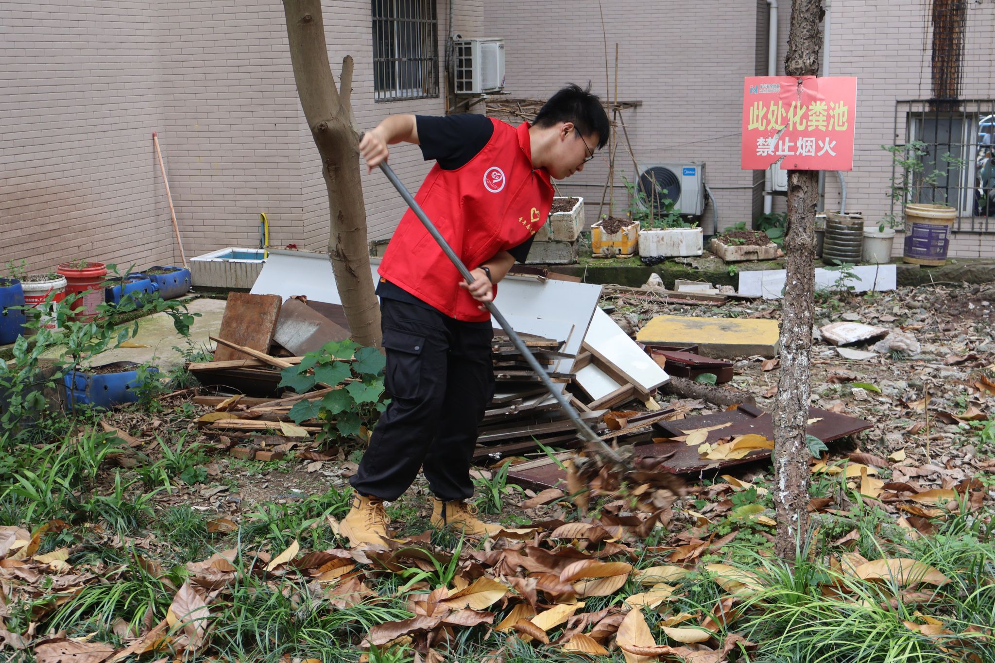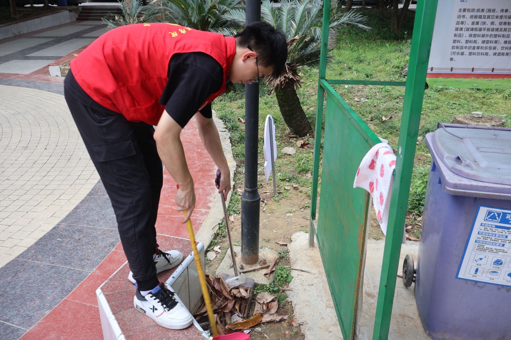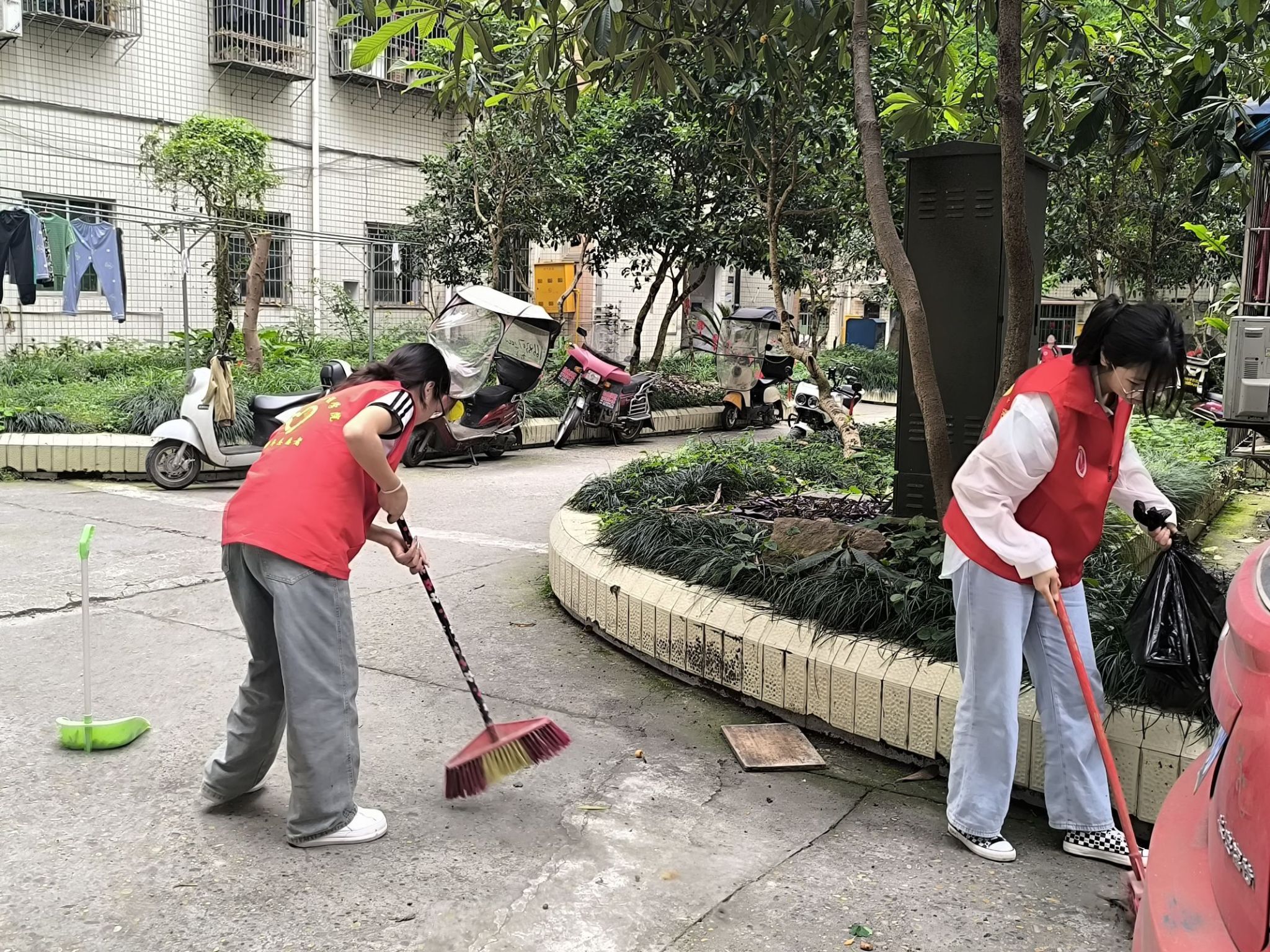志愿者们早早地集结完毕,身穿统一的志愿服,手持清洁工具,分工明确,带着不怕困难的精神,共同走进社区,两两搭配分别负责清扫楼道和整理小区绿化带。楼道内的志愿者负责擦拭公共设施,清理着垃圾和杂物,楼外的志愿者负责整理绿化带,清除社区各处的小广告,增添社区形象。很快,社区便焕然一新,街道变得干净整洁,墙角的蜘蛛网不知所踪,公共设施焕然一新,绿化带也变得井然有序。