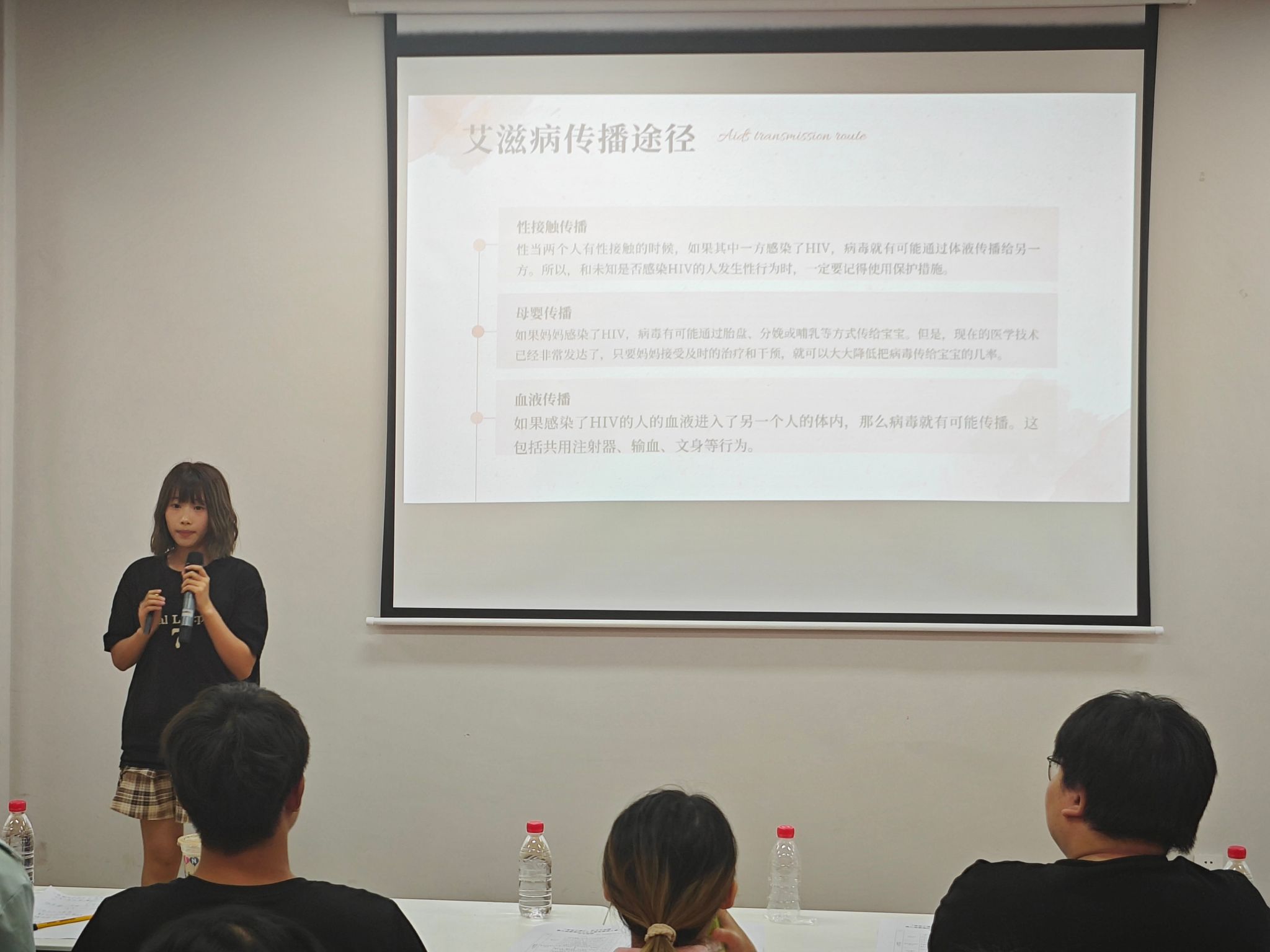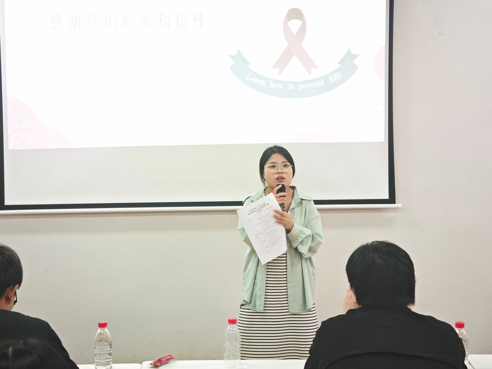 决赛现场,每位选手都自信大方地展示、讲解自己的PPT,并通过短小精干的宣传视频,向听众呈现了毒品和艾滋病的危害、传播途径以及预防措施等关键知识。选手们各显其能,有的向我们科普了各类毒品,如传统毒品海洛因、大麻等,又或新型毒品k粉等,让我们对毒品的认识更加清晰;有的收集了市面上的一些善于伪装在日常生活中的毒品,如“小熊饼干”“跳跳糖”“口服液”等,让我们提高对毒品的警戒度;有的巧妙设计,提问有关毒品种类和艾滋病感染途径的问题,既让PPT的讲解更加丰富,又活跃了气氛;有的则举例各类事实,说明了艾滋病具体的传播方式,并强调普通身体接触不会传播艾滋病,引导观众拒绝歧视。