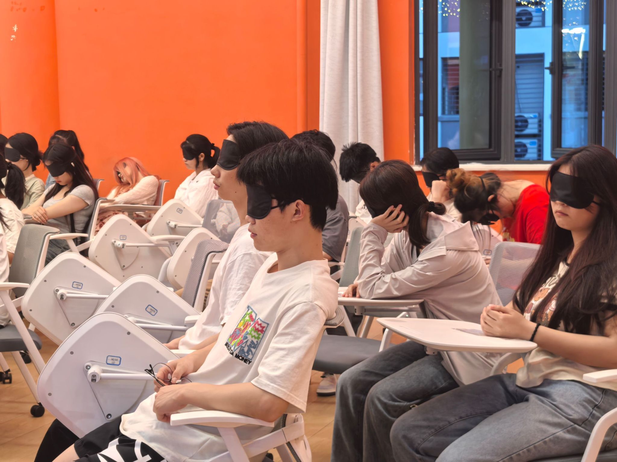 当你失去光明,世界仿佛变成了一幅深邃而神秘的画卷,被浩渺的黑暗无声地覆盖。活动序幕拉开,在志愿者们的帮助下,同学们戴上眼罩,用耳朵去倾听、去感受这熟悉又陌生的世界。一时间,同学们都沉浸在自己的感受之中,去在黑暗中寻求光明,在迷惘里找到自信,他们分享着那些深深触动人心的瞬间,去感受着残疾人士的不易。这种深入骨髓的体验让同学们对残疾人的现状有了更深的理解,他们需要的不仅仅是同情和怜悯,更是尊重和理解。