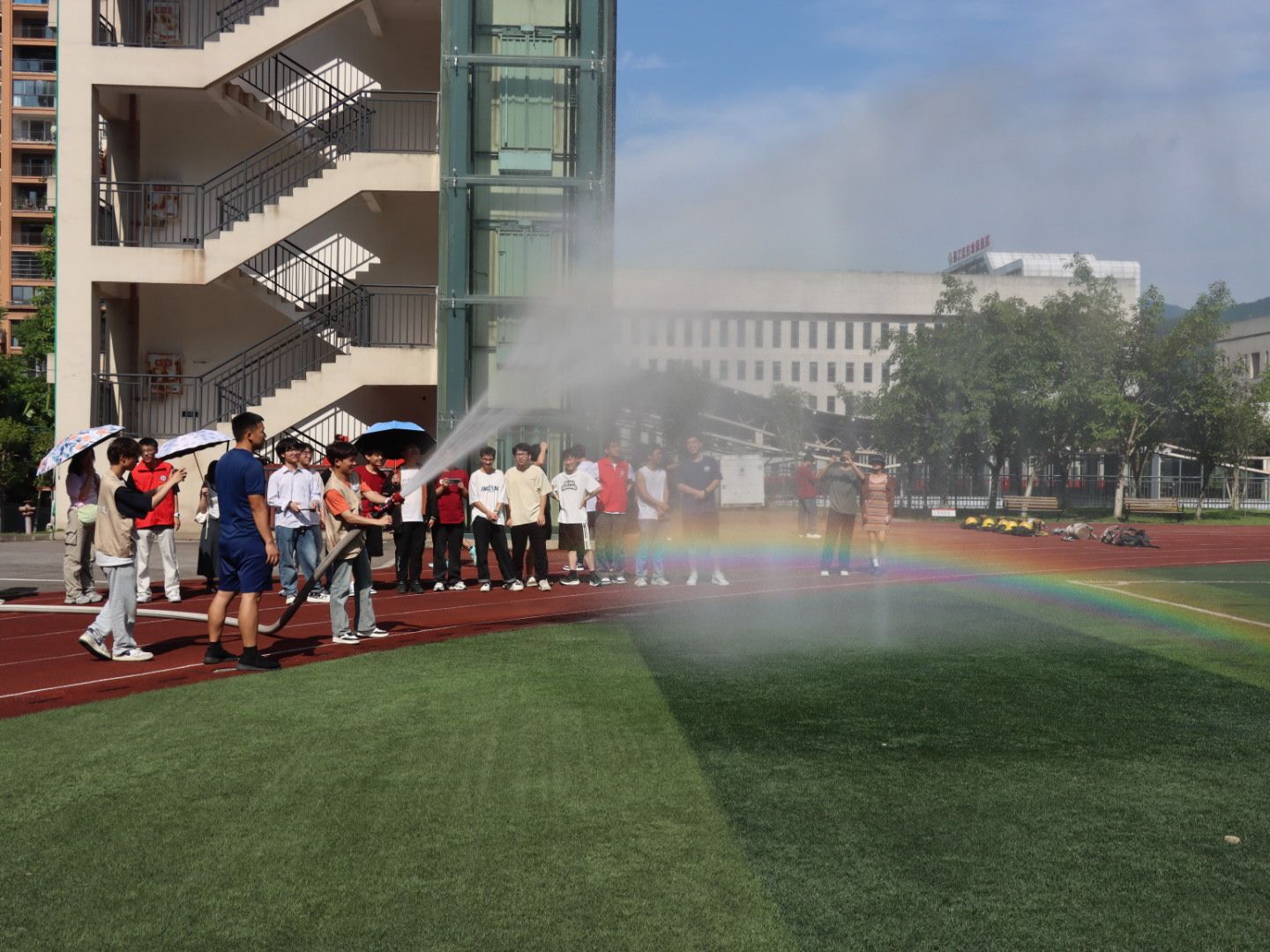 “沉浸式”体验消防栓喷射水柱。消防员引导志愿者来到开阔的训练场地,进一步指导大家如何在火灾发生时进行消防栓的使用。直流模式,通常用于远距离灭火;喷雾模式,适用于大面积的火场和防止火势蔓延;泡沫模式,适用于液体燃料火灾,隔绝空气……朱班长一边讲解一边教我们实践,多功能喷枪喷出的水花与太阳光结合形成了一道绚烂的彩虹,这是一群“大朋友”和一群“小朋友”的真情传递。