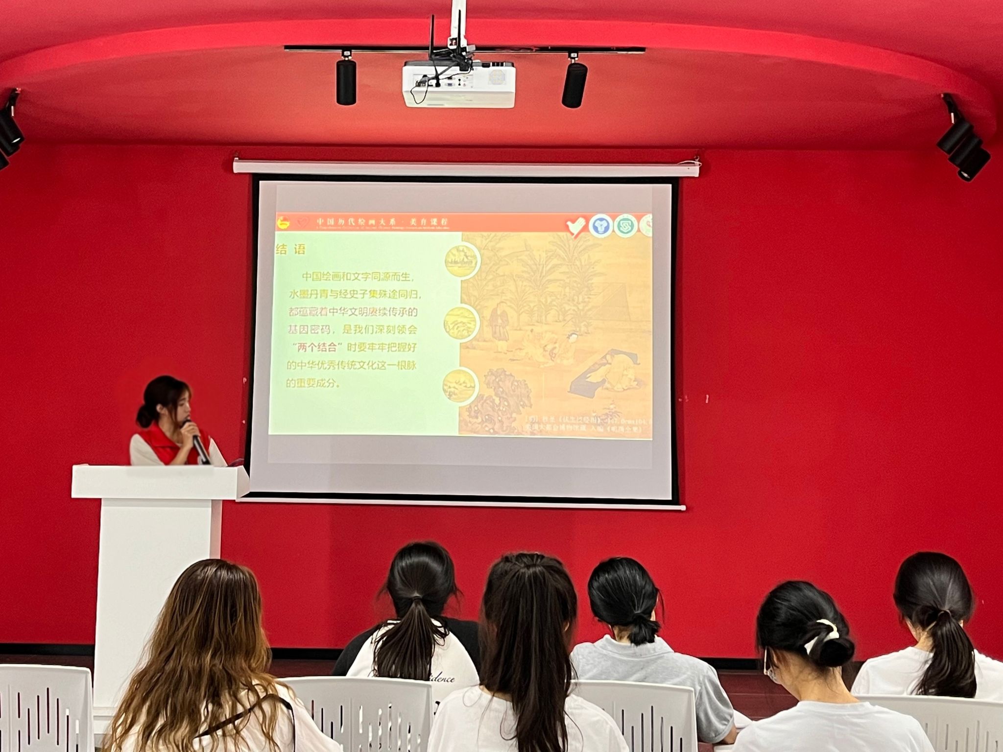 此次活动不仅是一次视觉的盛宴,更是一次心灵的洗礼,志愿者龚许琴担任宣讲员,她用自己的语言,围绕中华文明突出特点的绘画表达所具有的五大性:连续性、创新性、统一性、包容性、和平性,讲述中国绘画和书法之间密不可分的关系。中国绘画和文字同源而生,水墨丹青与经史子集殊途同归,都蕴藏着中华文明赓续传承的基因密码。华夏文明之璀璨,绘画艺术以独特笔触勾勒其精髓,是《宋画全集》展现历史之悠长,《无准师范像》冲破传统束缚,《便桥会盟图》彰显民族团结统一,《树下说法图》蕴含求同存异之智,《瑞鹤图》奏响和谐之音。