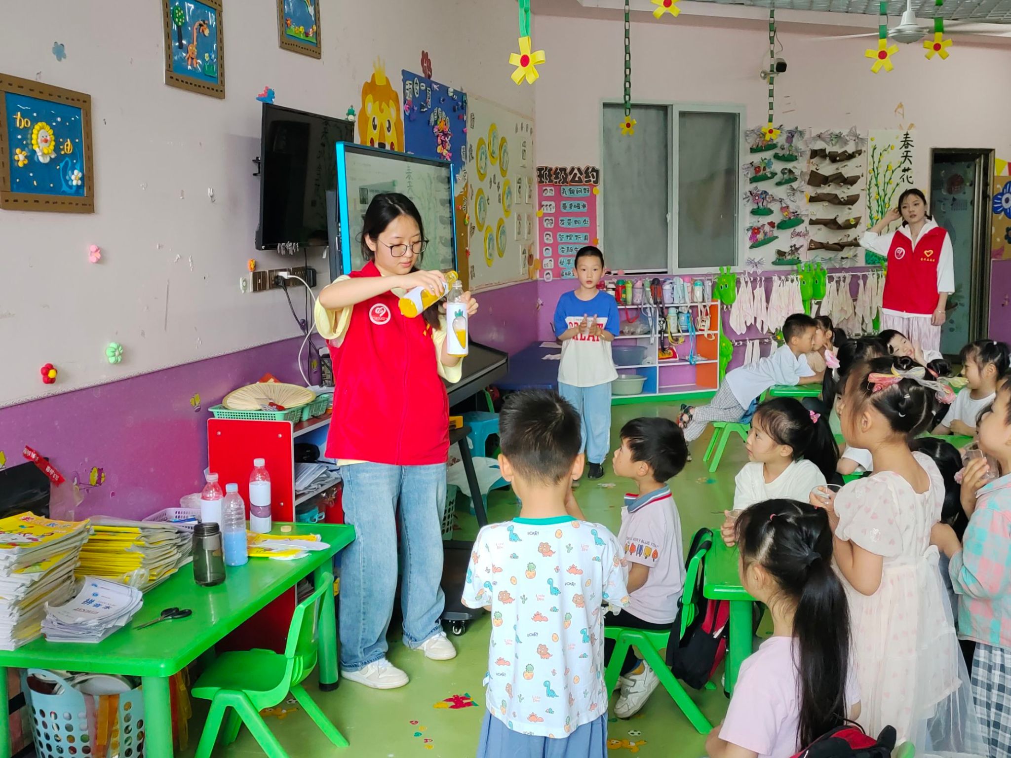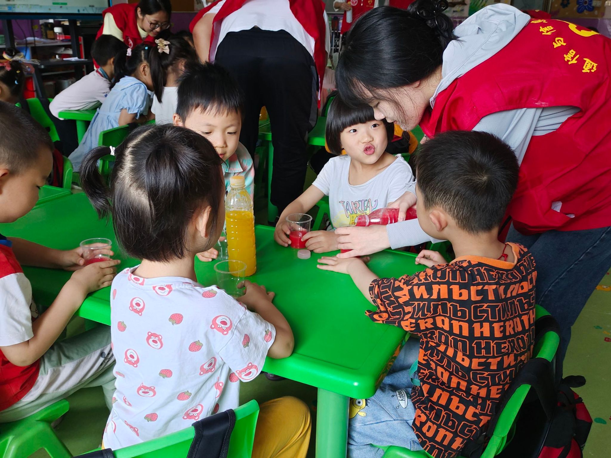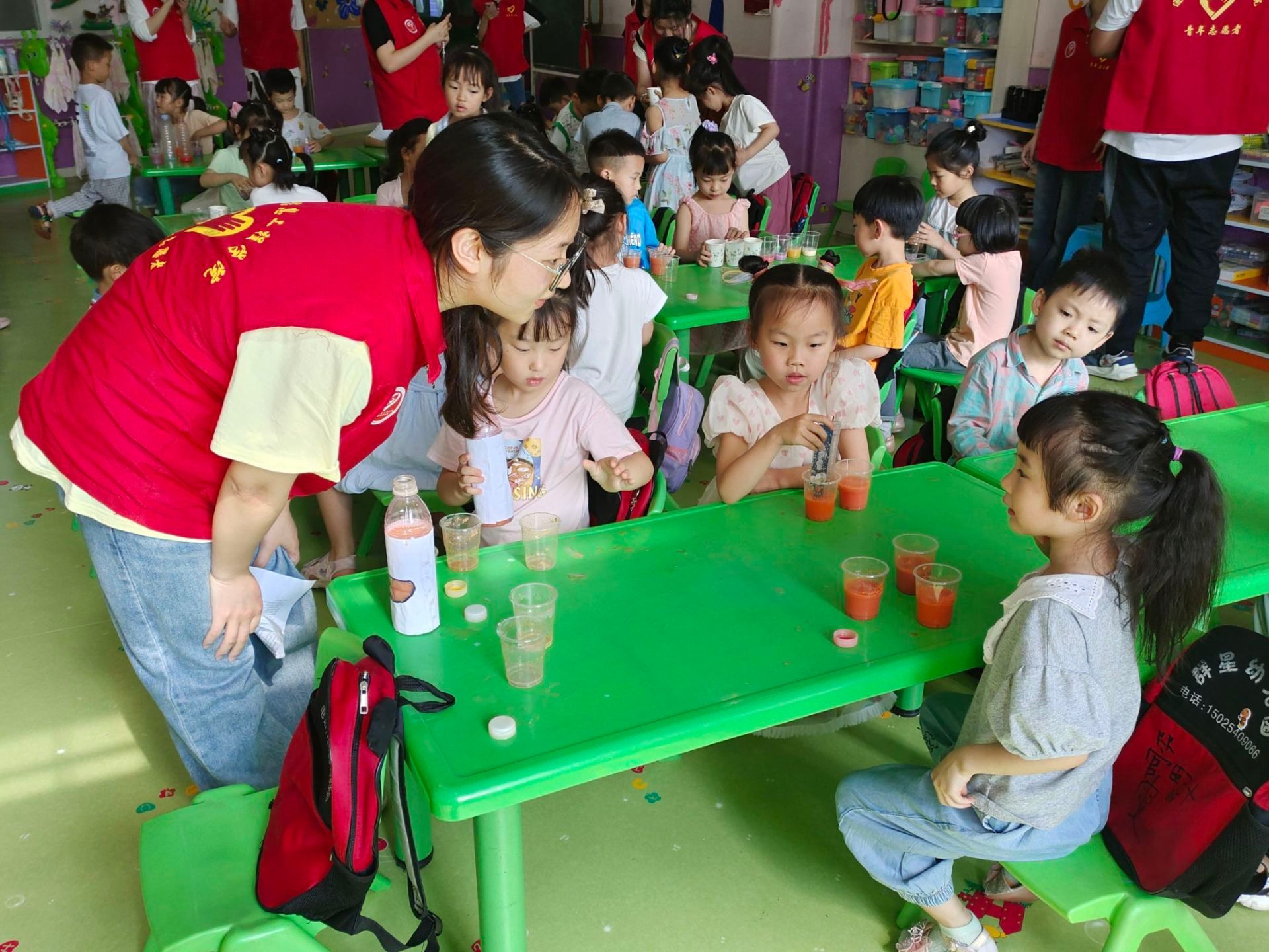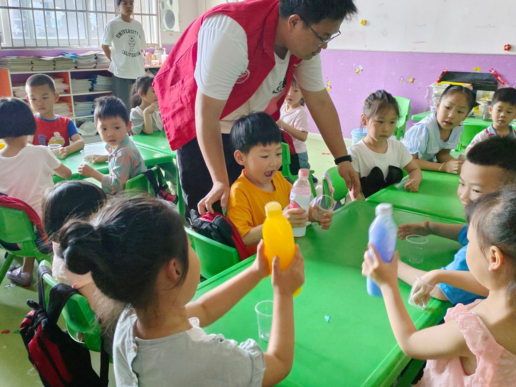 紧接着,志愿者们为孩子们上演了一幕幕精彩的实验。他们运用透明的杯子和装满清水的瓶子,通过简单的操作,使原本无色的水瞬间变成了红色、黄色和蓝色。孩子们被这些神奇的变化深深吸引,纷纷发出惊叹与好奇的声音。