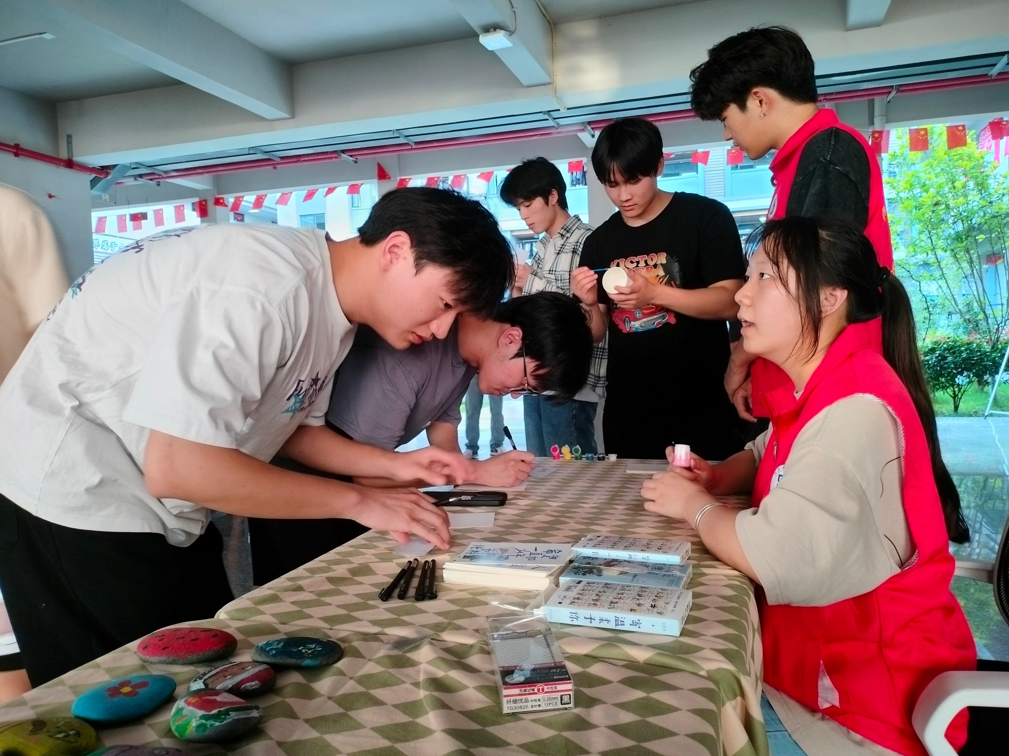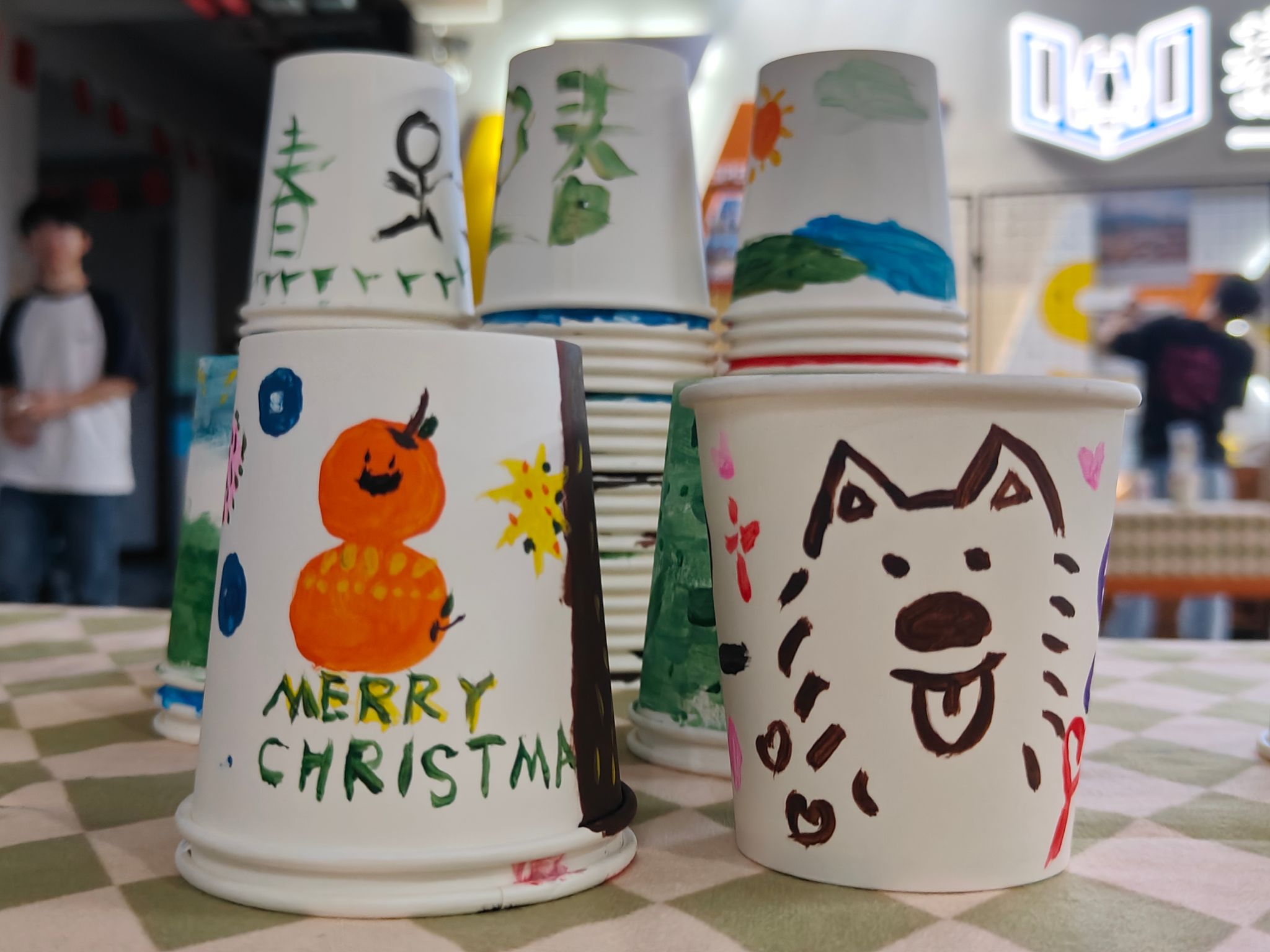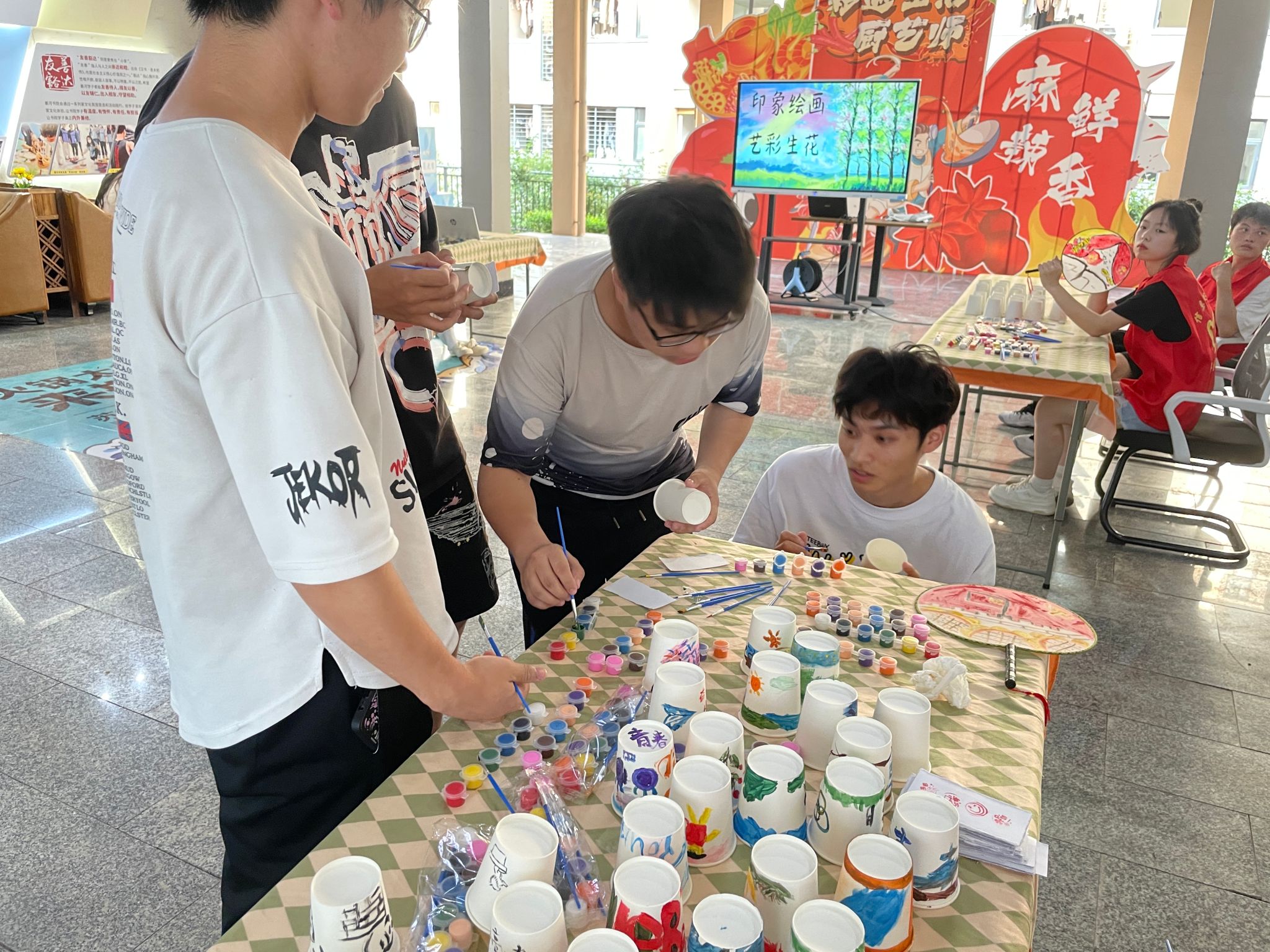 在志愿者的引导下,107名参与者每个人领一个纸杯,以“青春”为灵魂,以画笔为翅膀,将纸杯赋予了非凡的生命。他们挥毫泼墨,将青春的热烈与活力跃然纸上,仿佛一团团燃烧的火焰,照亮了周围的世界。或轻轻描绘,将青春的期待与怀念融入其中,每一笔、每一划都饱含着深深的情感与回忆。
