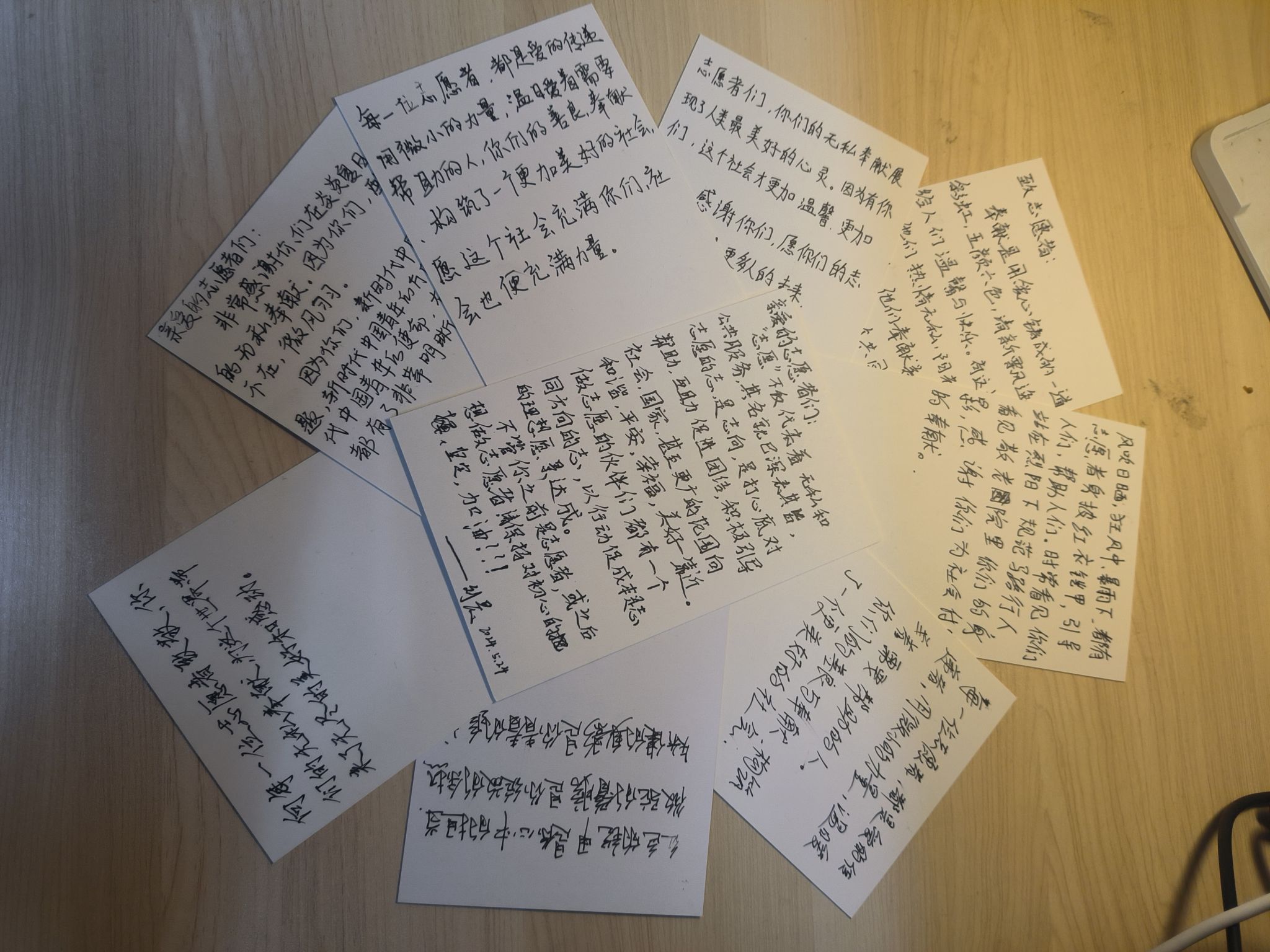 感恩如潮,笔墨传情。志愿者向每位参与者分发明信片,鼓励大家在明信片上写下想对志愿者说的话语。参与者的思绪似乎穿越了时光的隧道,回想起了日常生活中志愿者默默付出的身影。参与者带着温暖的微笑,开始在明信片上轻轻挥洒笔墨,笔下流淌出对志愿者的真诚祝福,每一个字、每一个词都充满了对志愿者辛勤付出的认可与感激。这些明信片仿佛成为了一座座桥梁,连接着同学们与志愿者的心灵,让彼此的情感得以传递与交融。志愿者的辛勤付出得到了同学们的真挚回应,他们的心灵得到了深深的慰藉与满足。